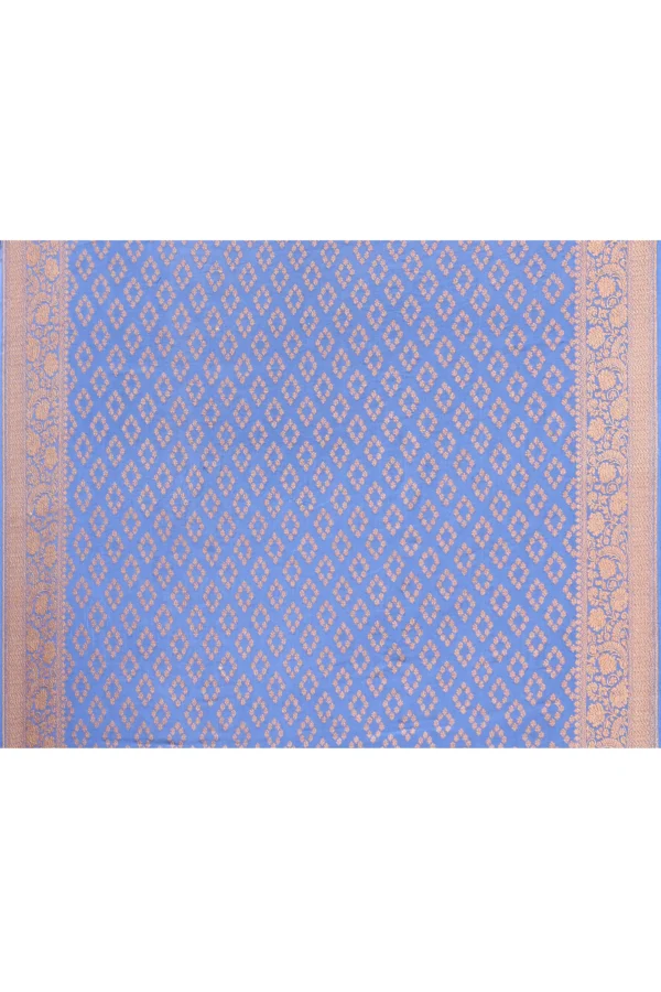 Introducing a refined dusky blue pure Banarasi crepe chiffon silk saree, handwoven with delicate floral and paisley motifs in antique gold zari across the body. Finished with a deep slate blue border and pallu featuring denser traditional ornamental zari work, it comes with a matching running blouse piece—perfect for elegant festive wear.