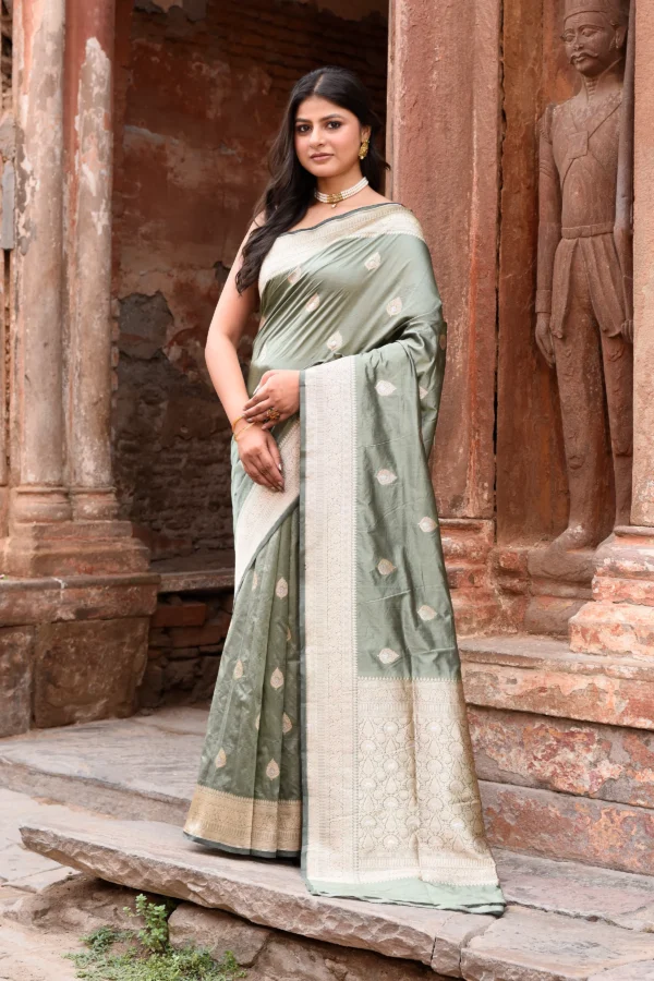 Style this serene dusky olive Banarasi Katan silk saree with antique gold, temple, or subtle polki jewelry to complement its earthy tone and intricate zari butti work. Pair with muted gold or bronze-toned heels or embroidered juttis, and finish with a structured clutch or traditional potli.
