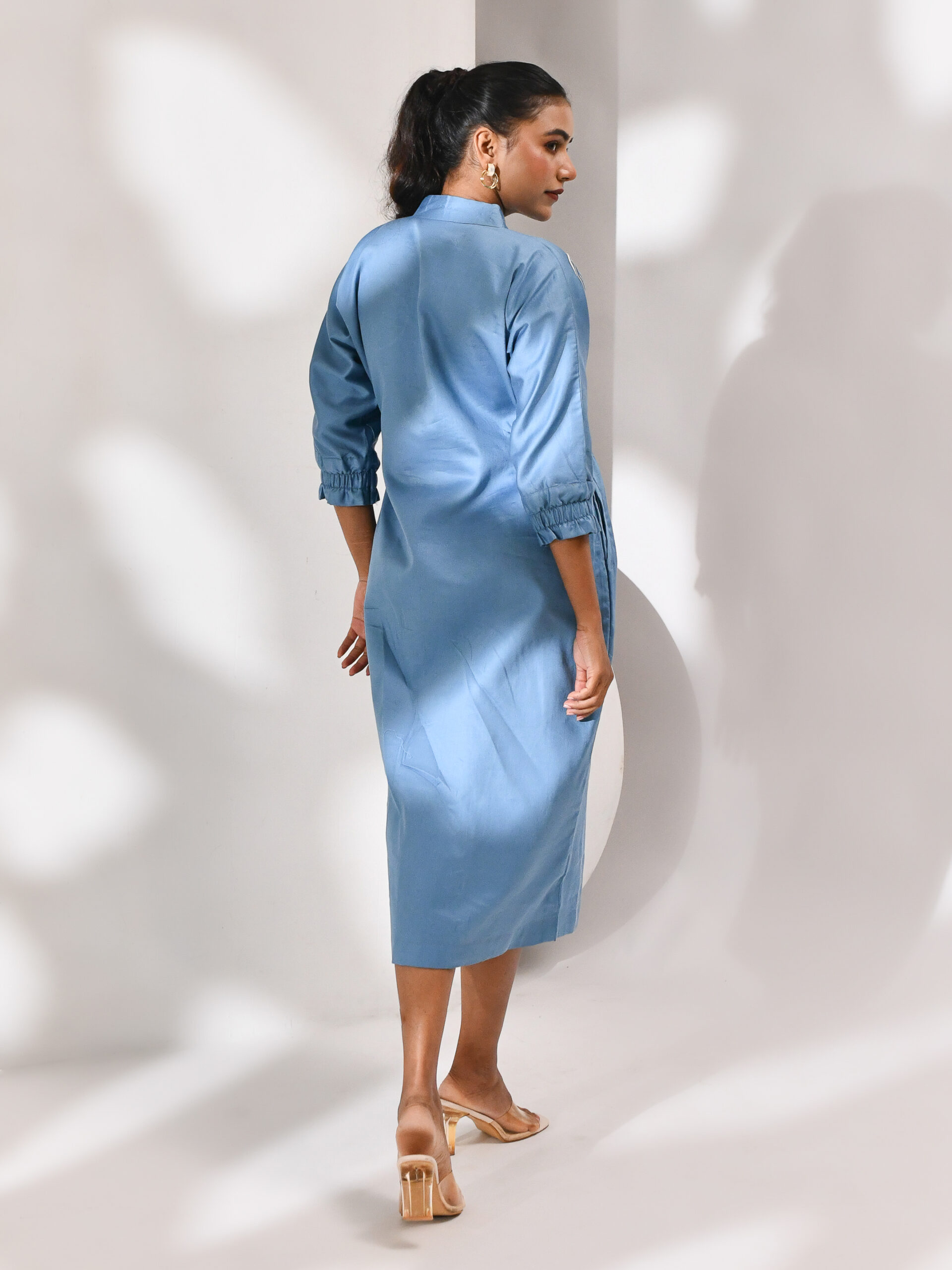 Dusty Blue Embroidered Cotton Dress With Elasticated Waist