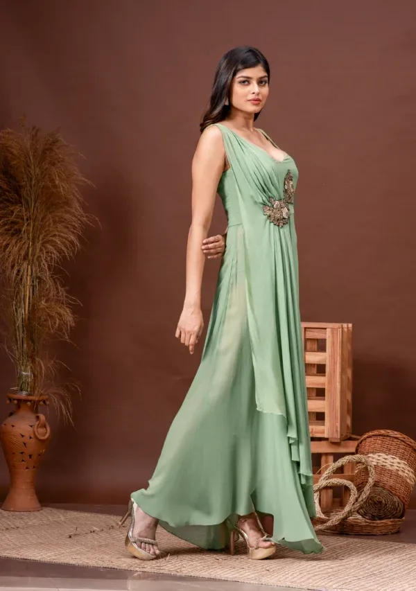 Introducing an ultra-chic dusty jade georgette dress featuring elegant drape detailing, beautifully adorned with intricate placement embroidery. This visually appealing design effortlessly combines sophistication and style.