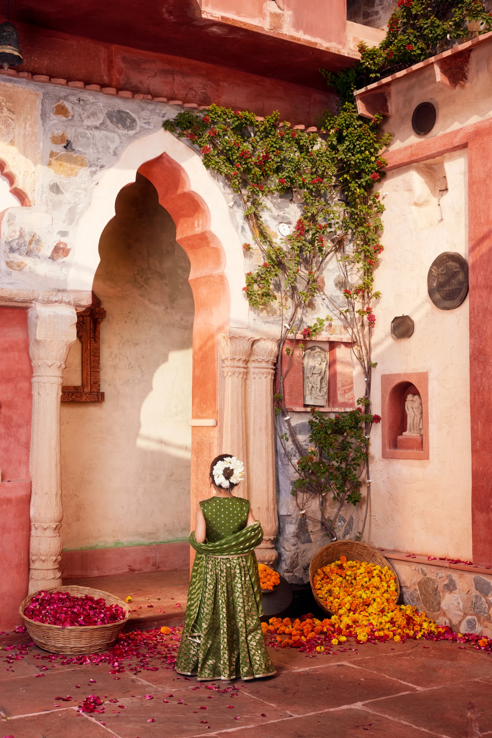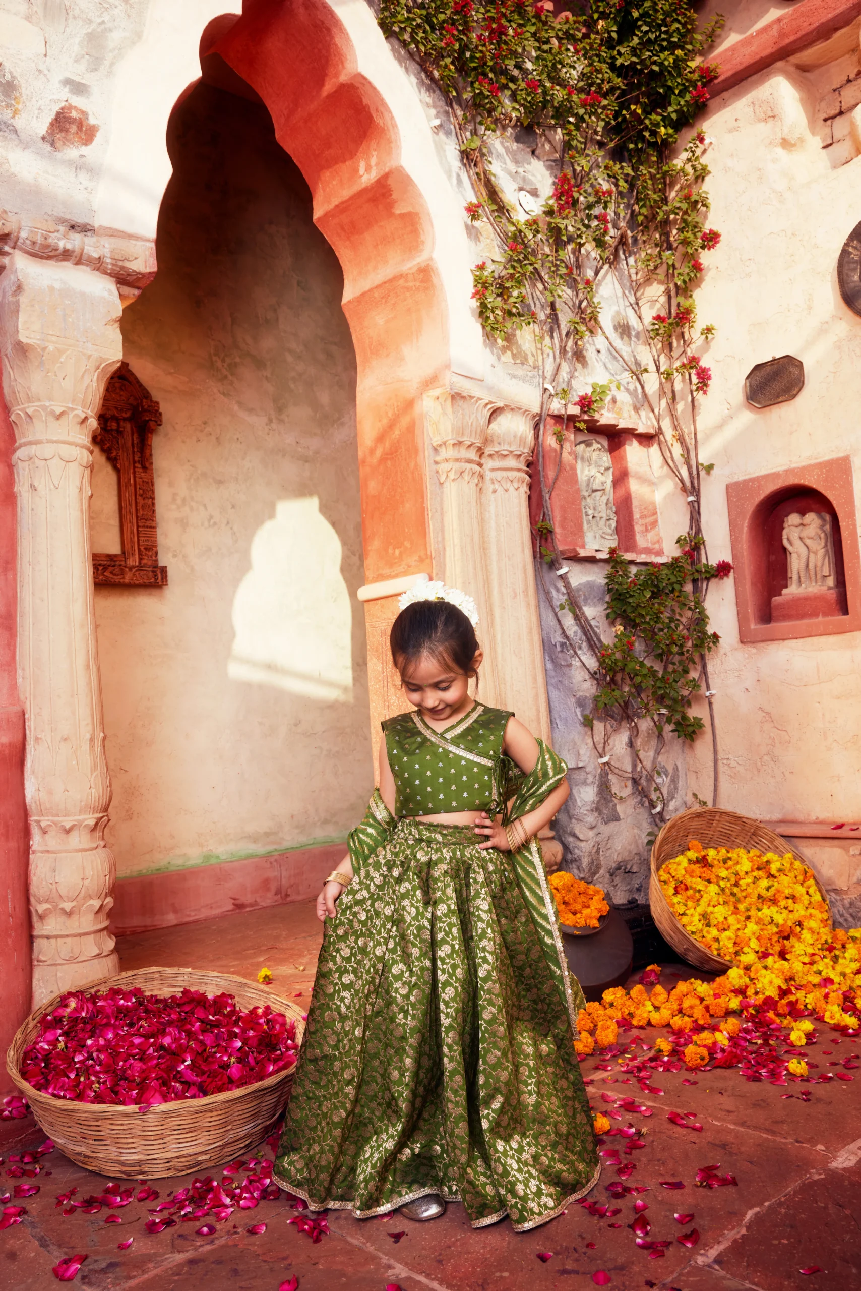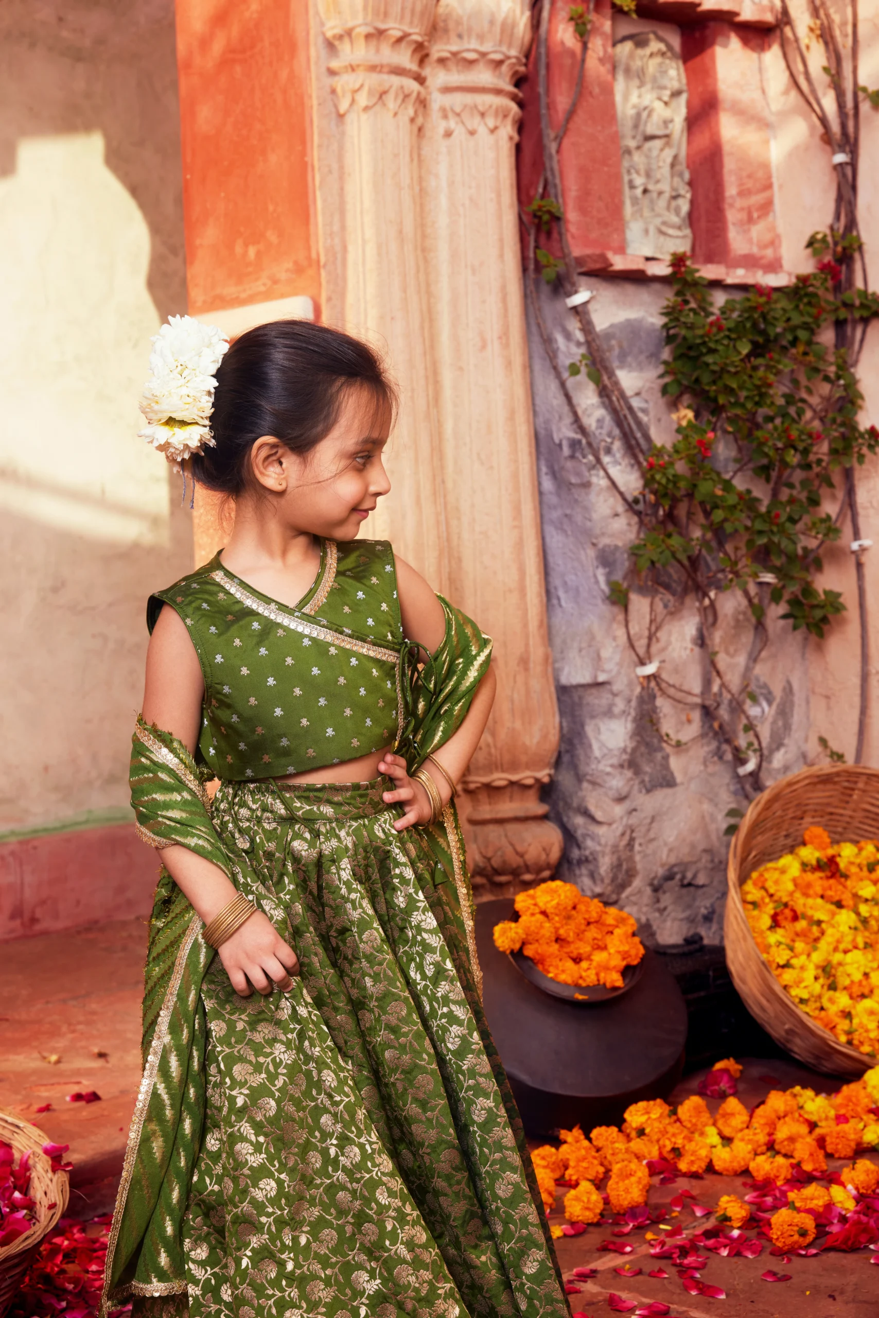 Style this regal Green Banarasi Silk Brocade Lehenga Set with traditional gold or kundan jewelry to highlight the richness of the brocade weave. Pair it with statement chandbalis or jhumkas, layered bangles, and embellished heels or juttis for a festive look.