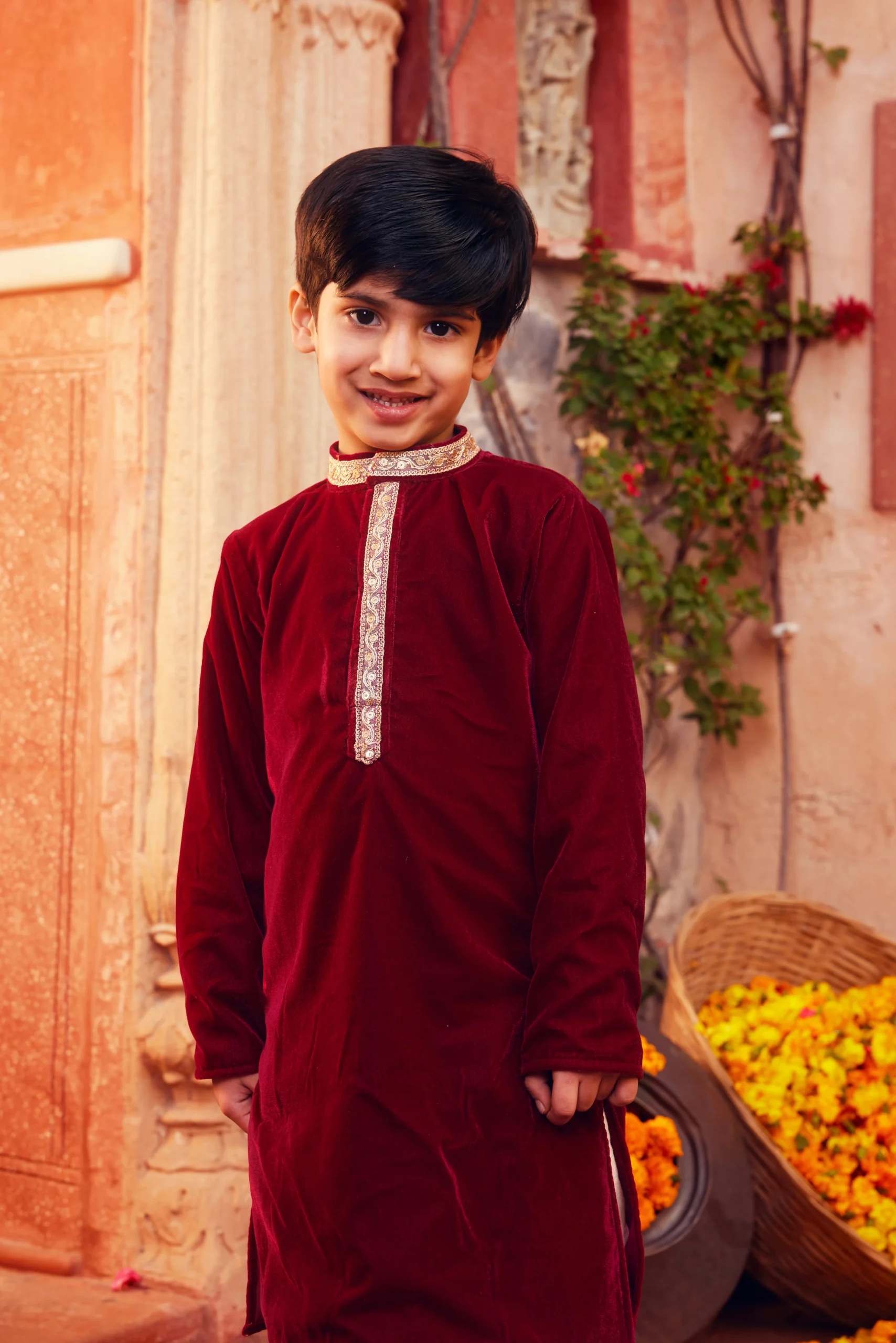 Style this elegant Maroon Velvet Kurta Set for Boys with classic mojaris or embroidered juttis to enhance its festive charm. Add a subtle brooch on the kurta for a touch of royal detail.