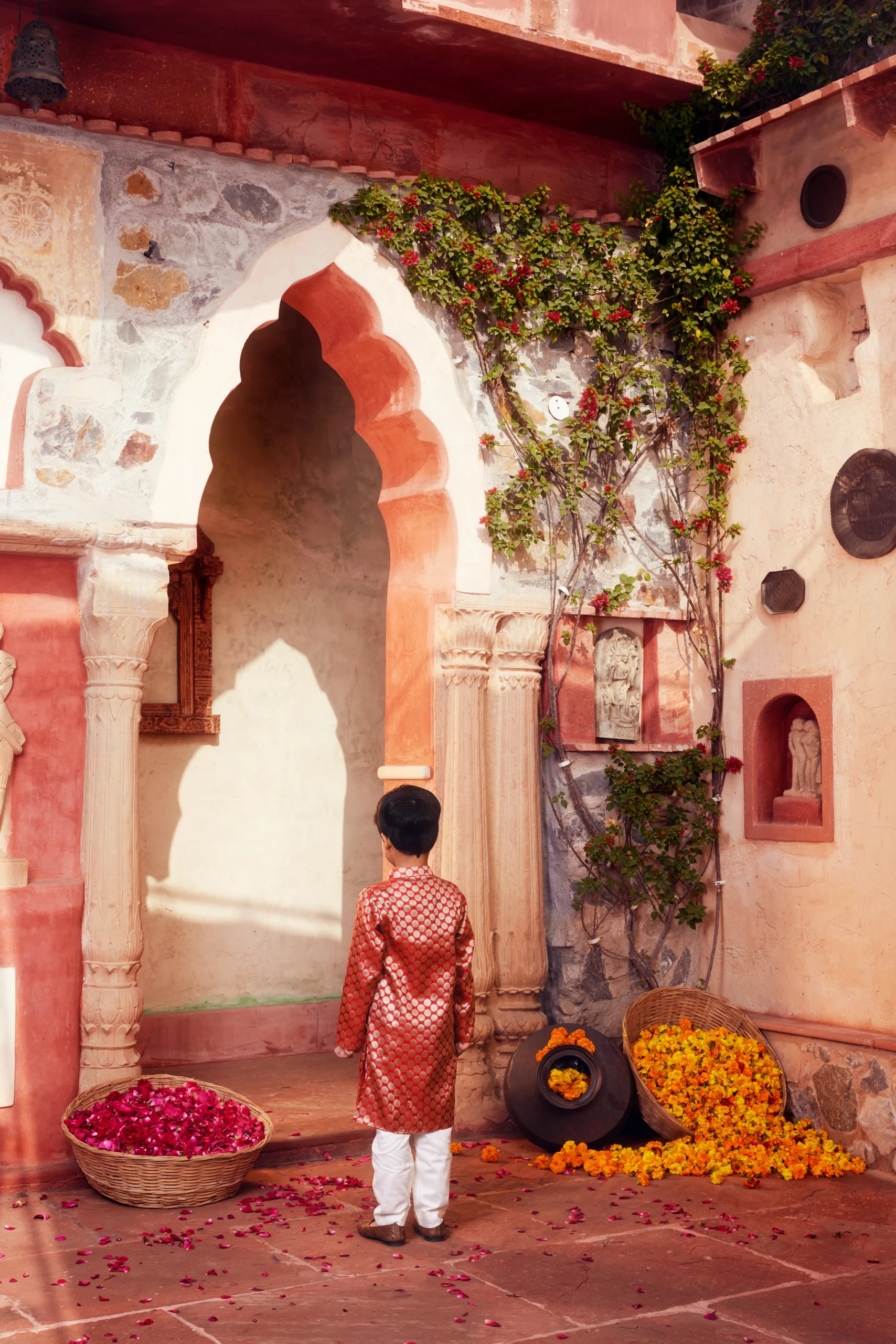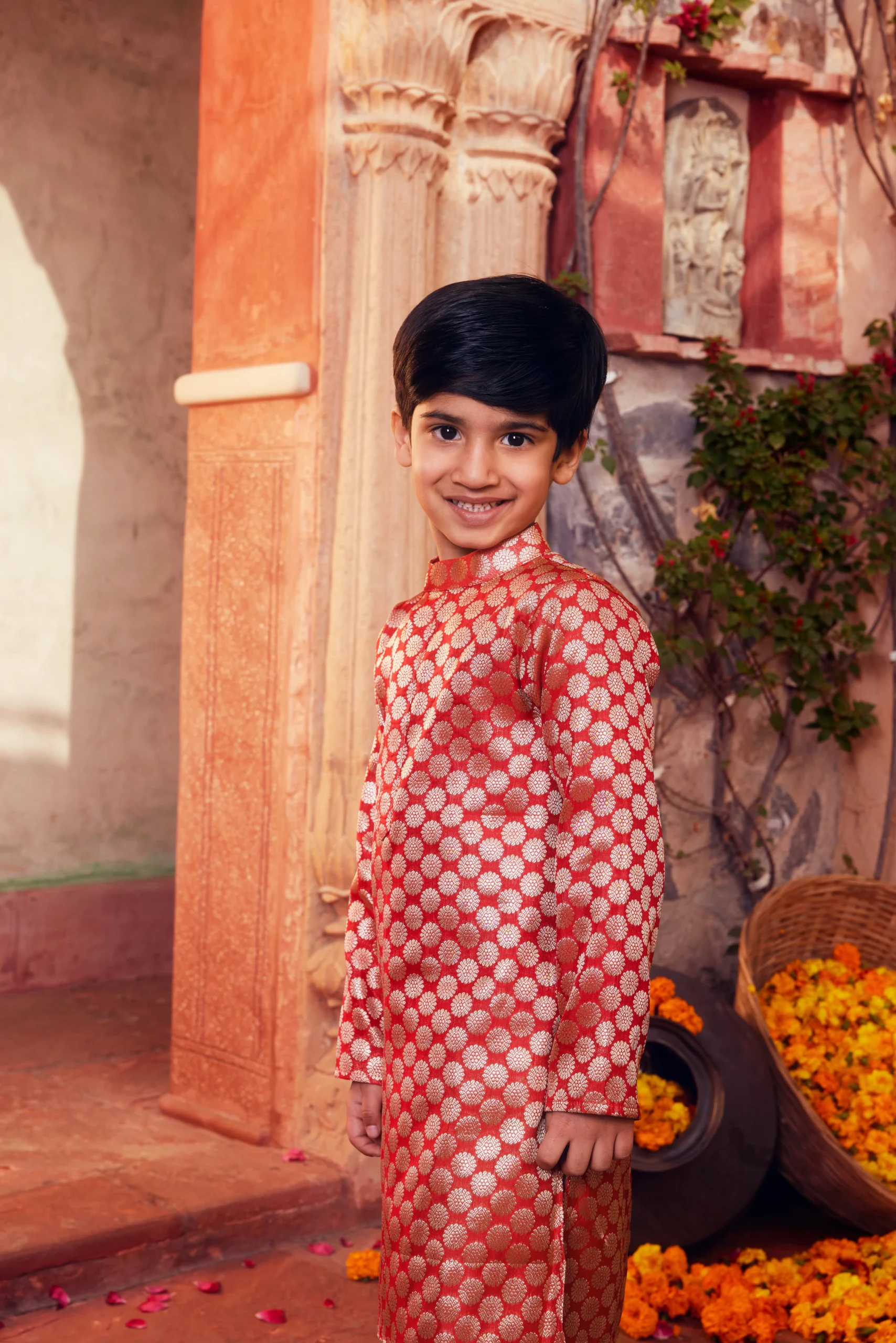 Style this charming Orange Banarasi Silk Kurta Pajama Set for Boys with classic mojaris or traditional juttis for a festive look. Add a subtle brooch or pocket square to the kurta for a refined touch. Keep the look neat with well-groomed hair and minimal accessories, allowing the rich Banarasi texture and vibrant color to stand out during weddings and celebrations.