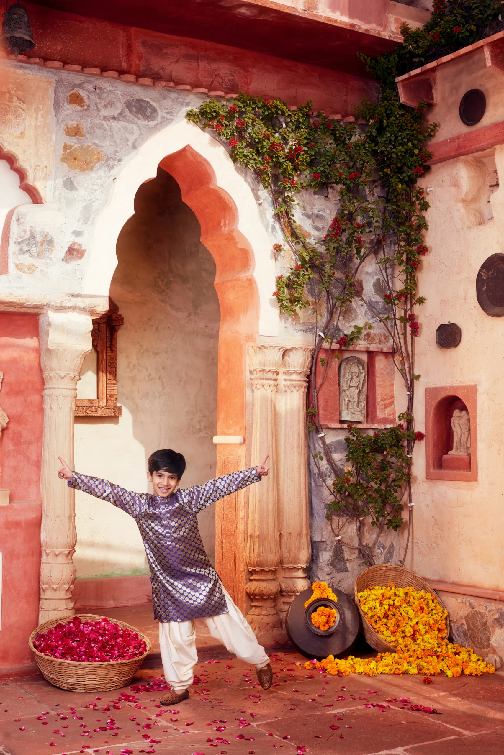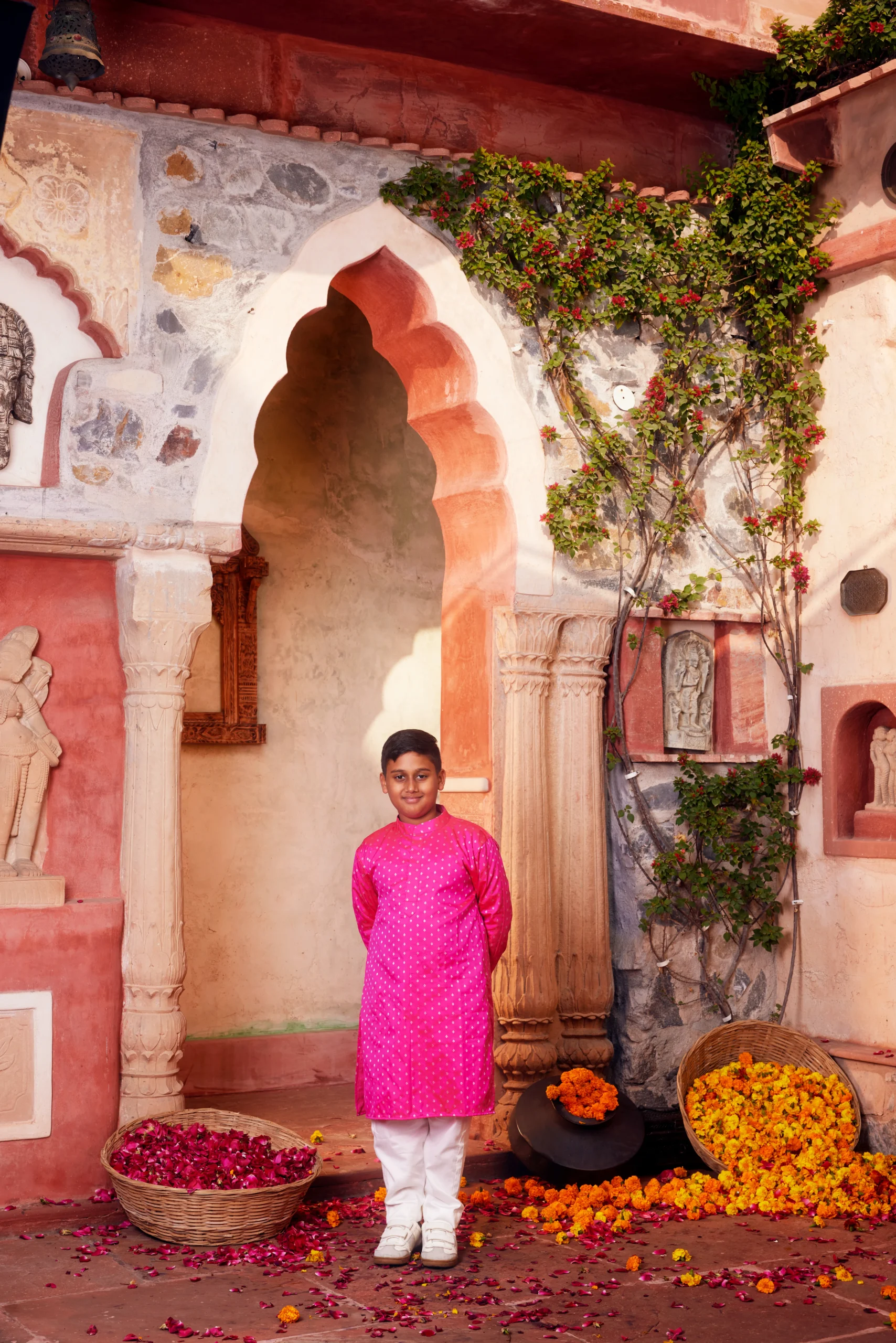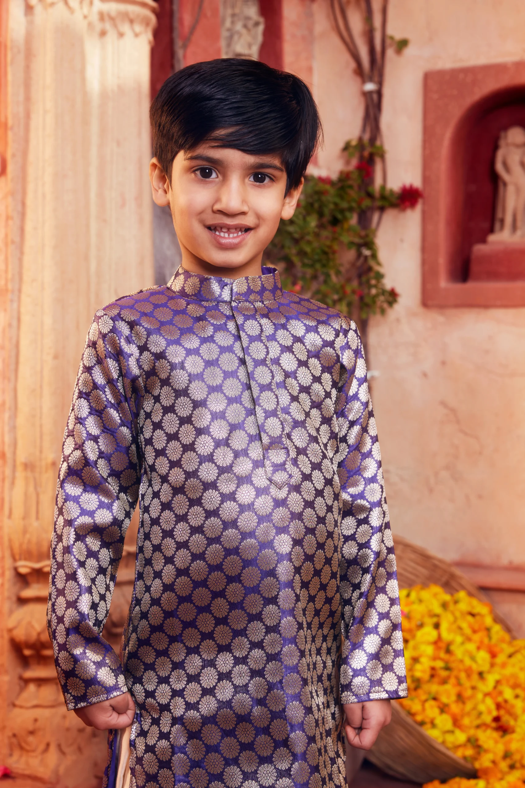 Style this elegant Purple Banarasi Silk Kurta Pajama Set for Boys with classic mojaris or traditional juttis to enhance its festive appeal. Add a subtle brooch on the kurta for a refined touch.