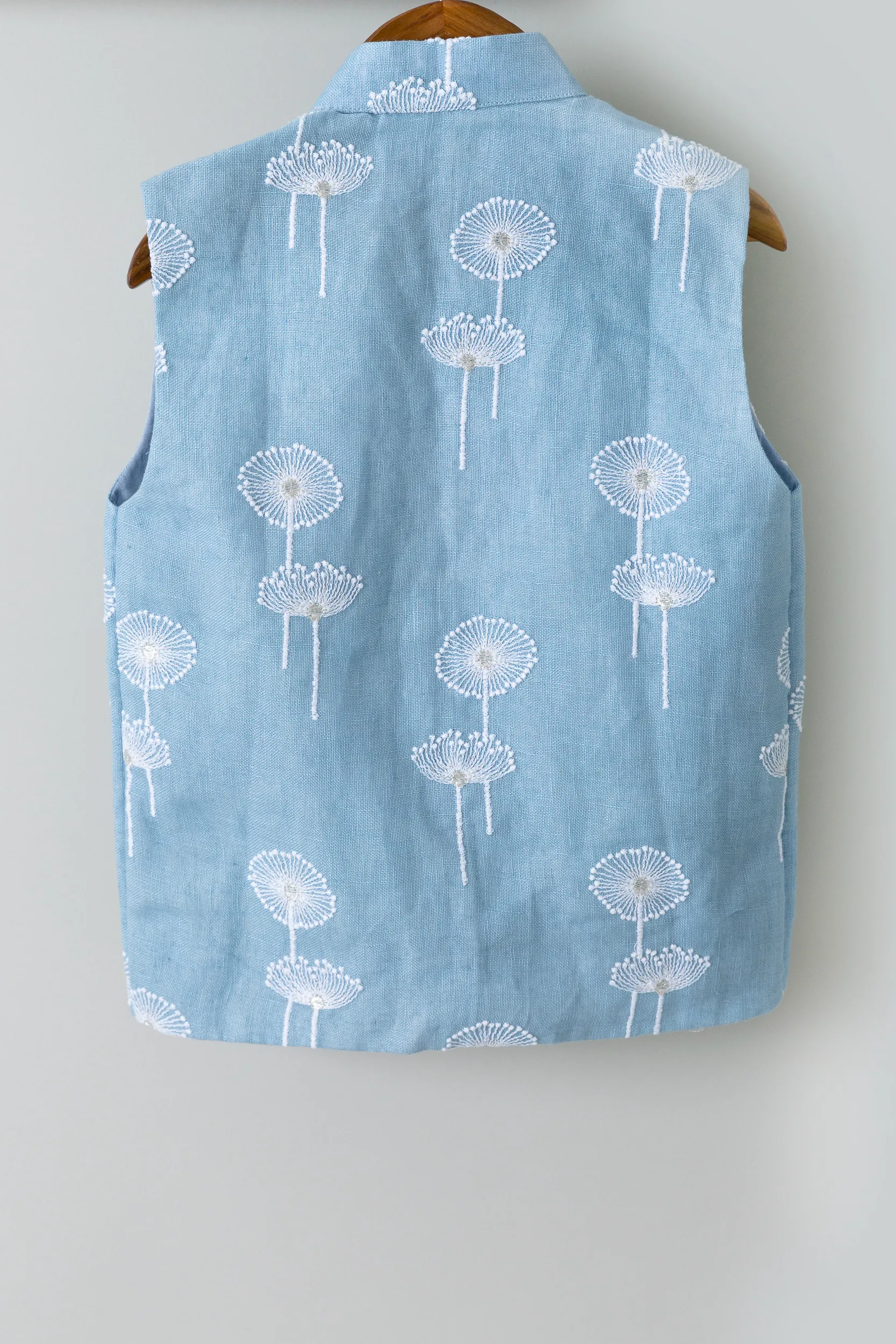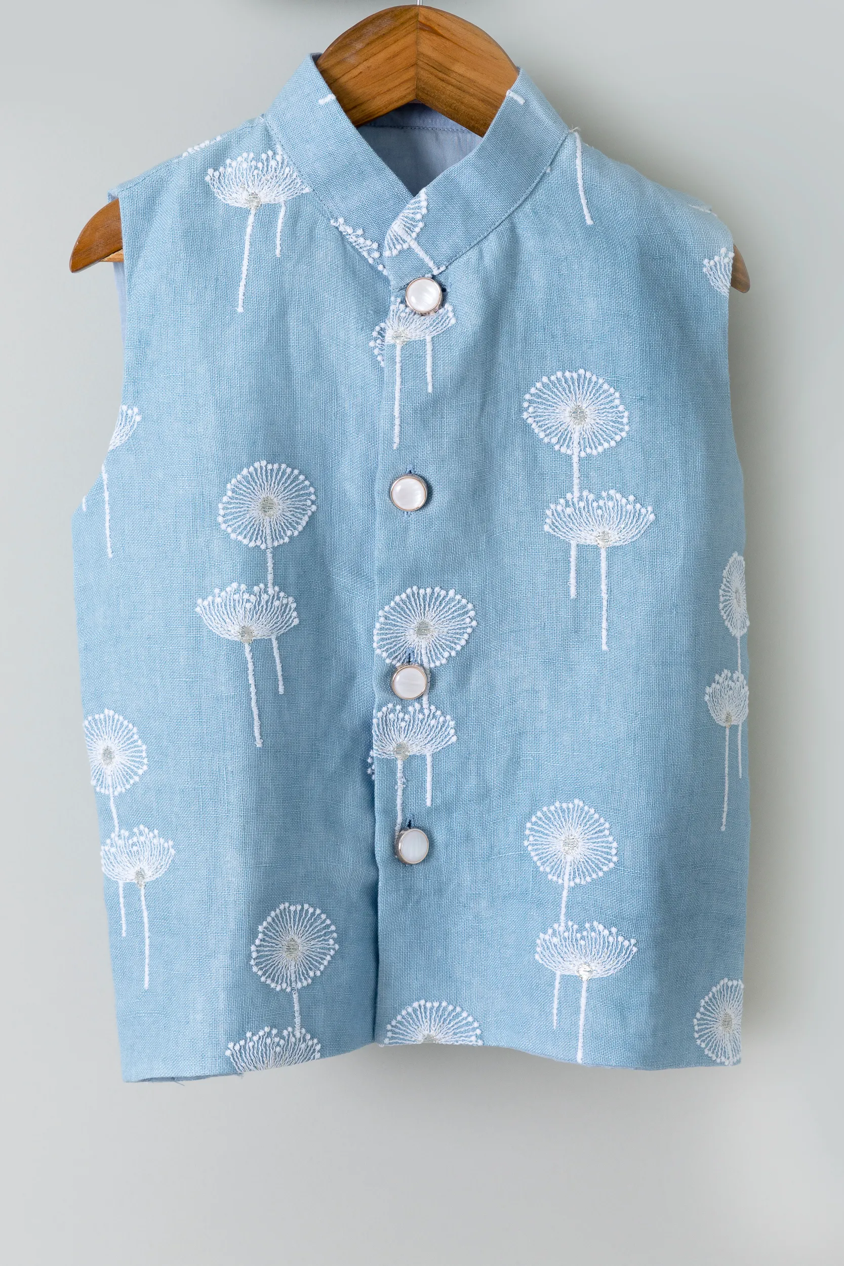 Embossed Cotton Kurta With Dandelion Embroided Linen Blue Jacket