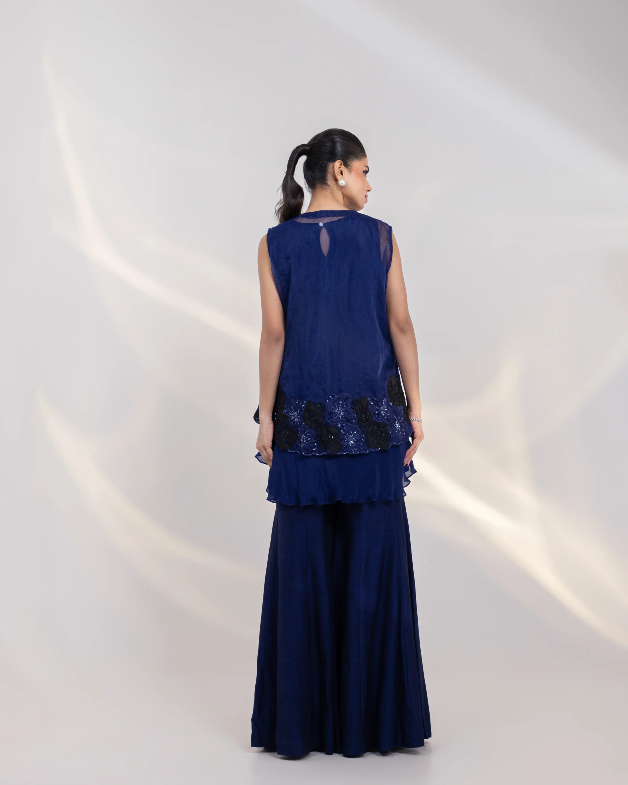 Introducing a refined three-piece set featuring a long flared top designed with an asymmetric waistline for a graceful, flowy silhouette. Paired with coordinated flared pants, the look is elevated by a sleeveless embroidered asymmetric jacket adorned with heavy black and blue floral applique, highlighted with sequins and bead detailing. A contemporary layered ensemble for festive and evening occasions.