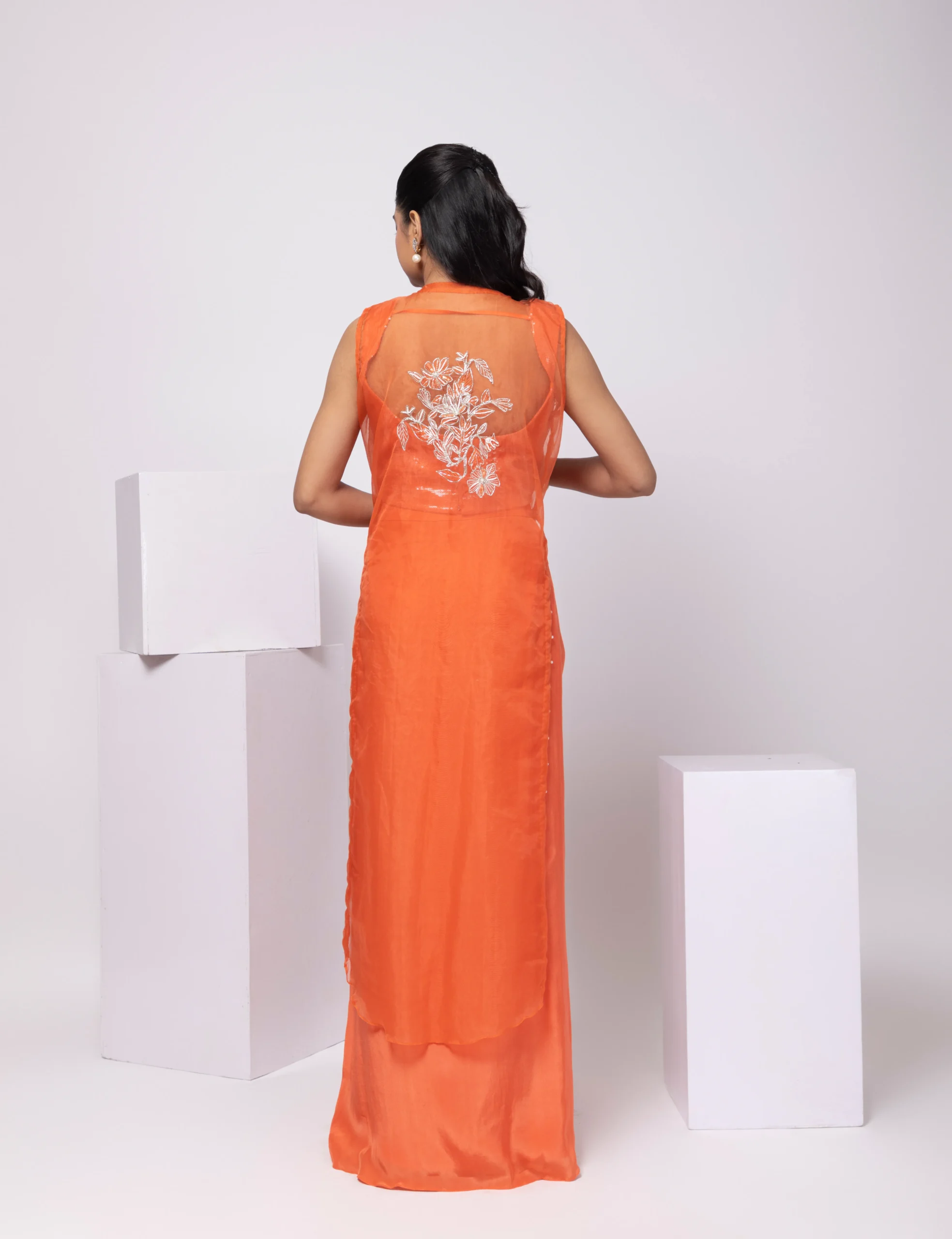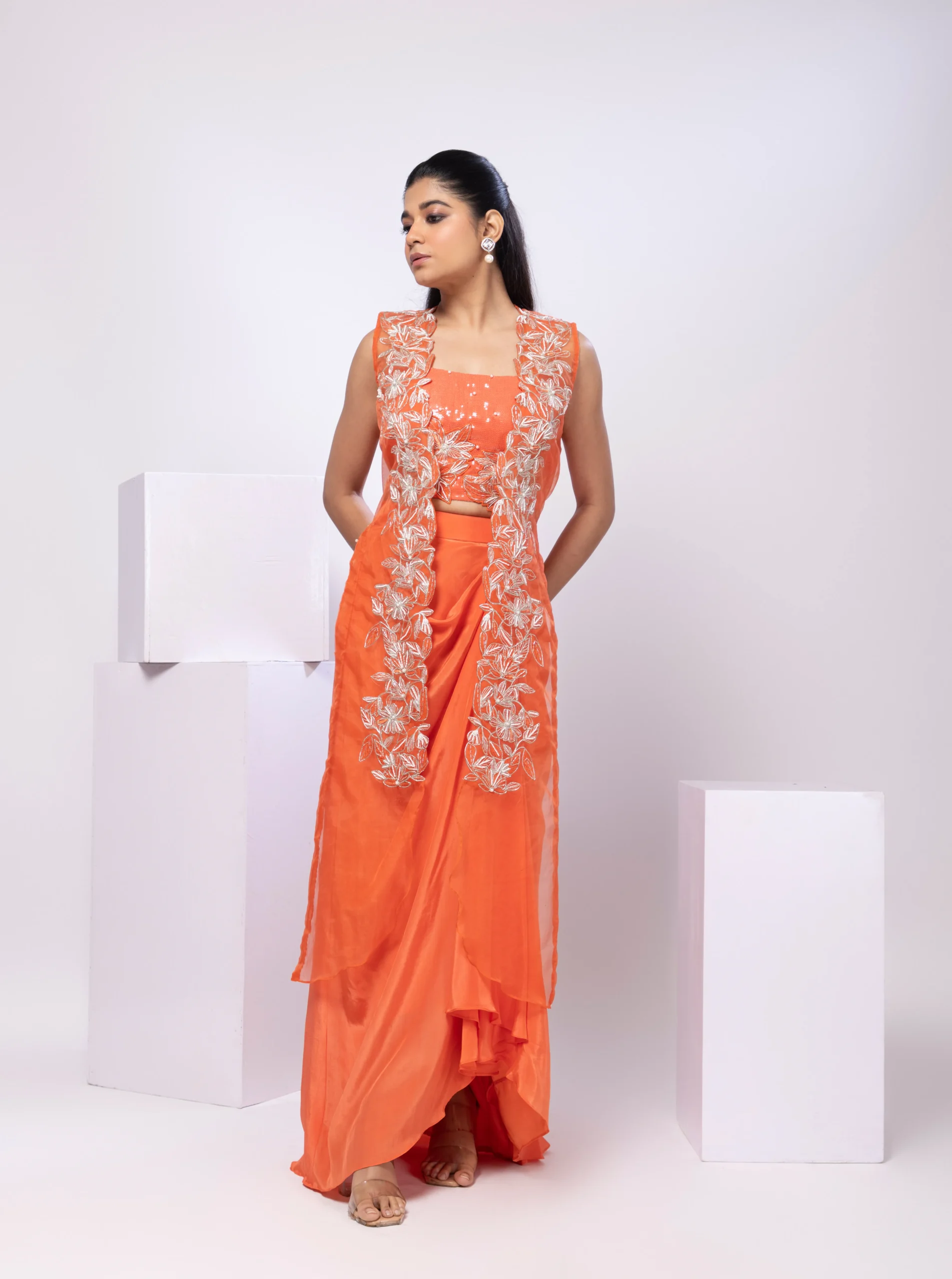 Introducing the Embroidered Long Jacket Set, a refined statement of contemporary elegance and festive glamour. The ensemble features a beautifully crafted long jacket adorned with intricate embroidery, layered over a shimmering sequinned blouse for radiant appeal. Paired with tailored Draped Skirt, this three-piece set balances structure and fluidity, perfect for weddings, receptions, and sophisticated soirees.
