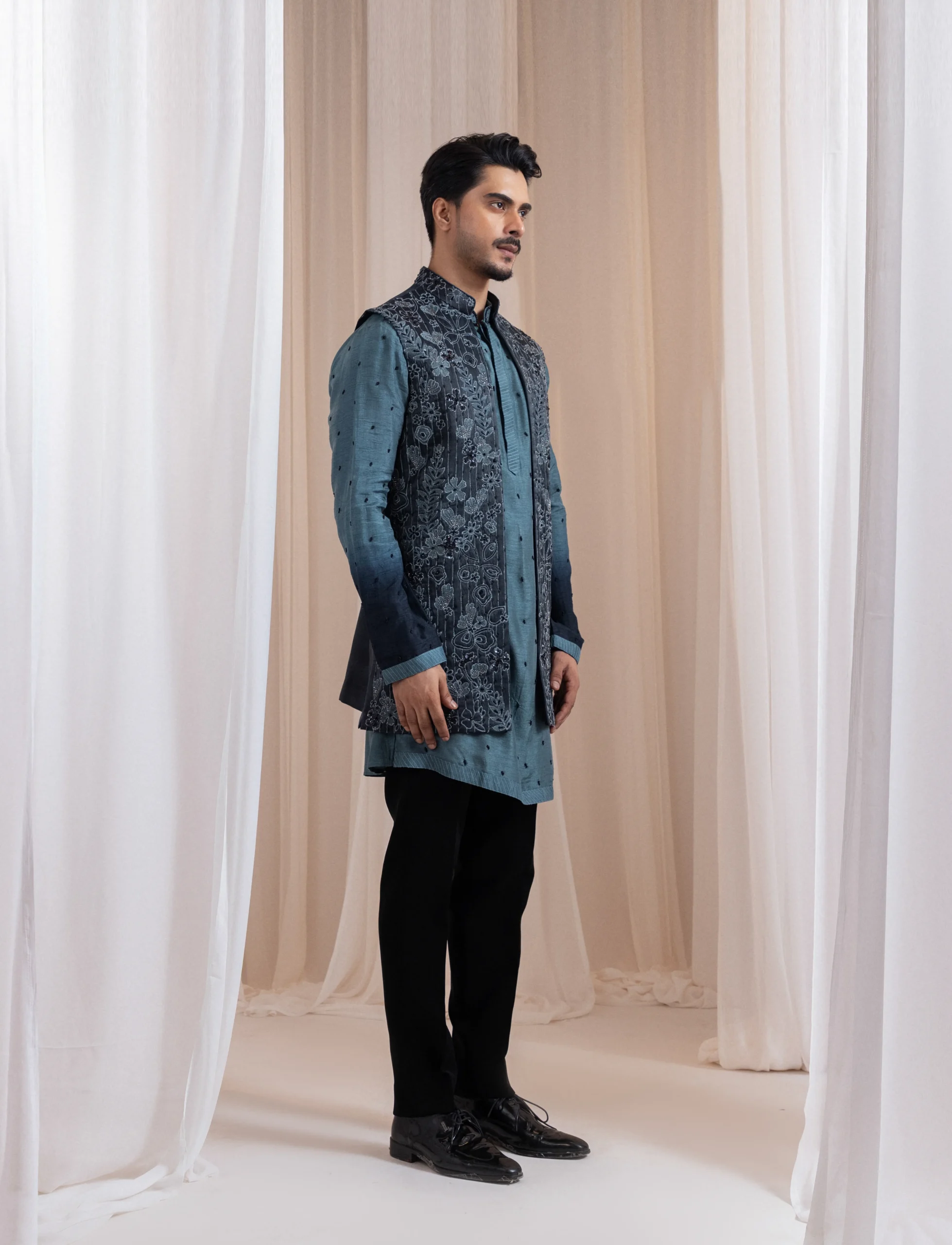 Deep Teal Floral & Vine Embroidered Nehru Jacket with Threadwork