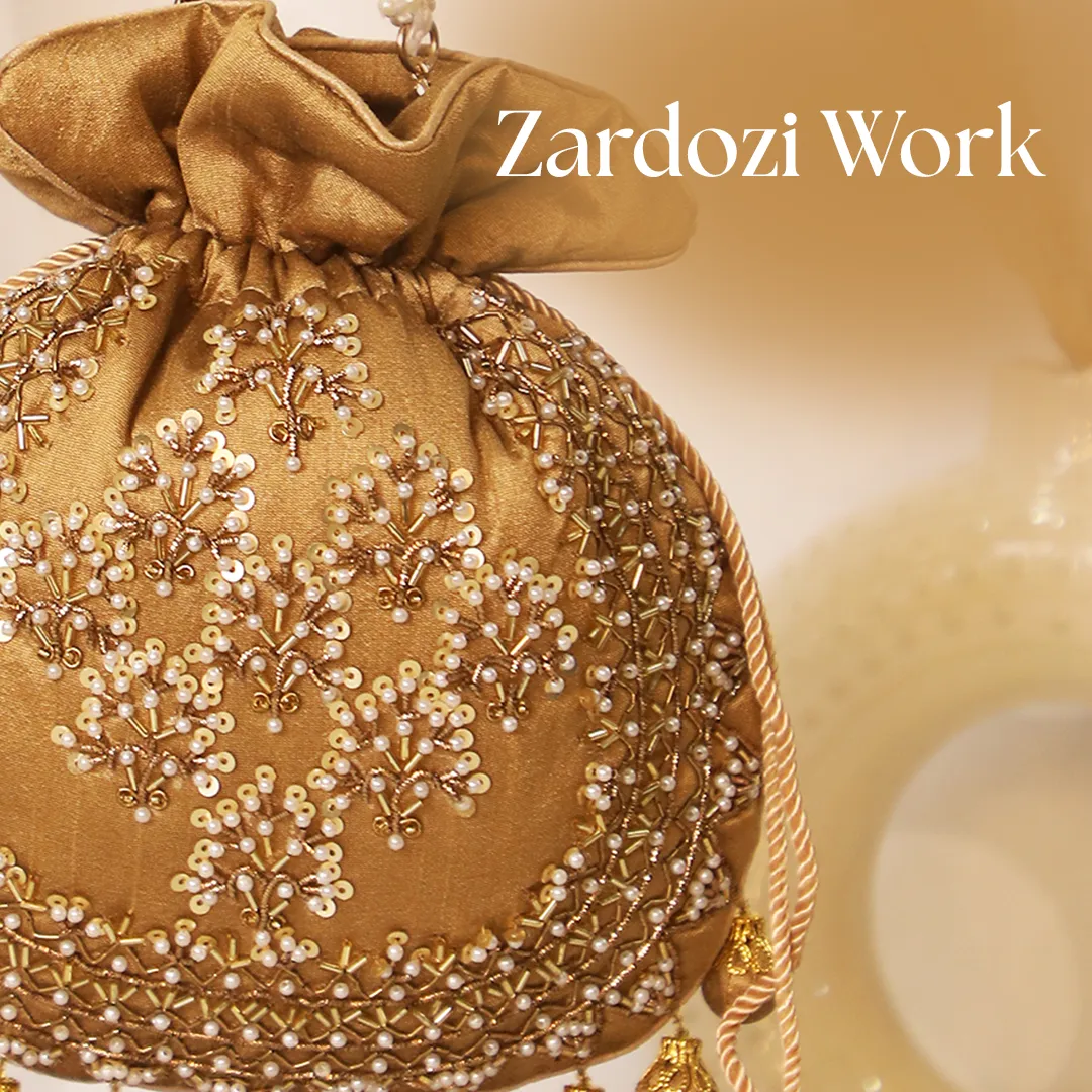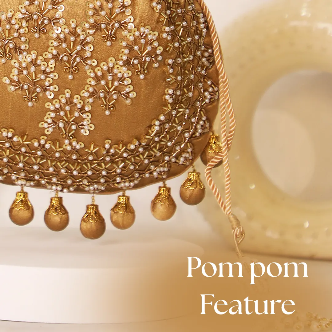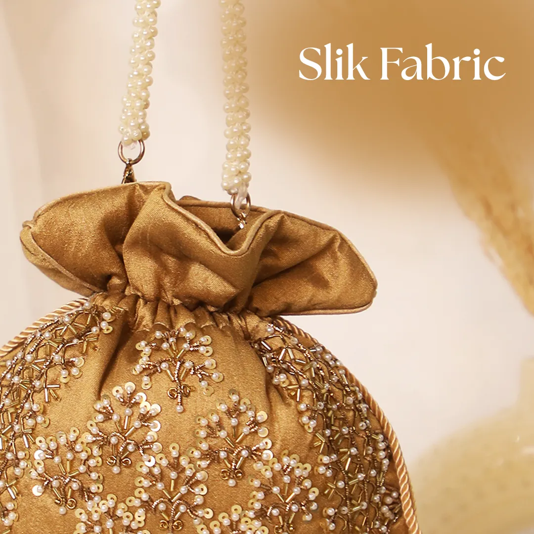 Pair this elegant potli with lehengas, sarees, shararas, or festive suits for weddings and celebrations. Its rich brown tone and pearl details complement gold and earthy outfits beautifully. Carry it as a handheld or shoulder accessory for a graceful ethnic look.