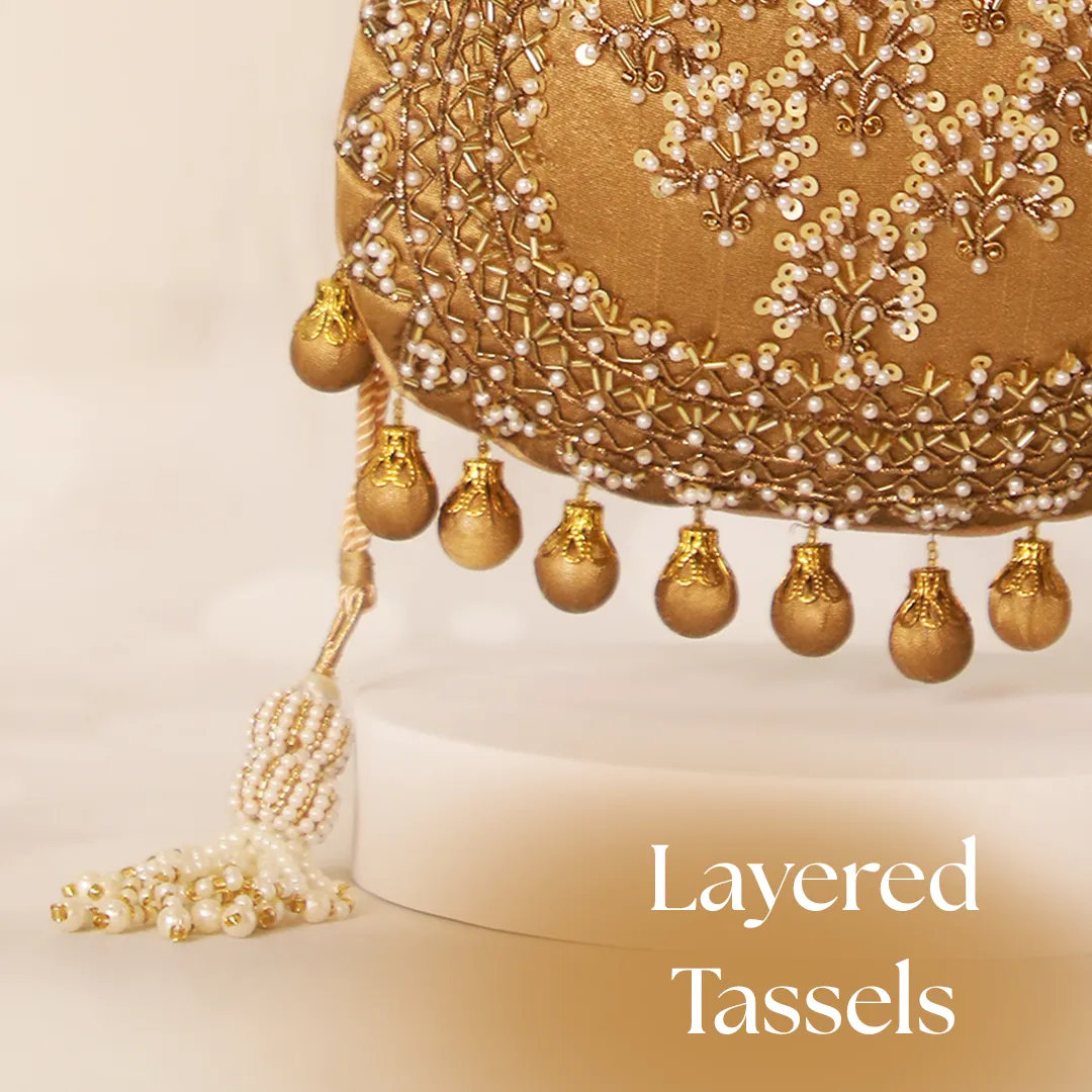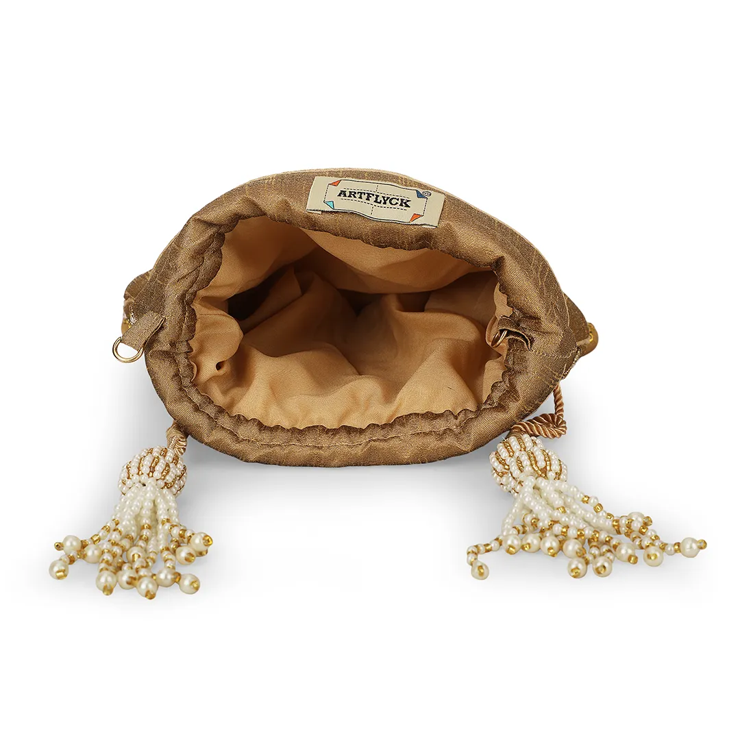 Embroidered Silk Potli Bag with Pearl Tassels – Brown