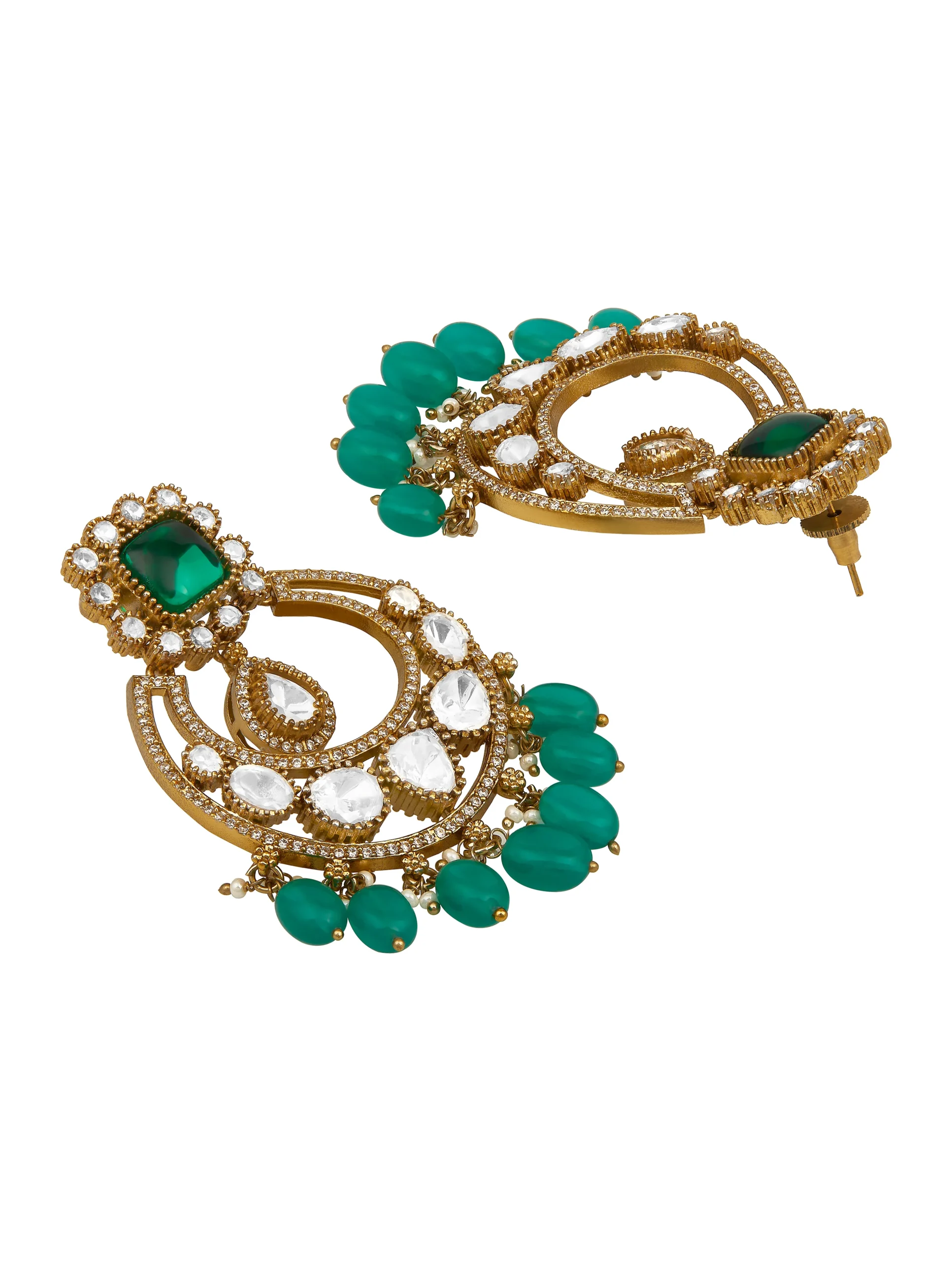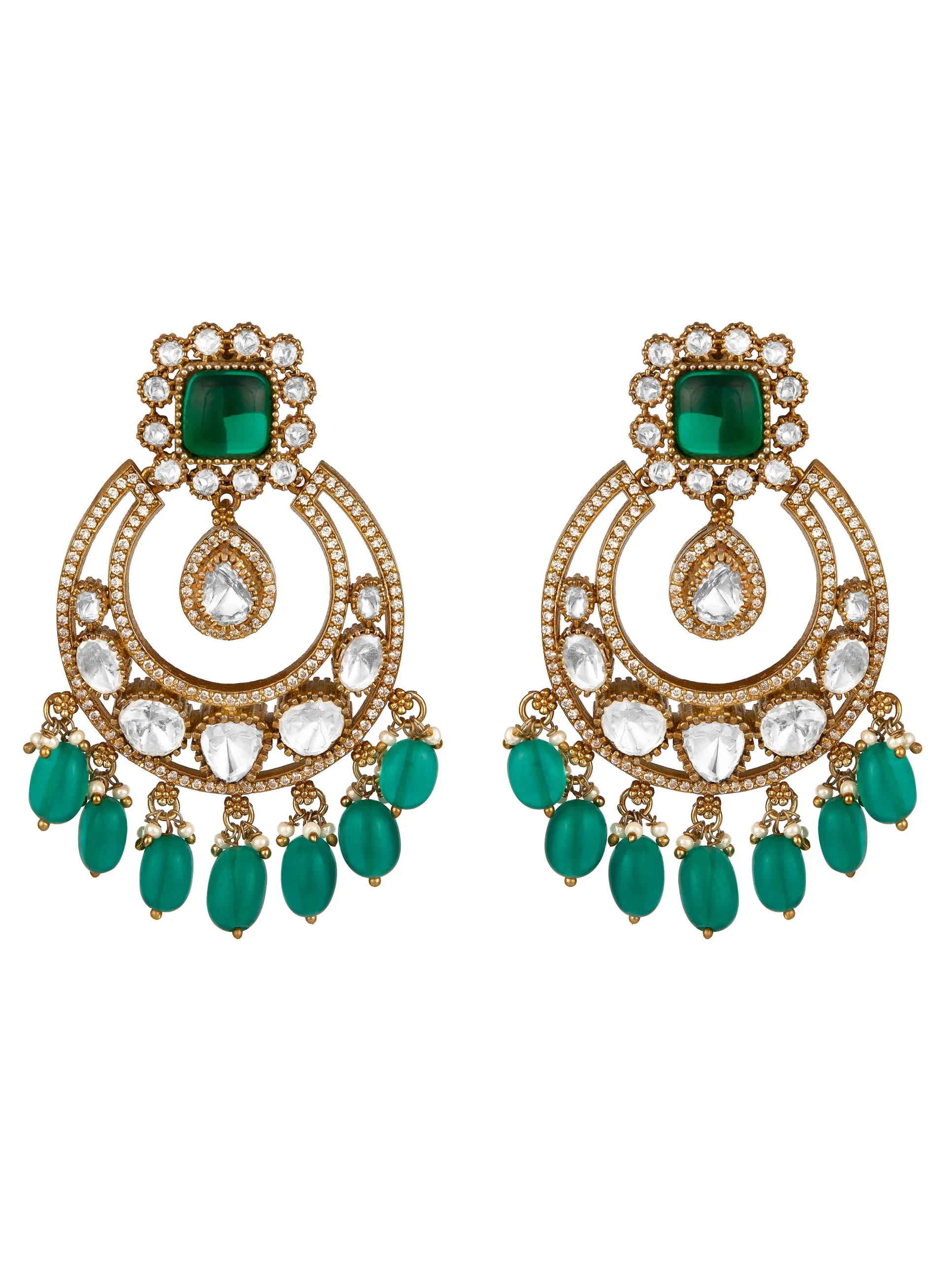 Introducing Emerald Doublet Kundan Polki Chandbali Earrings with Onyx Drops in Gold Polish, a statement piece crafted in micron gold polished brass. Adorned with sparkling moissanite kundan polki, zirconia highlights, and rich emerald doublet stones, the design is beautifully finished with elegant onyx tumble drops for a regal festive look.