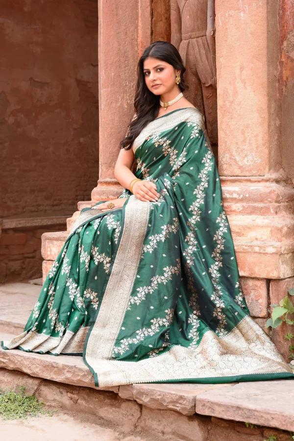 Emerald Green Banarasi Katan Silk Saree with Gold Zari Stripes & Floral Bels