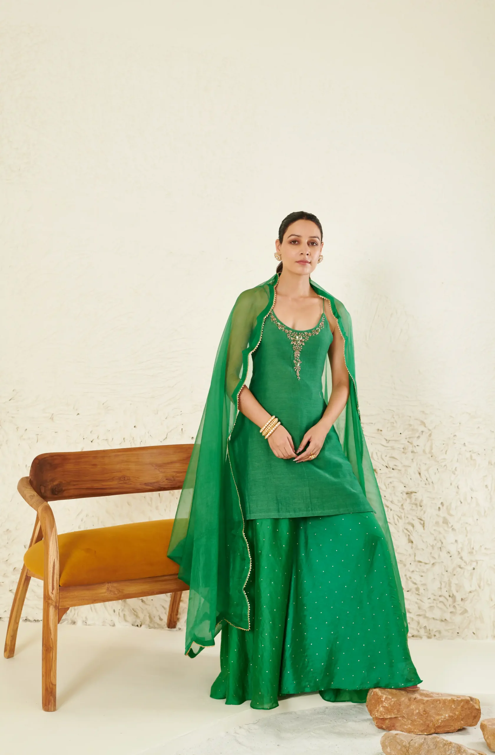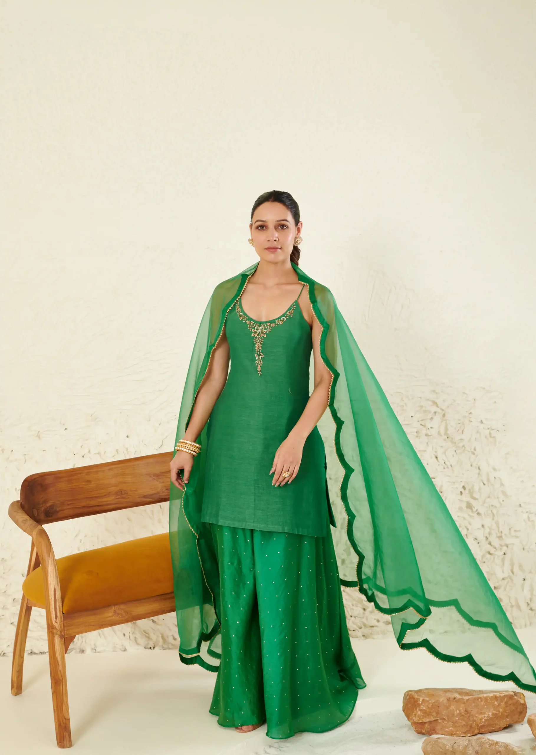Emerald Green Chanderi Spaghetti Kurta with Mukesh Garara & Organza Dupatta