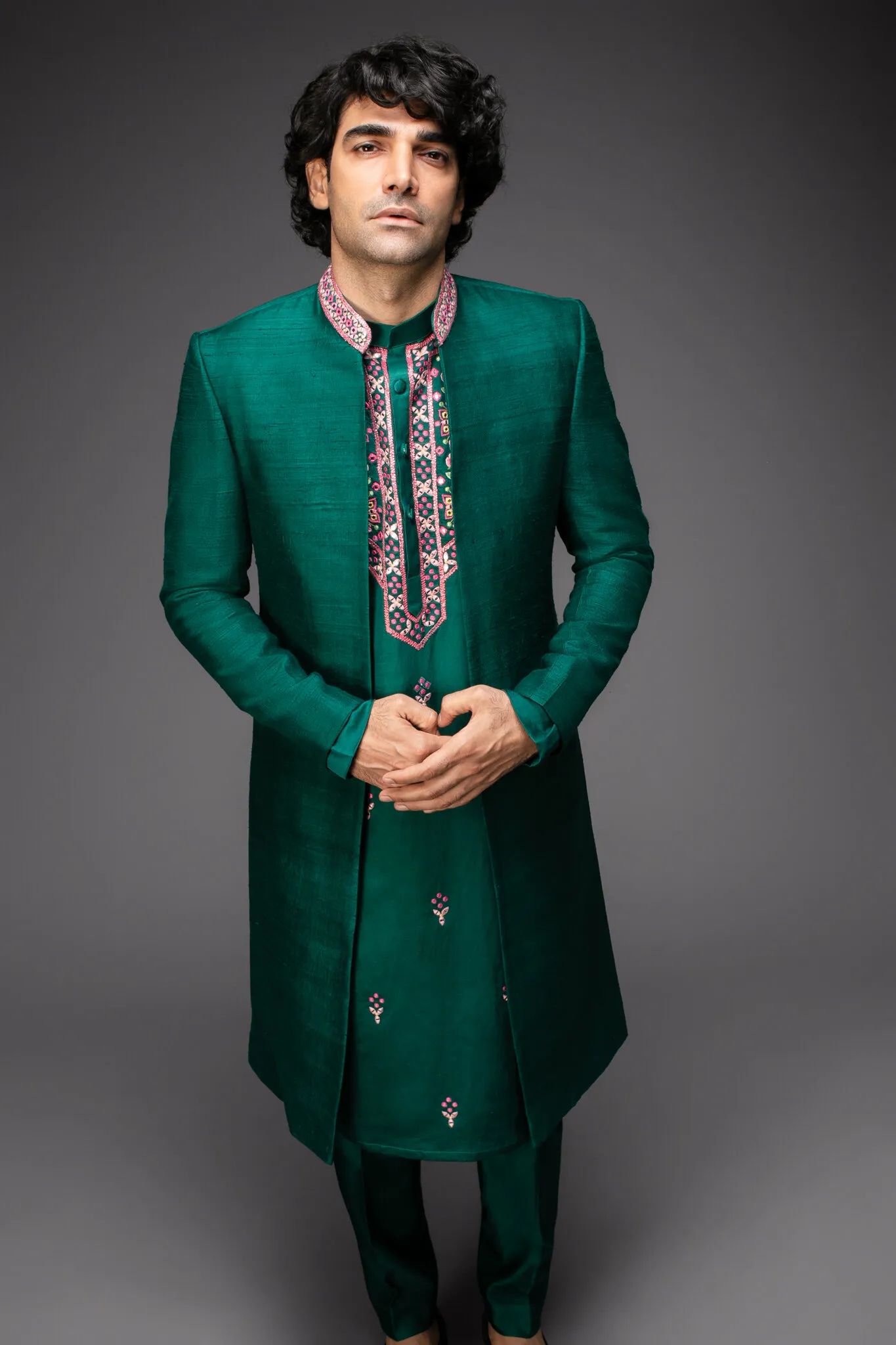 Introducing an emerald green kurta set crafted in satin linen, adorned with intricate thread, gota and mirror work embroidery. Paired with a raw silk open jacket and narrow pants, this ensemble blends traditional craftsmanship with contemporary elegance, making it perfect for festive occasions and wedding celebrations.