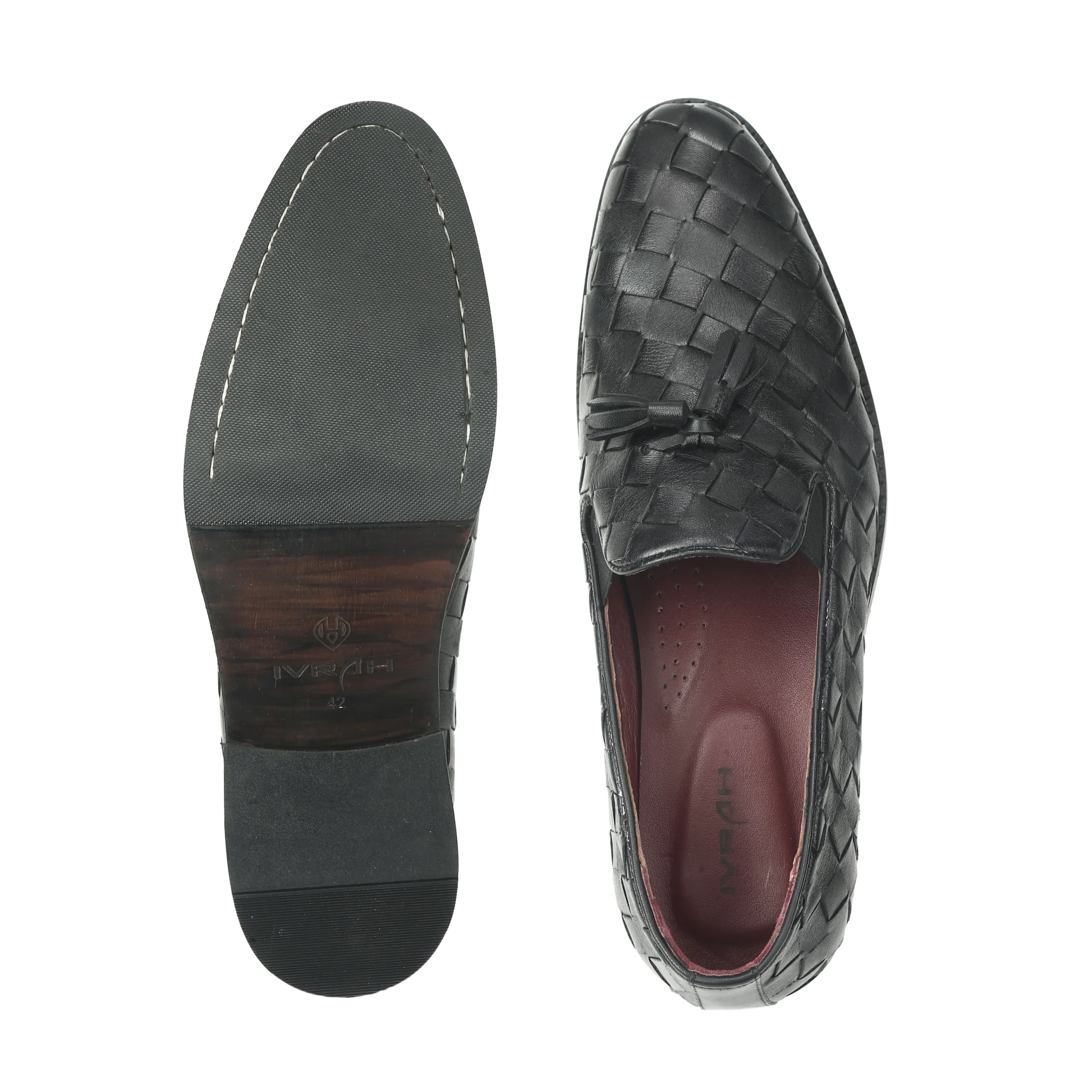 The Falcon Black Woven Leather Slip-On Shoes combine modern design with effortless sophistication. Crafted from premium genuine leather, the upper features a distinctive woven mesh texture that adds depth and character to the classic slip-on silhouette. Designed for comfort and durability, the interior provides a smooth fit while the anti-skid sole ensures stability with every step. Perfect for evening occasions and stylish outings, the Falcon Black Slip-Ons deliver a refined look that stands out while maintaining everyday practicality.