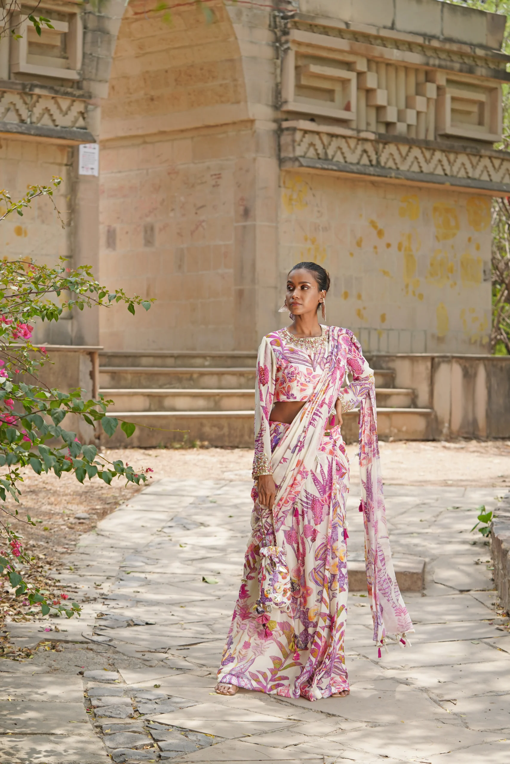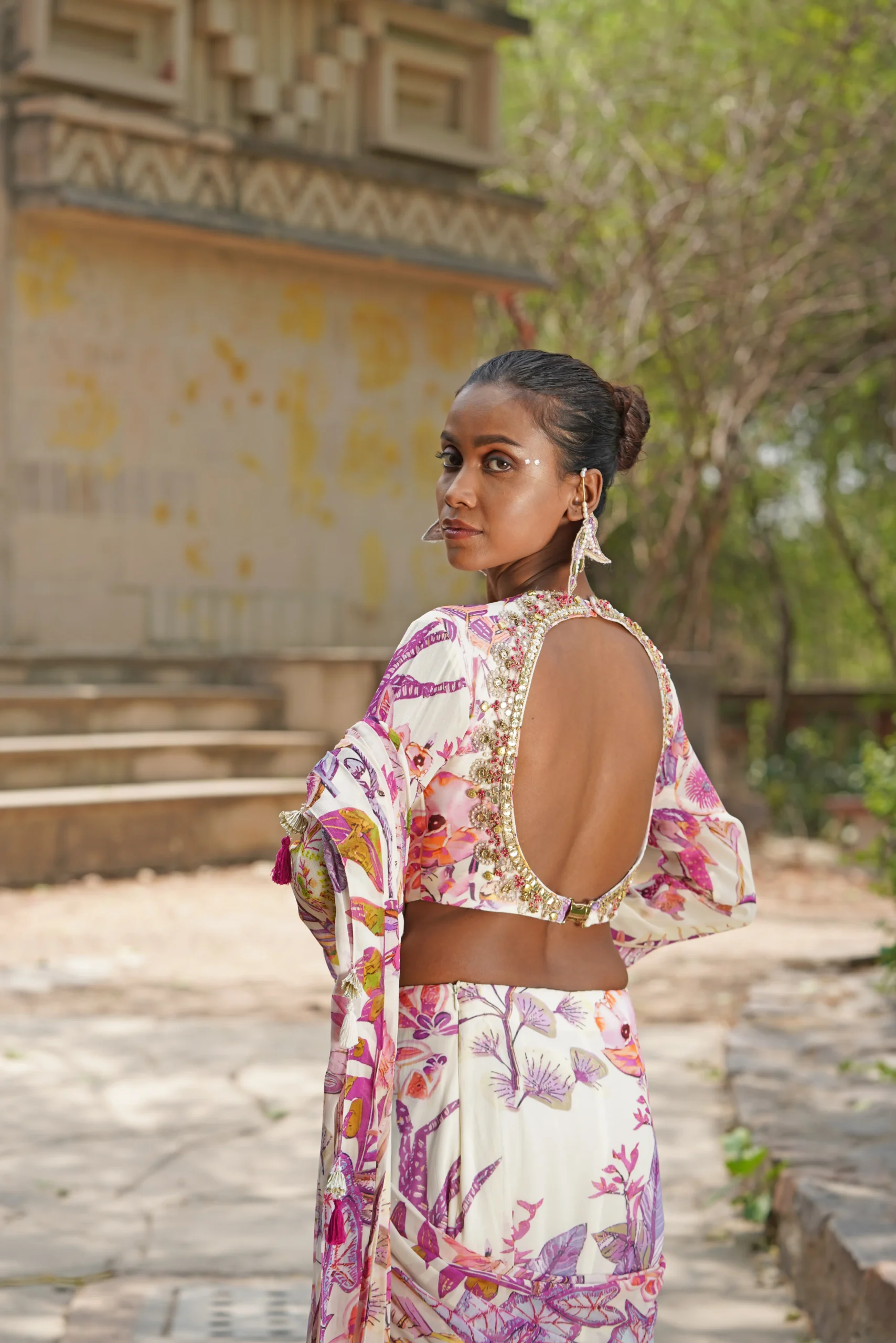 Floral Pre-Draped Saree with Belted Pallu, Full Sleeve Blouse & Matching Potli