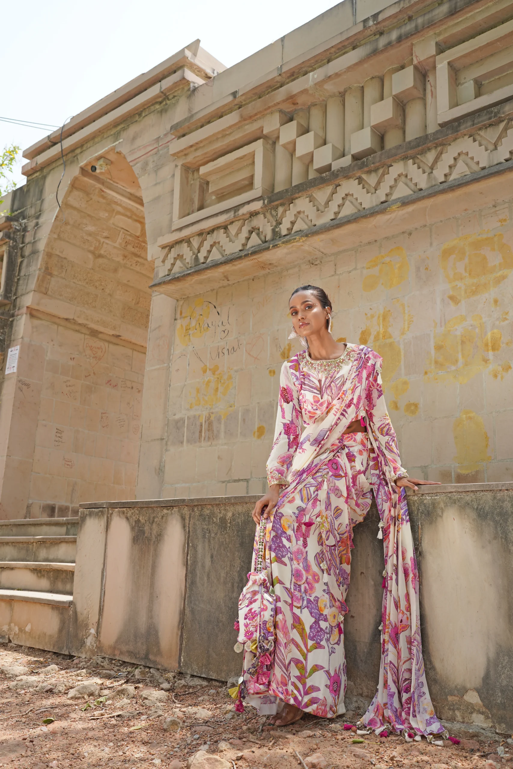 introducing a breezy pre-draped saree designed for effortless elegance and modern comfort. Featuring a belted pallu and a refined full-sleeve blouse, this ensemble offers graceful structure with easy wearability. Coordinated with a matching potli bag, the look feels like a floral breeze in motion—romantic, youthful, and perfect for summer weddings, mehendi, haldi, or open-air garden celebrations.