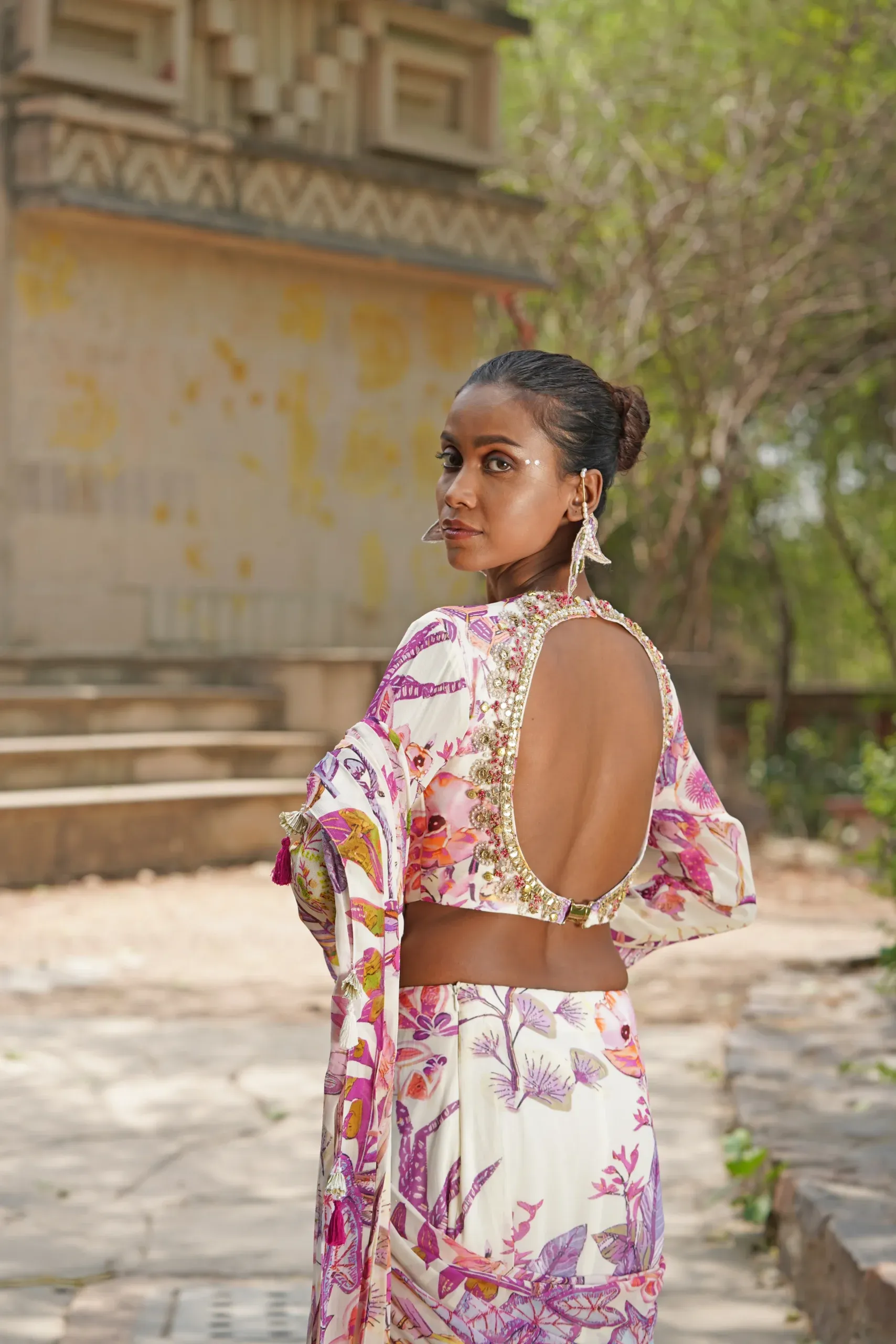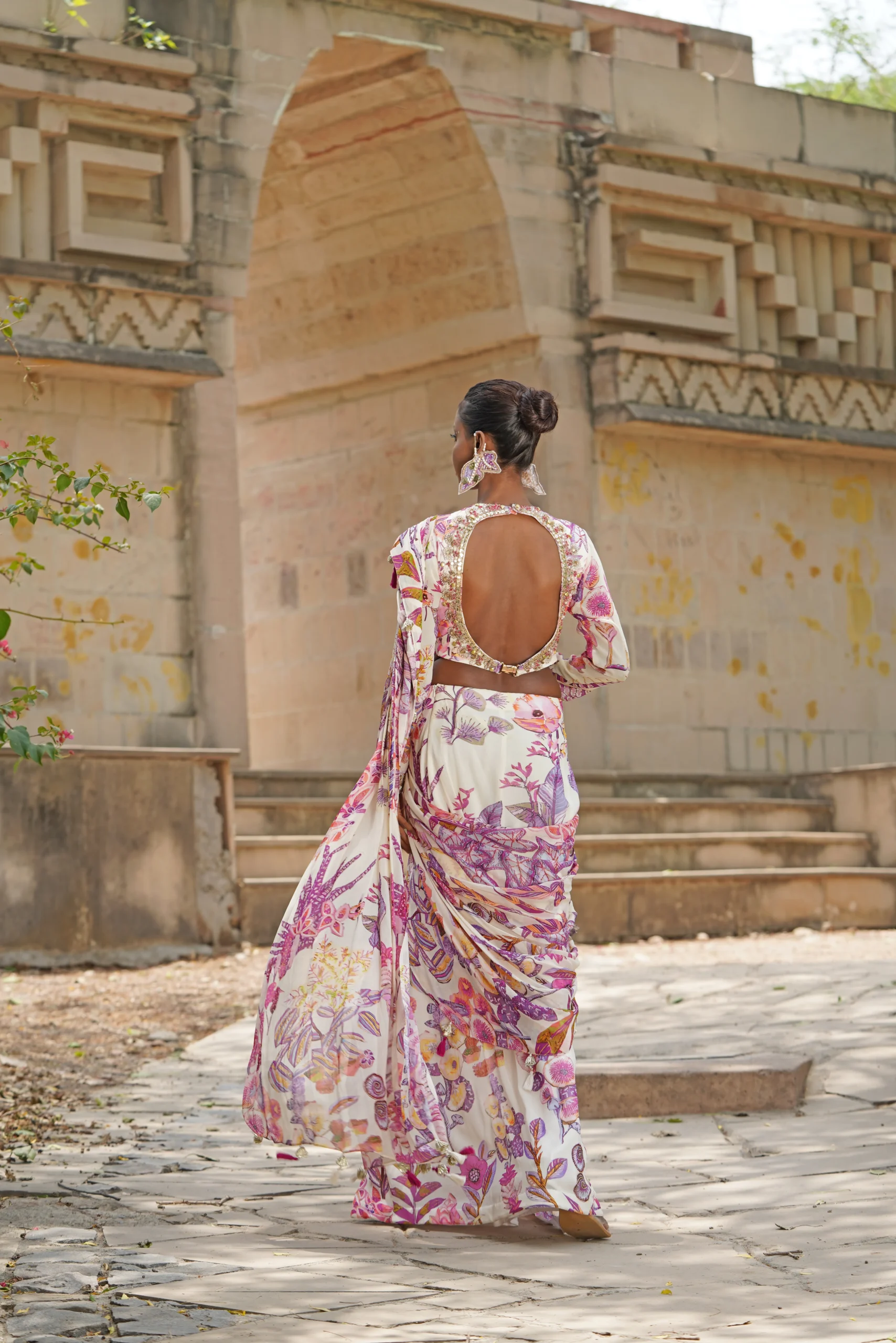 Style this breezy pre-draped saree with minimal pearl or floral-inspired earrings to keep the look light and elegant. Opt for fresh makeup with dewy skin, soft blush, and a glossy nude or pink lip. Complete the ensemble with strappy sandals or block heels, perfect for summer weddings, garden parties, and daytime celebrations.