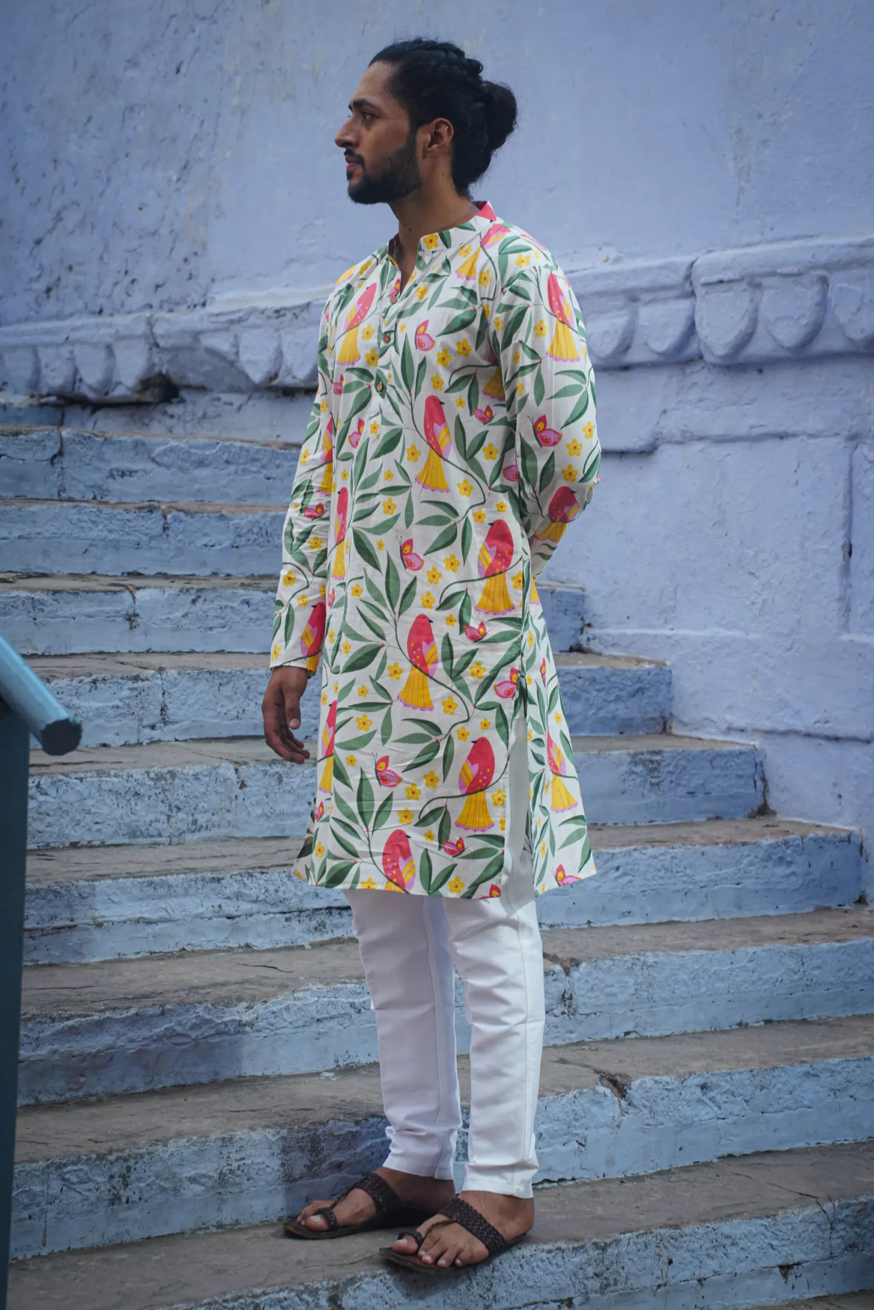 Introducing the Floral Royale Handblock Printed Cotton Kurta, a refined blend of traditional artistry and modern comfort. Crafted in breathable cotton with intricate handblock floral motifs, this elegant kurta features a sophisticated mandarin collar and functional side pockets. Designed for effortless style, it transitions seamlessly from casual daytime gatherings to refined festive occasions, offering timeless charm, comfort, and understated luxury.