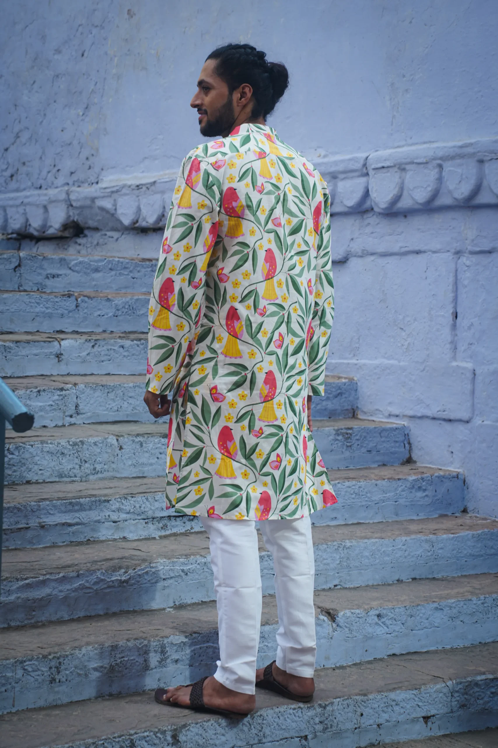 A regal statement in handblock cotton, this Sanganeri floral kurta set is your go-to for intimate festivities or elegant day soirees. Style it with tan mojaris, a sleek watch, and tinted sunglasses for a polished, old-money aesthetic that feels effortlessly luxurious.