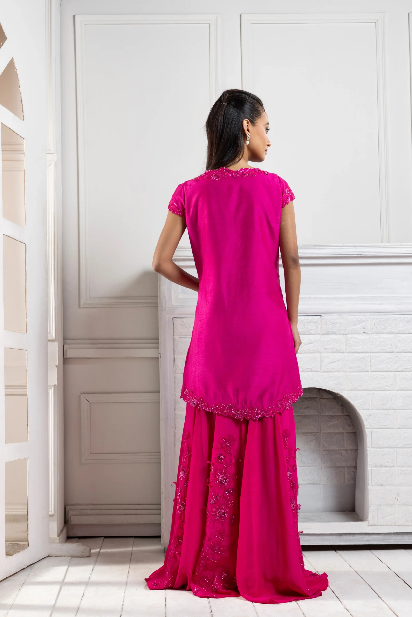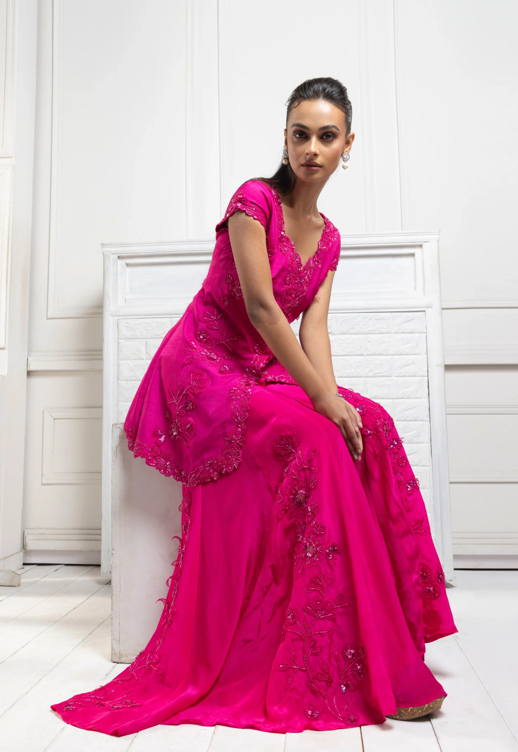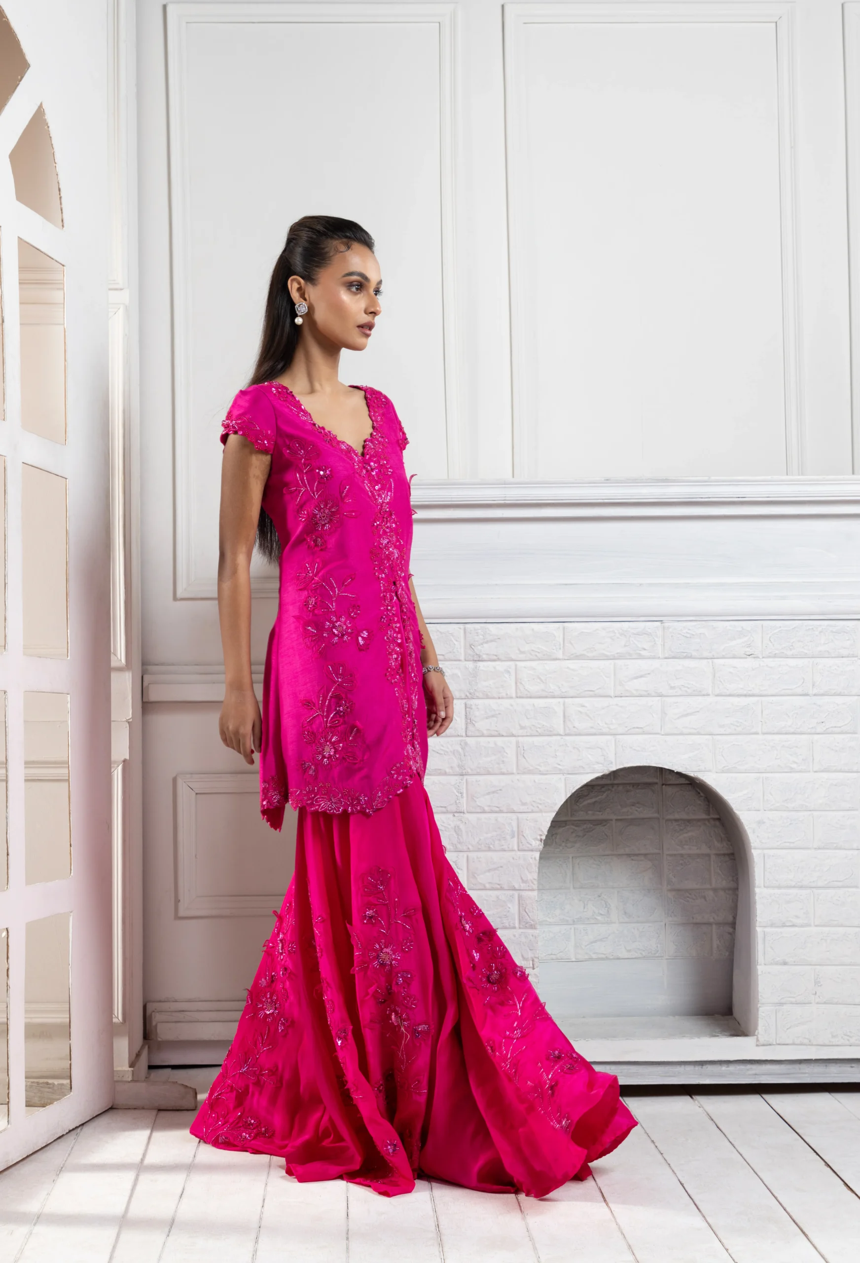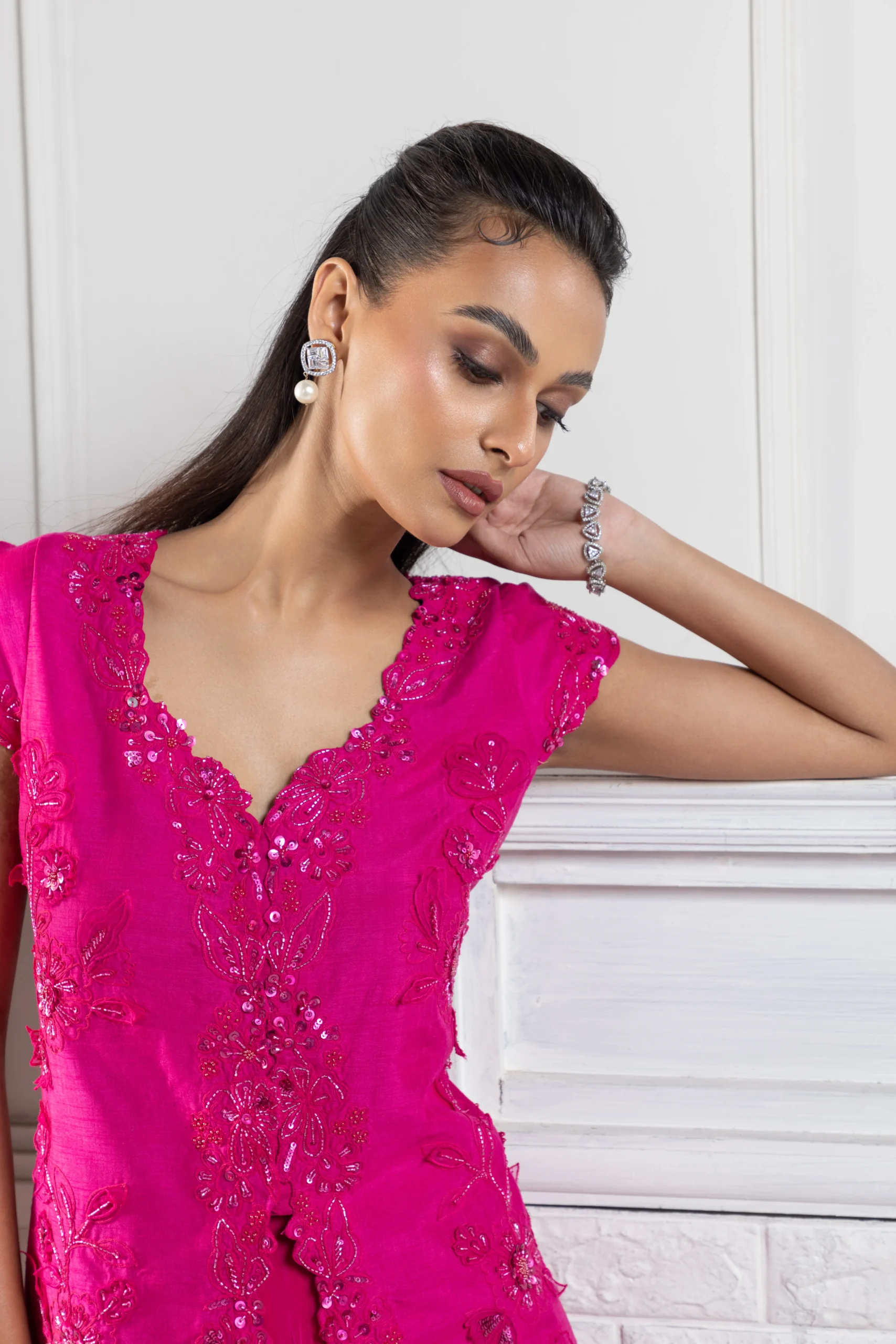 The Fuchsia Lehenga Set is a vibrant celebration of elegance and contemporary style. Crafted in a rich fuchsia hue, the ensemble features intricate floral embroidery that enhances its festive charm. The fitted bodice with a flattering V-neckline and short sleeves creates a refined silhouette, while the high-low hemline lehenga adds graceful movement and modern appeal. Perfect for weddings, festive gatherings, and evening celebrations, this statement ensemble blends traditional craftsmanship with bold, modern design.