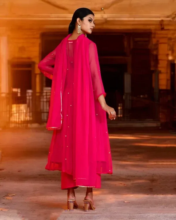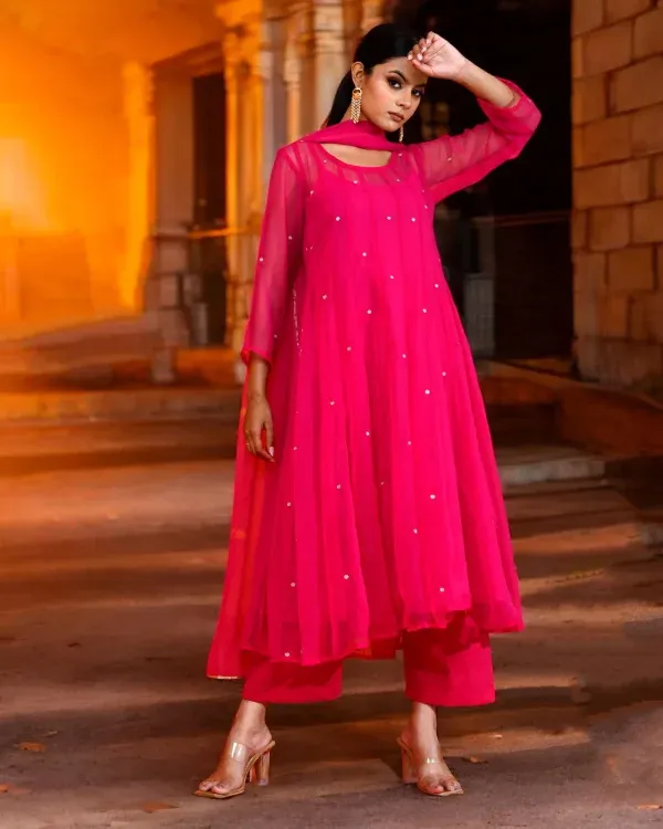 Introducing a bold yet graceful fuchsia georgette suit set designed to make a refined festive statement. The flowing Anarkali kurta, crafted in lightweight georgette, is delicately enhanced with aari embroidery, adding subtle texture and artisanal elegance to its fluid silhouette. Timeless in appeal, this ensemble beautifully balances modern colour with traditional craftsmanship and effortless sophistication.