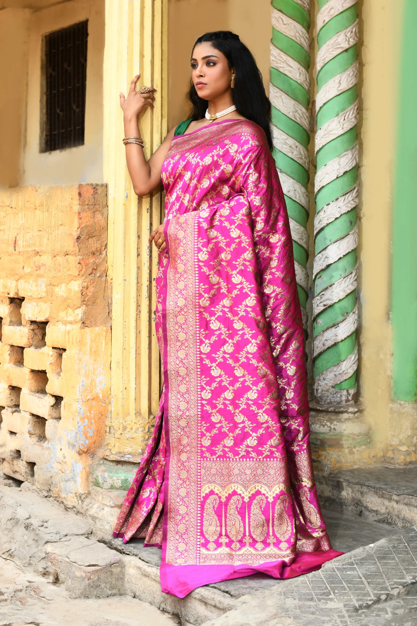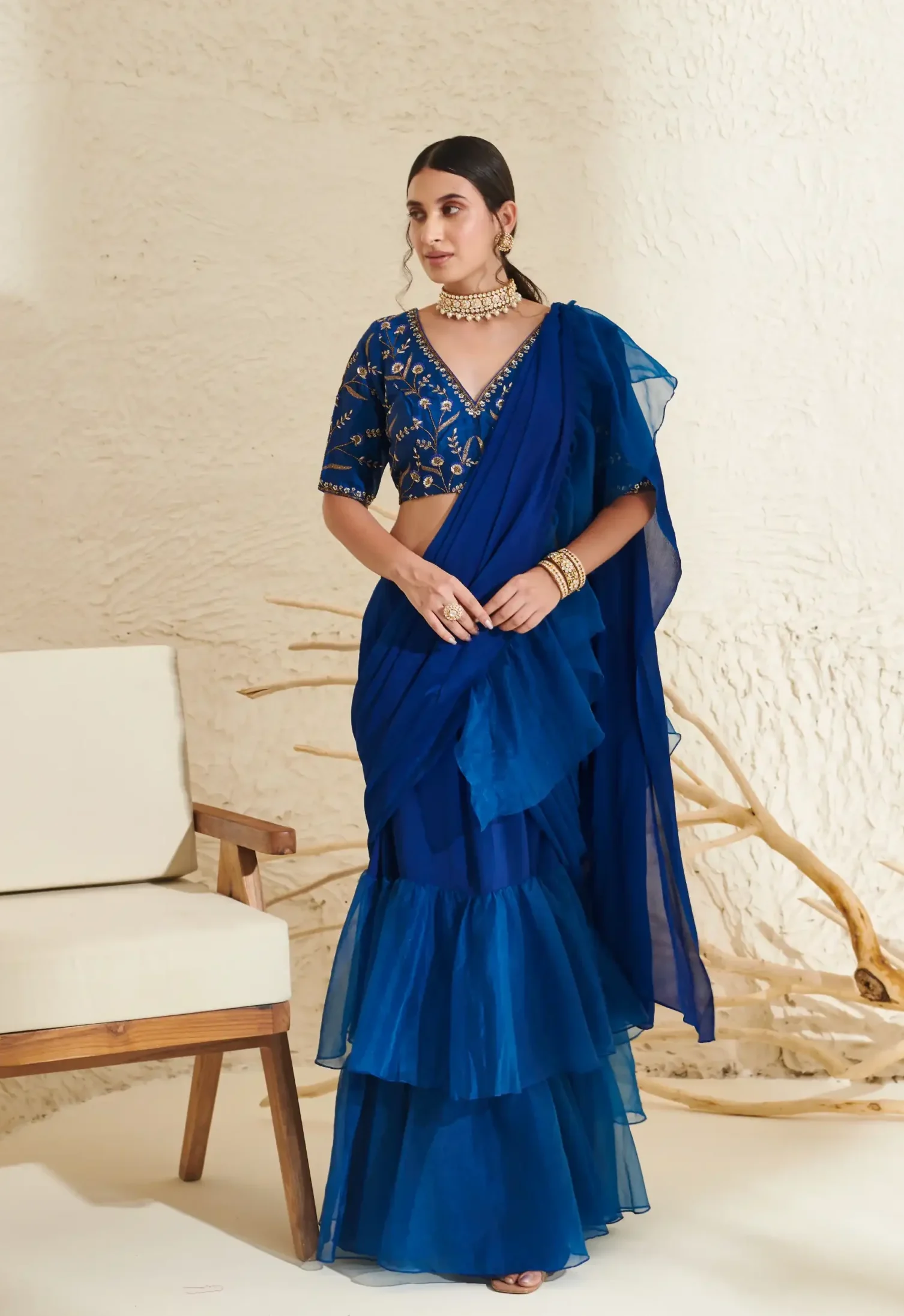 Complement with temple jewelry or kundan sets for ceremonial occasions, or opt for delicate gold jewelry for understated elegance. Style with a neat bun or soft curls, warm-toned makeup, and embellished heels or classic juttis for a graceful finish.
