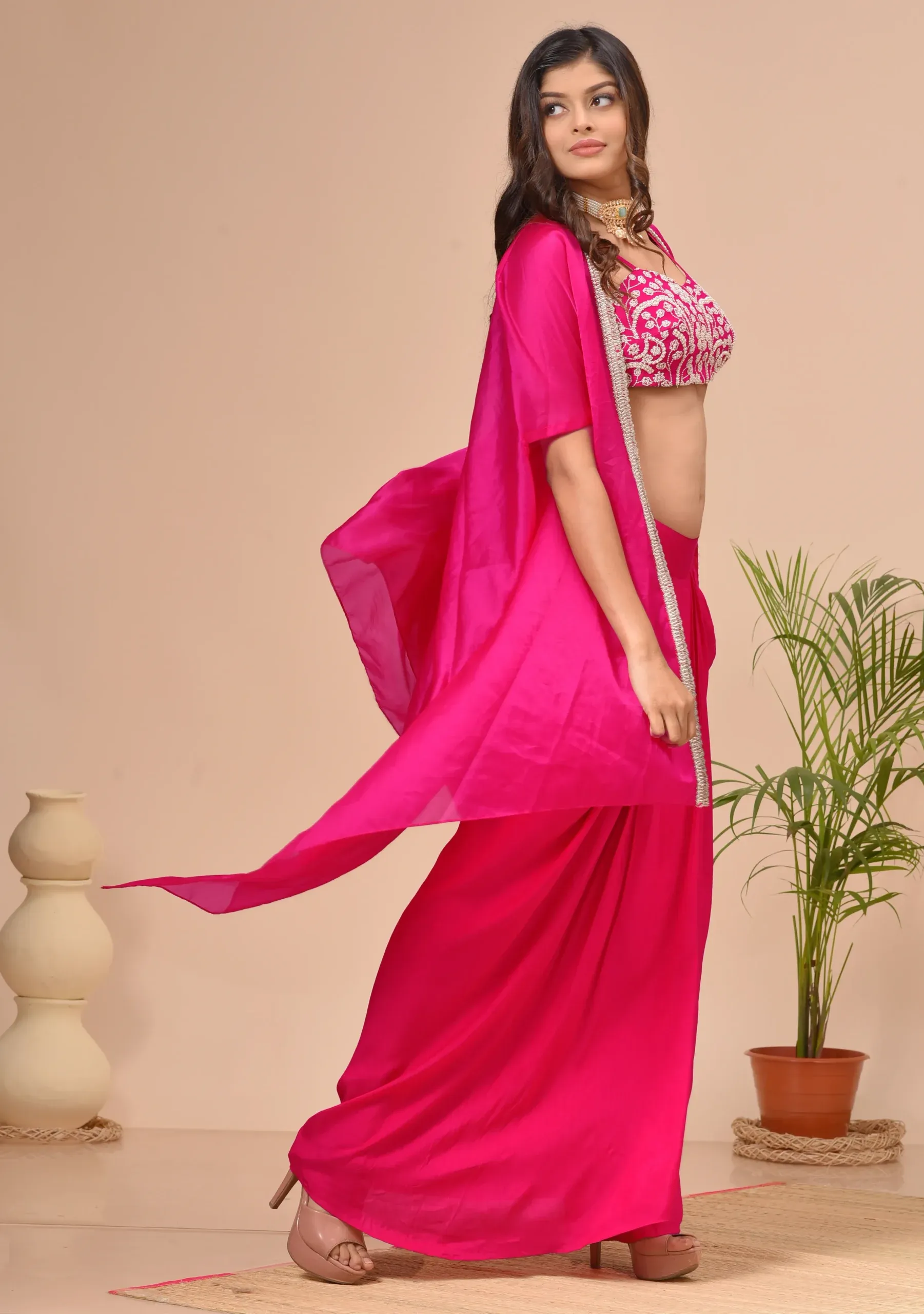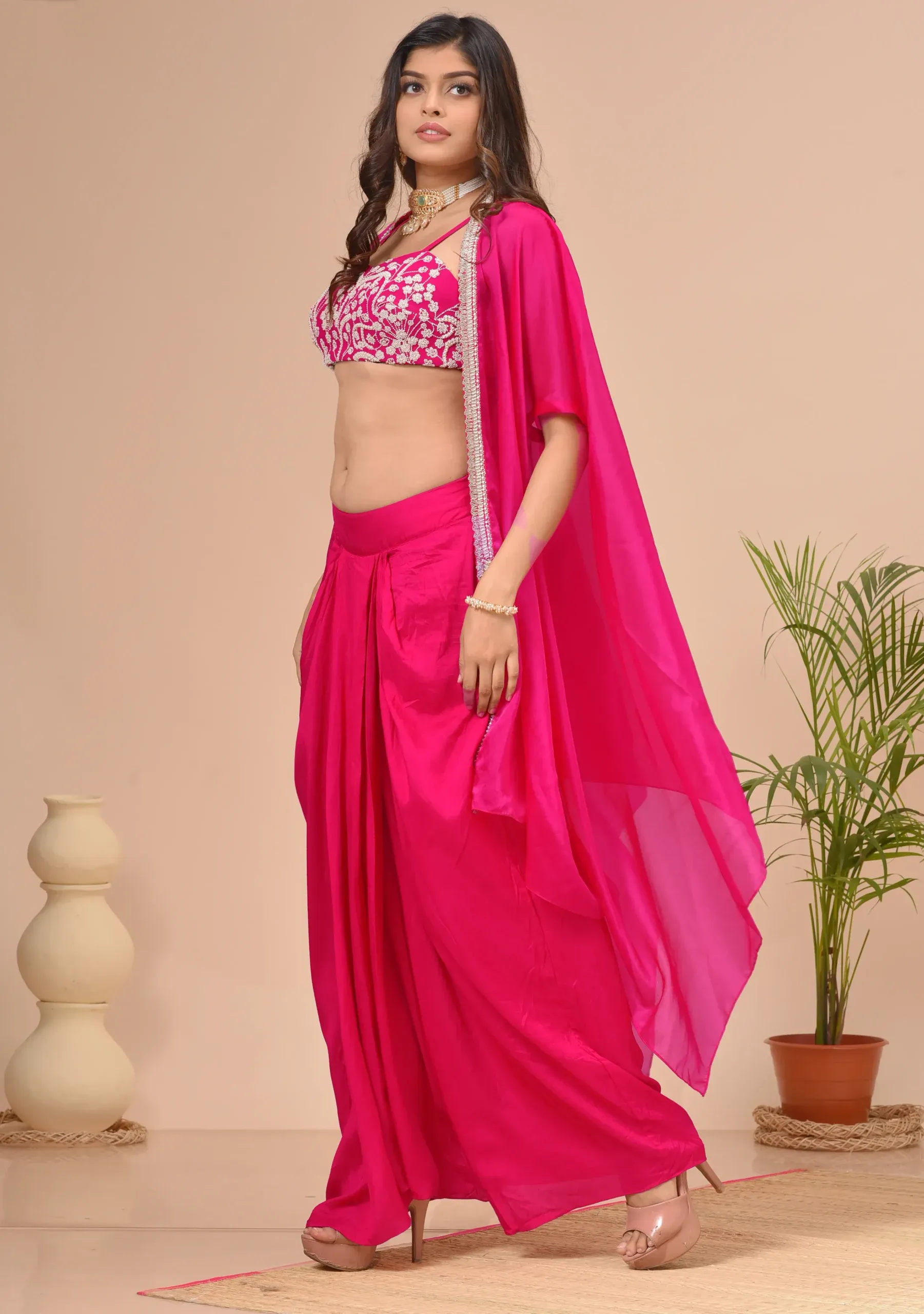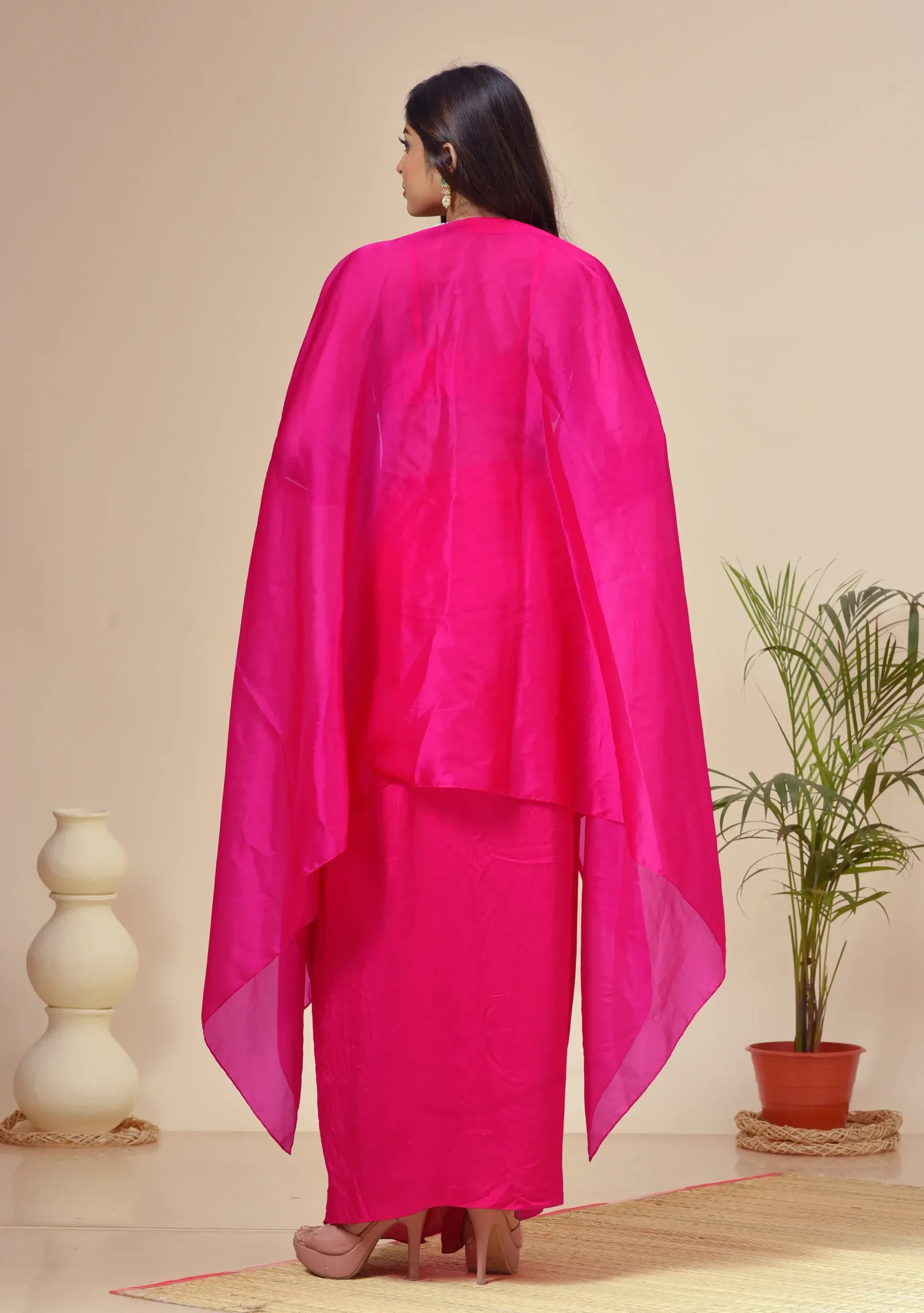 Fuchsia Pink Georgette Beads Embroidered Cape Set