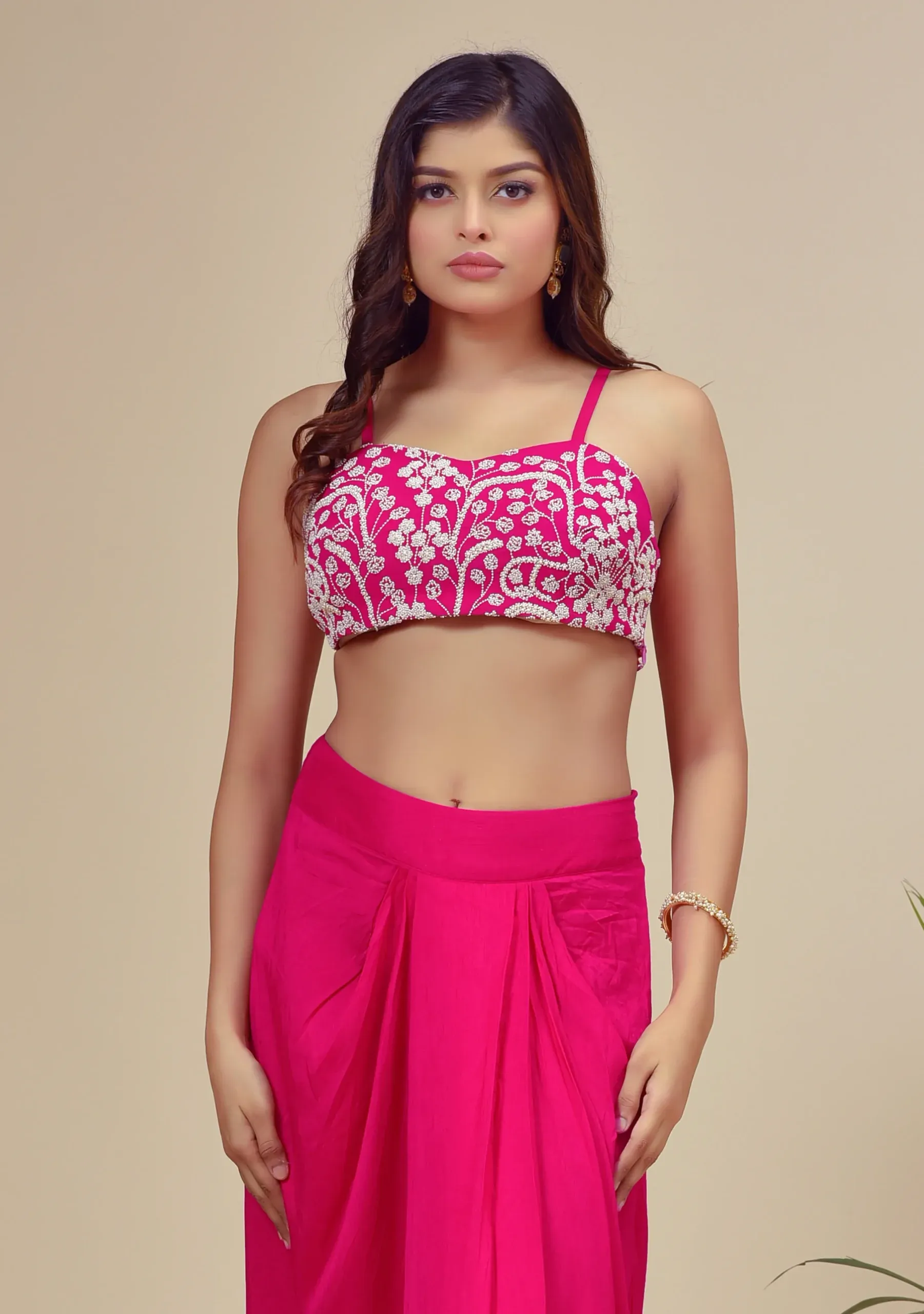 Kumar Rahul presents a vibrant fuchsia pink crepe draped skirt, paired with a delicate spaghetti strap georgette bustier, beautifully adorned with intricate floral bead embroidery. This stunning ensemble exudes sophistication and grace, perfect for making a bold fashion statement at any special occasion. To add an extra touch of elegance, the outfit is complemented by a flowing organza-bordered cape, enhancing its glamour and timeless appeal.
