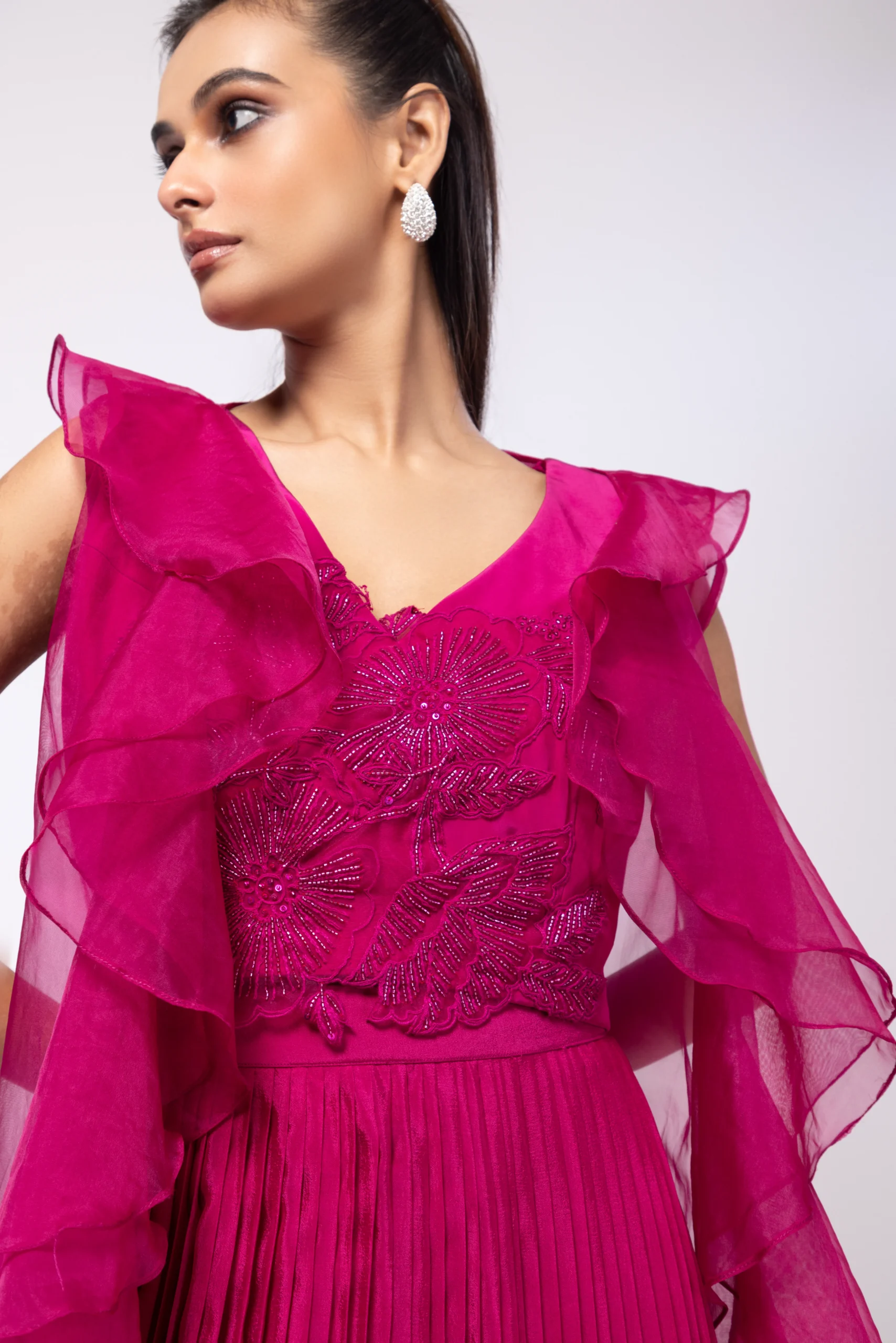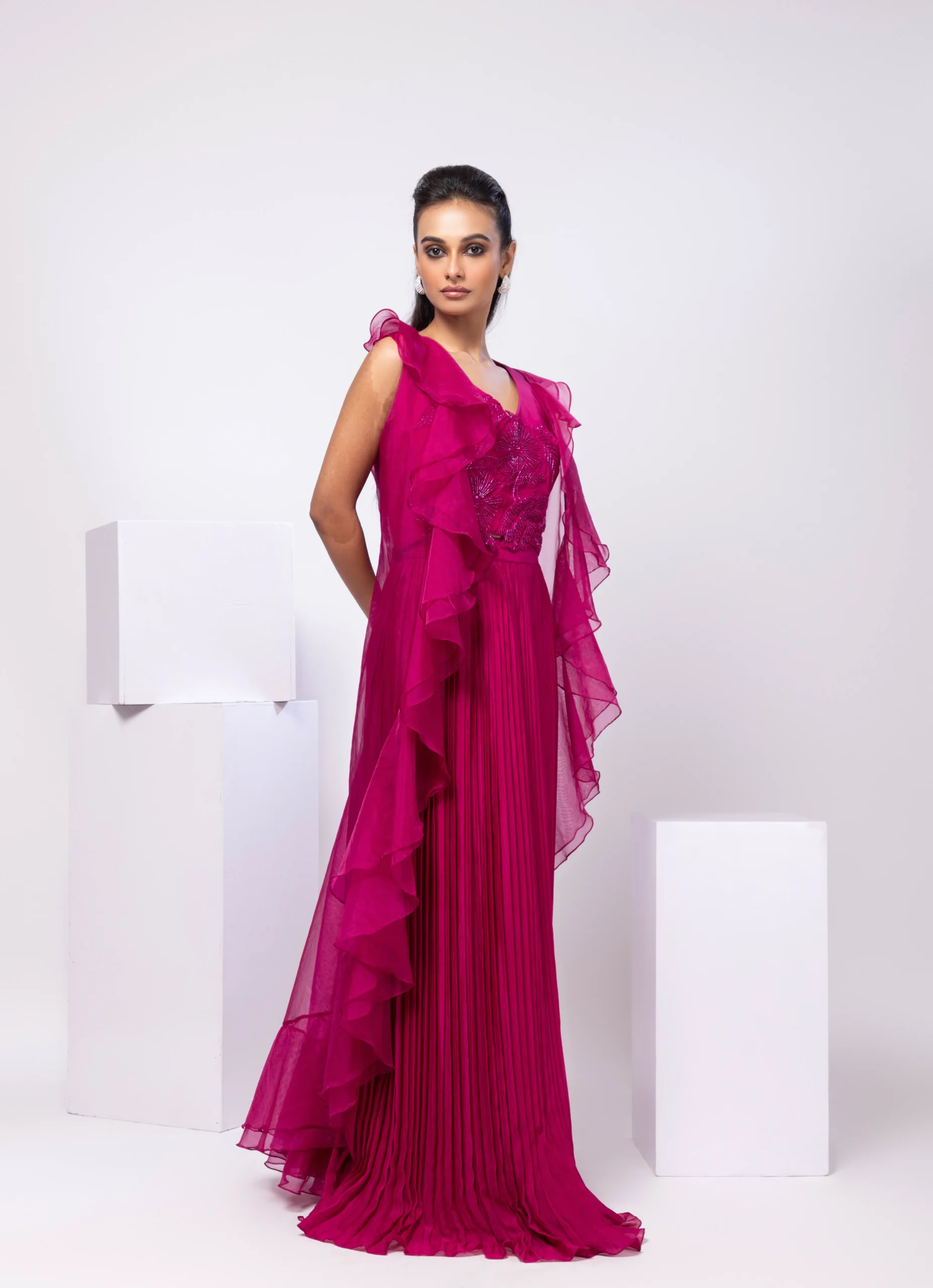 This striking fuchsia pink outfit exudes sophistication and glamour with its ethereal, flowing silhouette. The blouse is adorned with delicate embroidery and embellishments, adding a touch of intricacy. The ruffled jacket cascades down, lending a dramatic yet graceful effect. The pleated skirt flows elegantly to the floor, enhancing movement and fluidity. Crafted from sheer and lightweight fabric, this gown is perfect for evening galas, red carpet events, or any occasion where elegance meets modern charm.