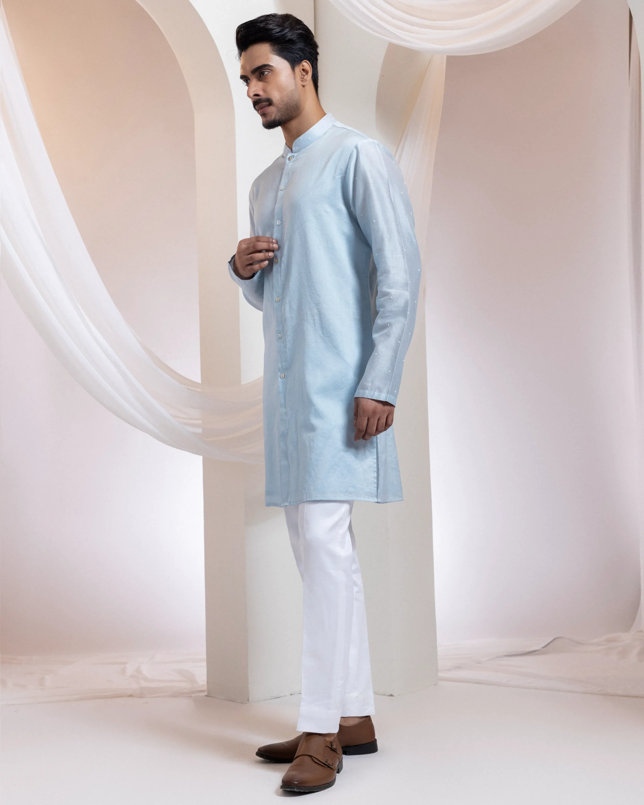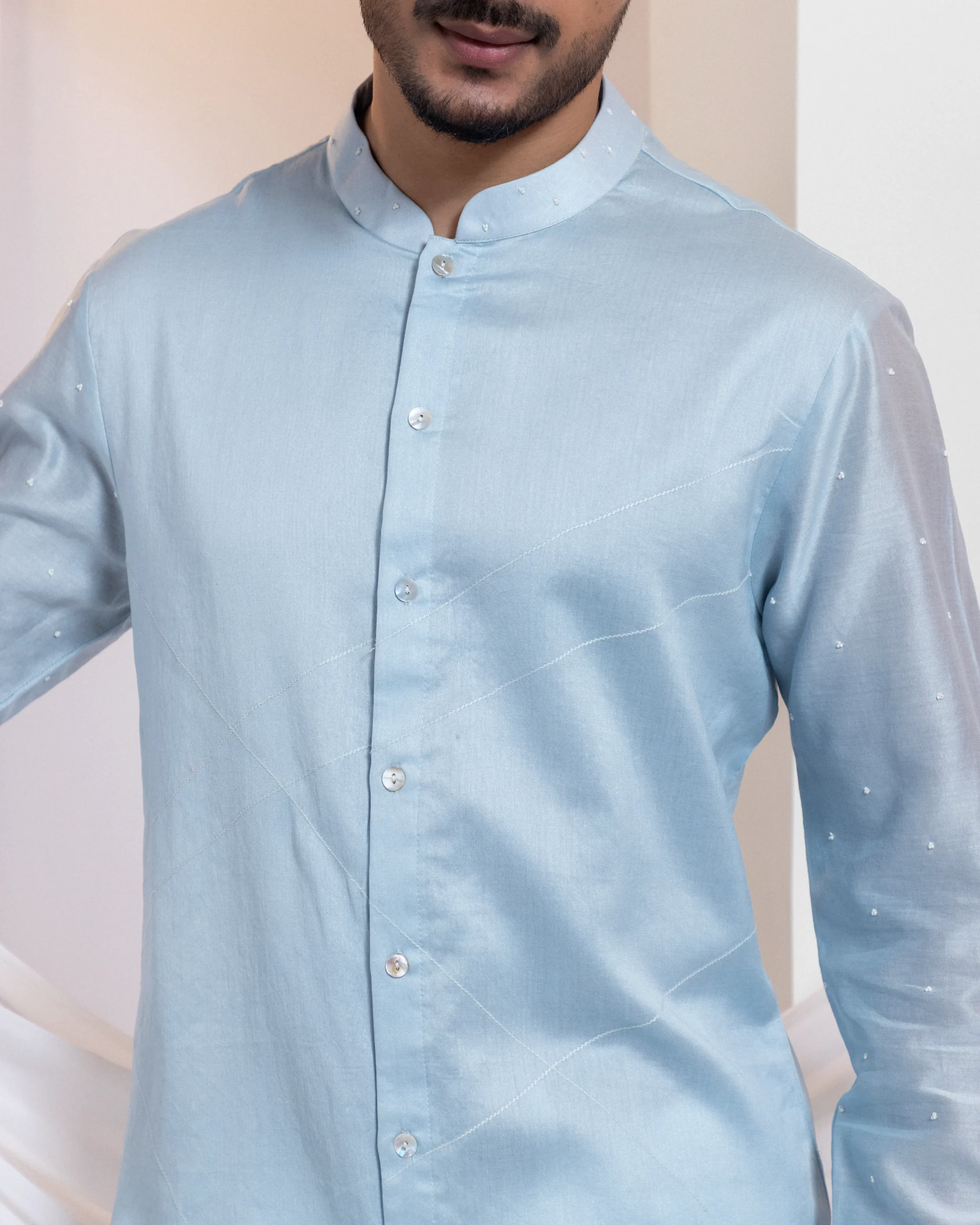 Introducing a refined kurta set adorned with delicate white-stitched geometric patterns across the front, elevated with fine bead accents along the collar and sleeves. The clean embroidery lends quiet sophistication, while the tailored silhouette ensures effortless comfort. Balancing elegance and ease, this ensemble is perfect for festive gatherings, spiritual occasions, and elevated daytime wear.