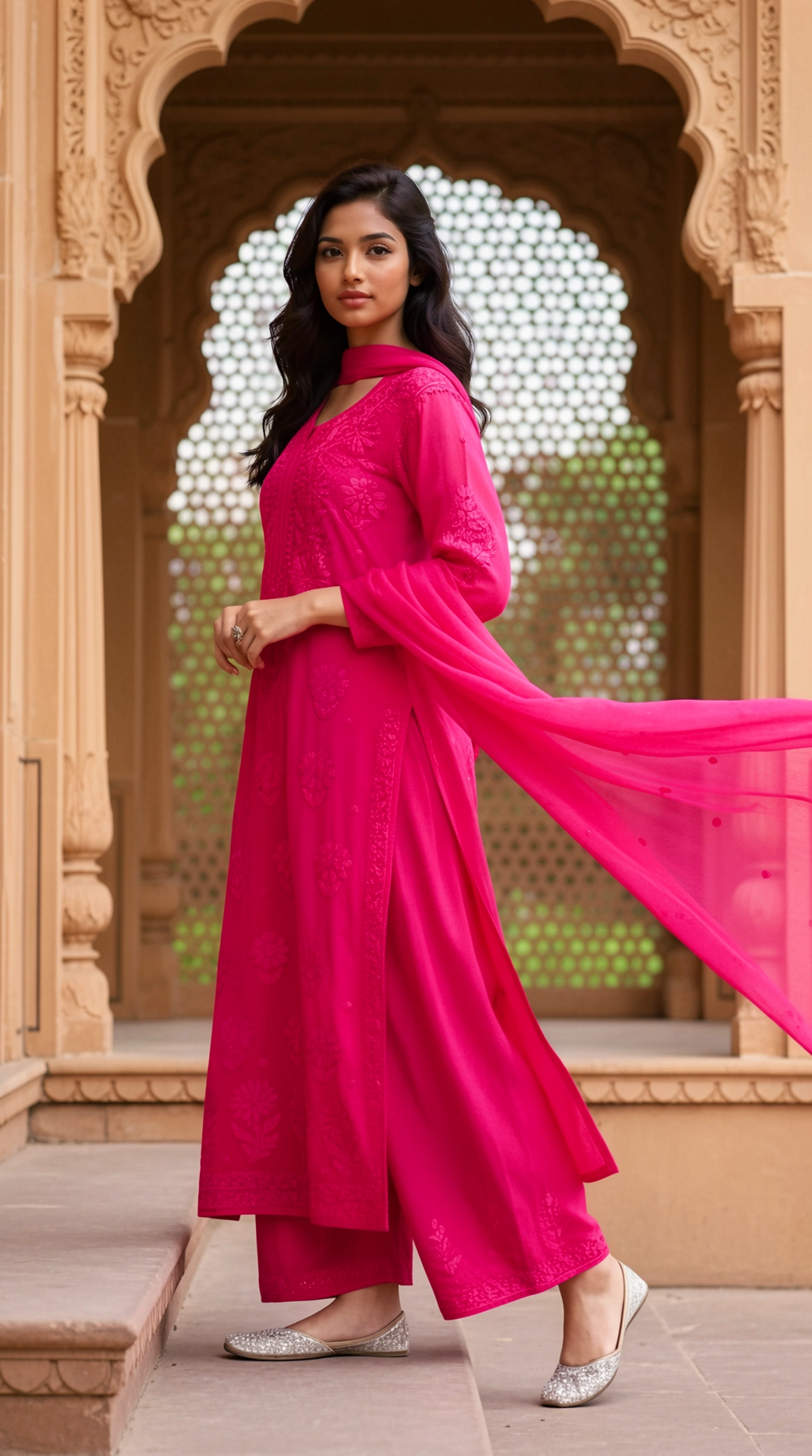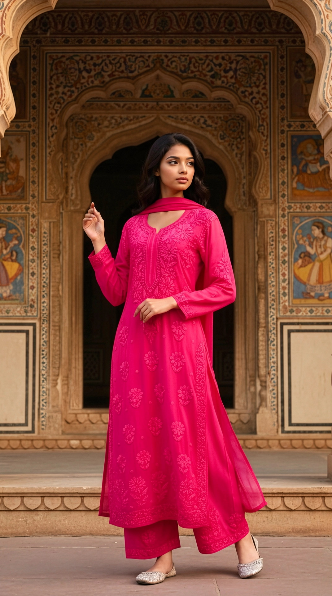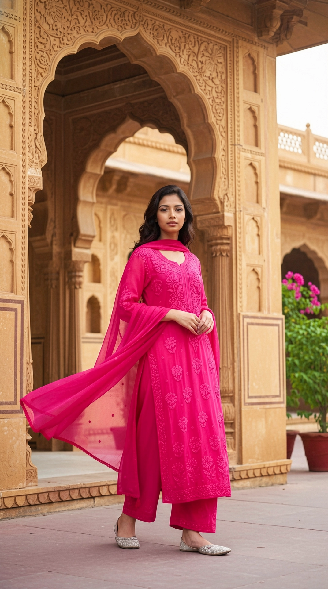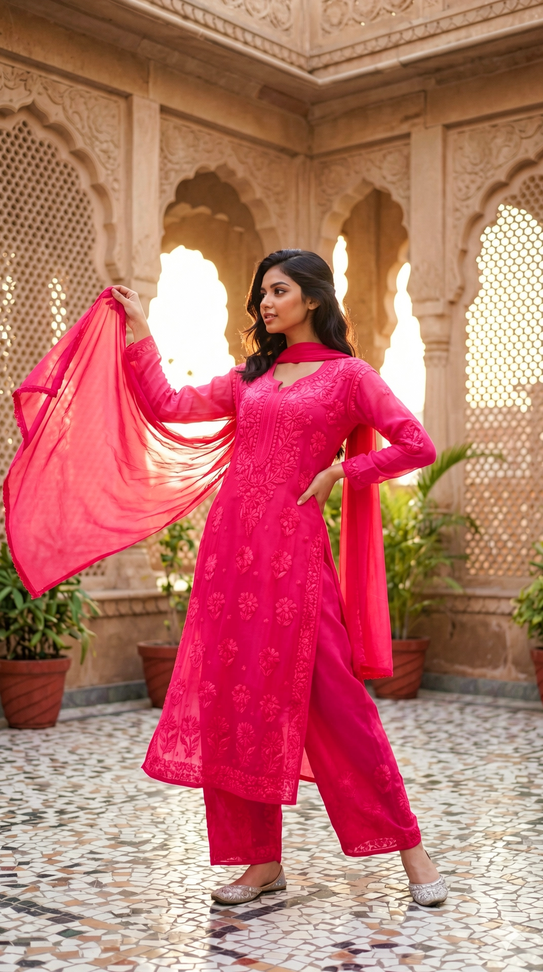 This georgette kurta set showcases elegant embroidery with subtle sequin accents, creating a graceful and refined silhouette. Designed with a straight-cut kurta, coordinated bottoms, and a matching dupatta, it offers comfort, artisanal detailing, and timeless appeal, making it ideal for festive gatherings, daytime celebrations, and elegant ethnic occasions.
