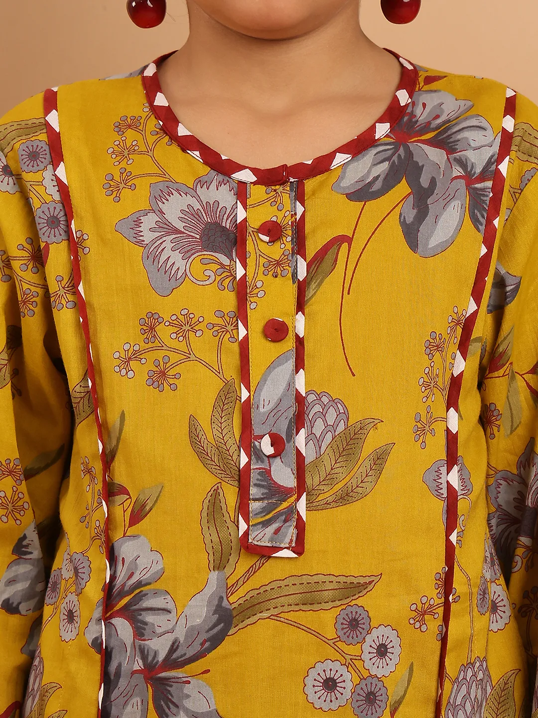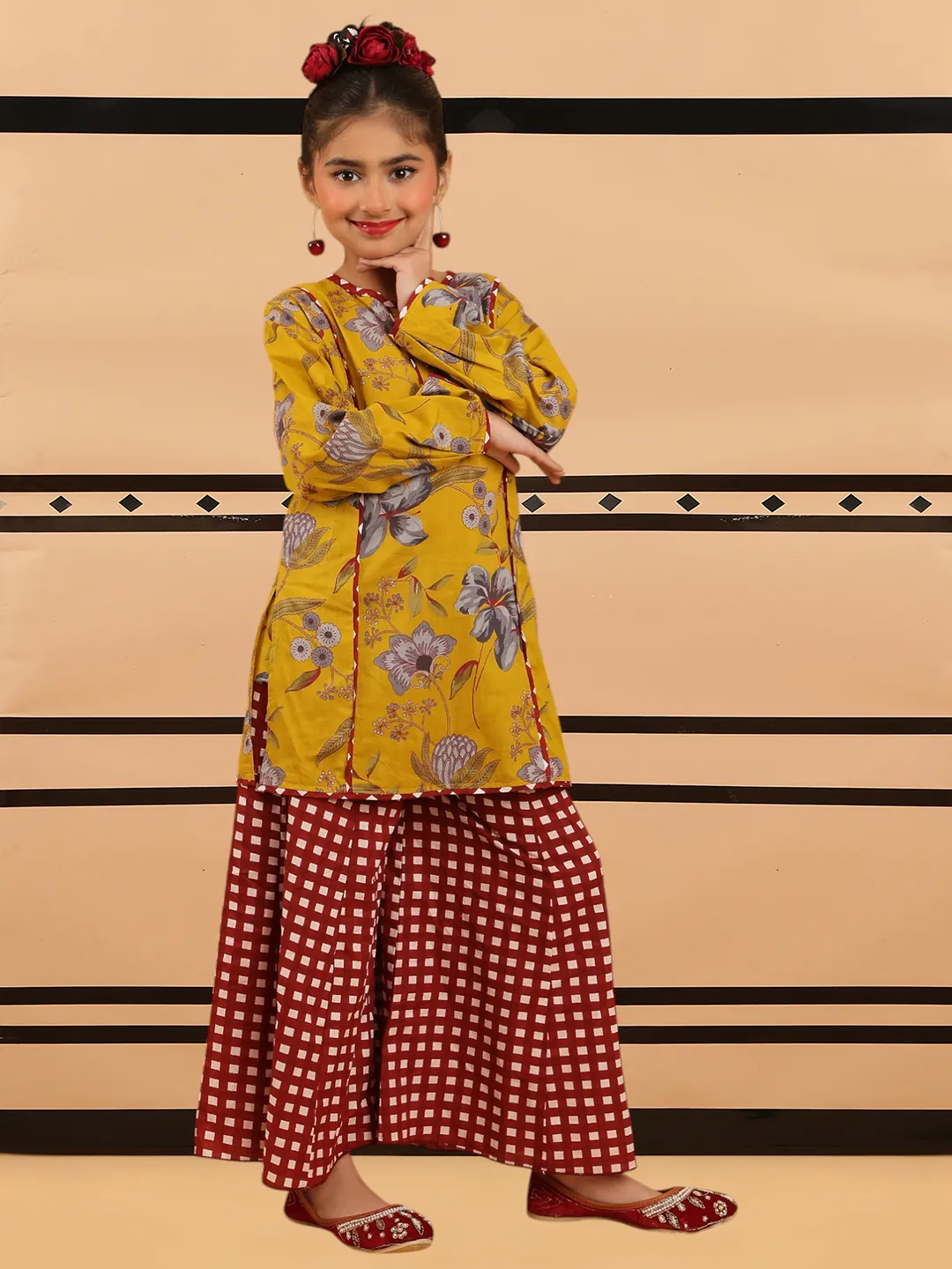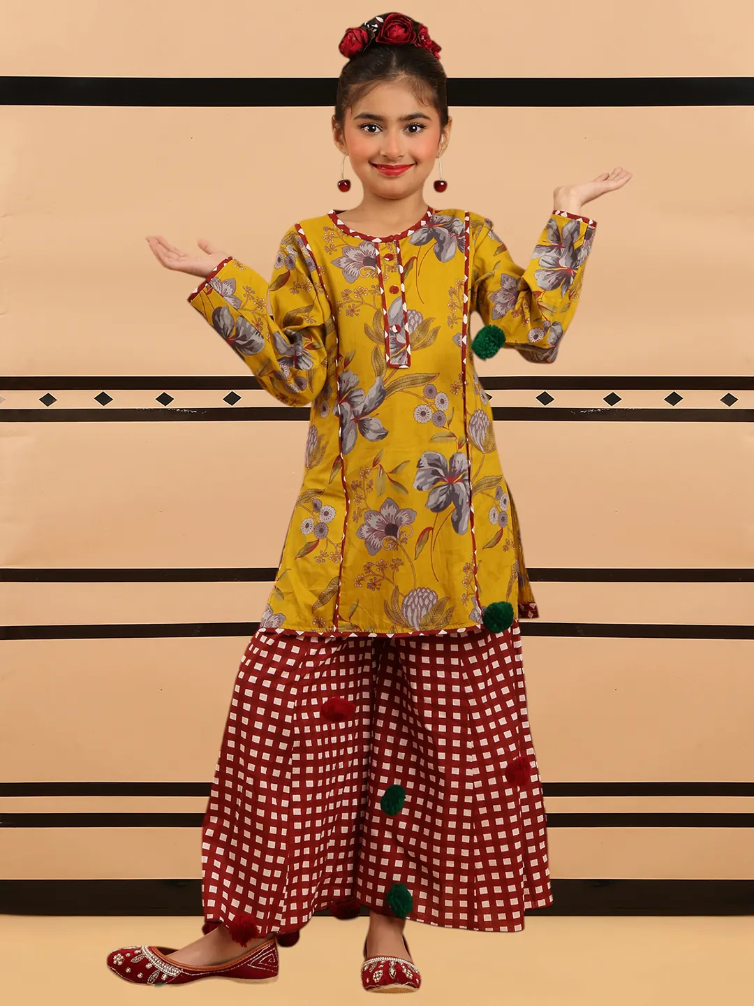 Introducing Girls Mustard Yellow Floral Kurta Sharara Set, featuring a straight-cut kurta with elegant floral prints paired with a contrasting maroon and white checkered sharara. Designed for comfort and style, this vibrant ethnic outfit is perfect for festive occasions, cultural celebrations, and special gatherings.