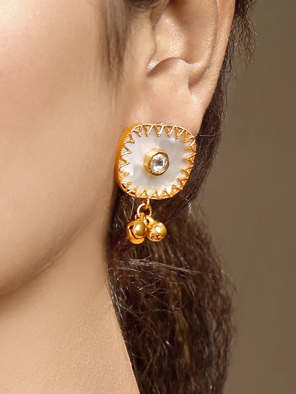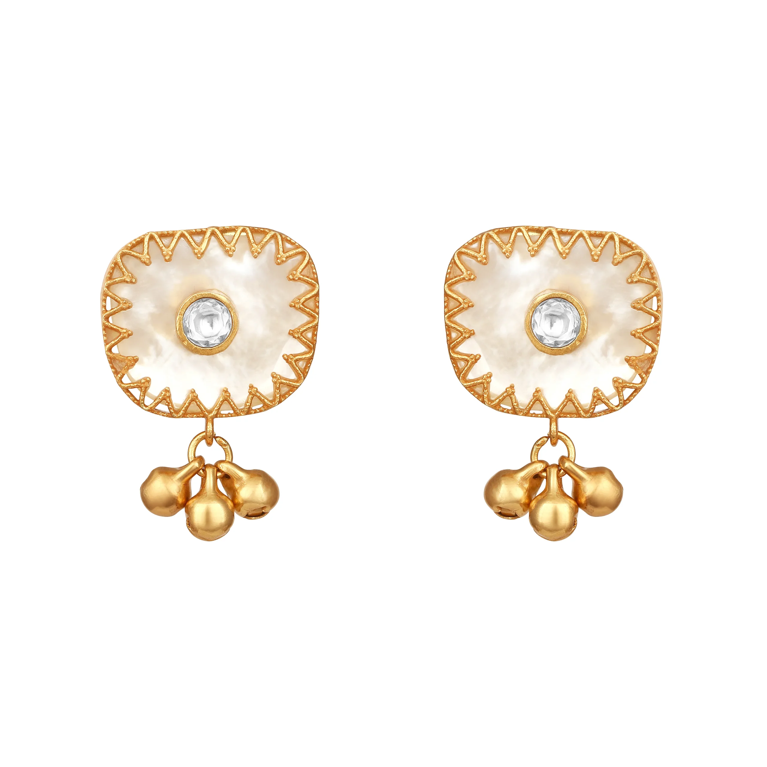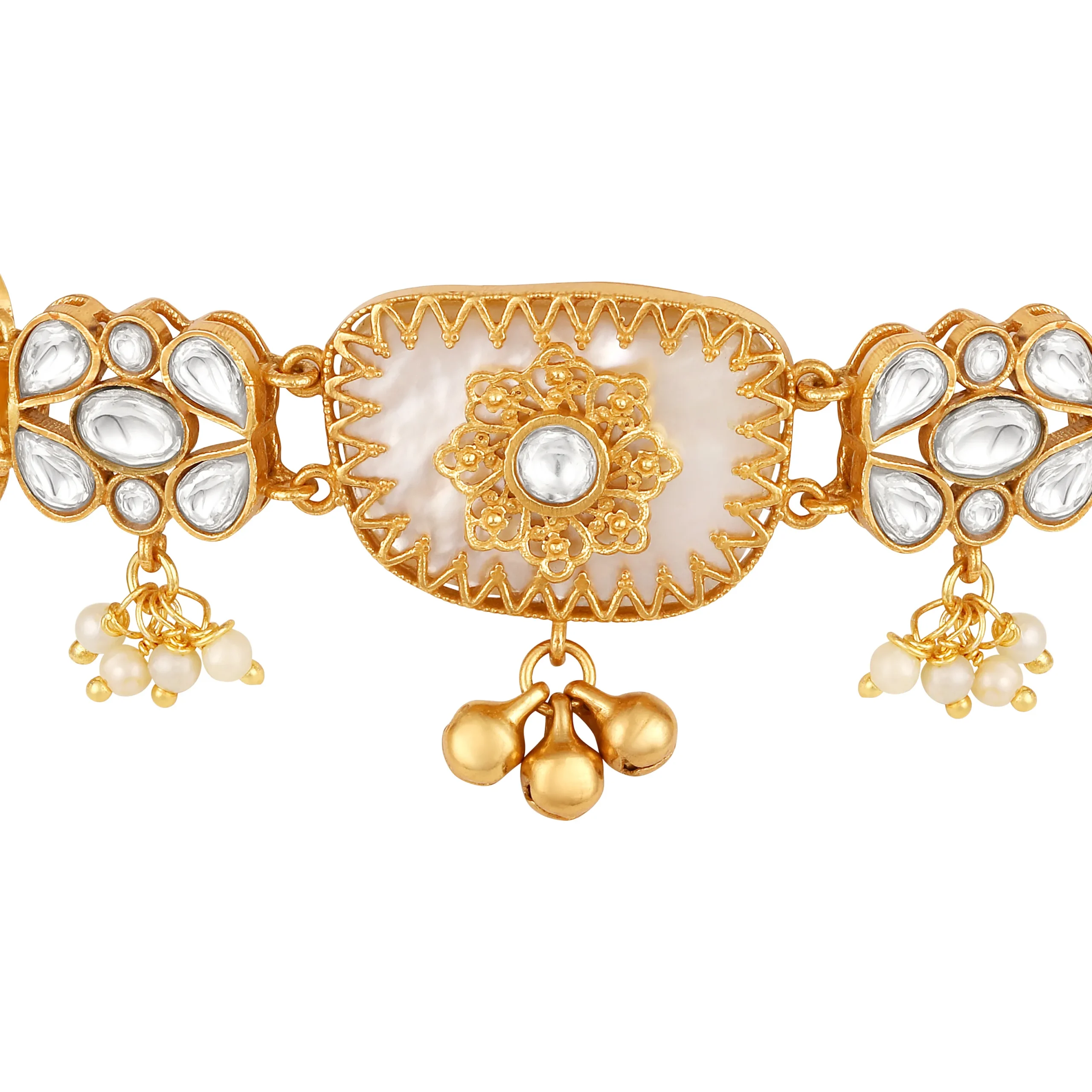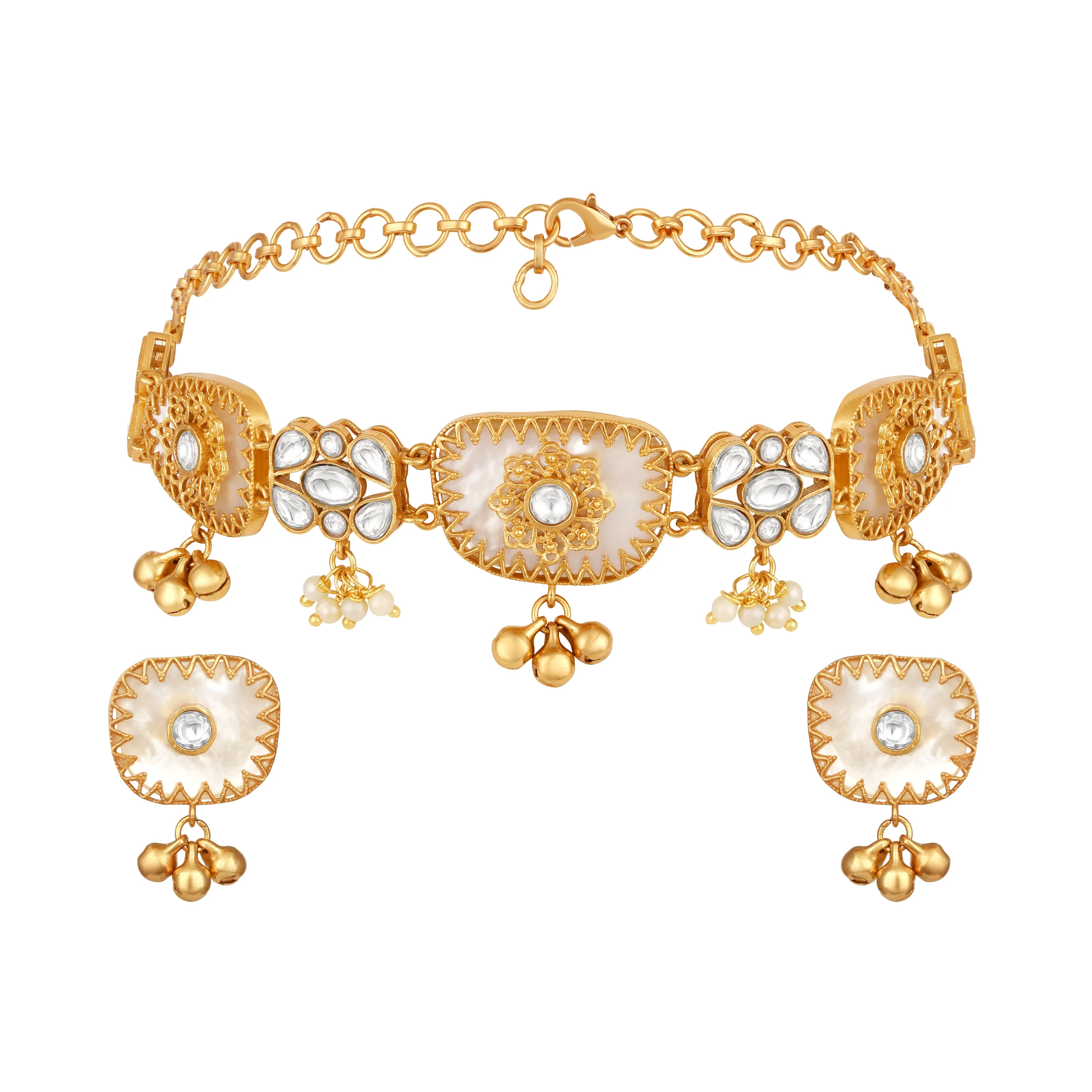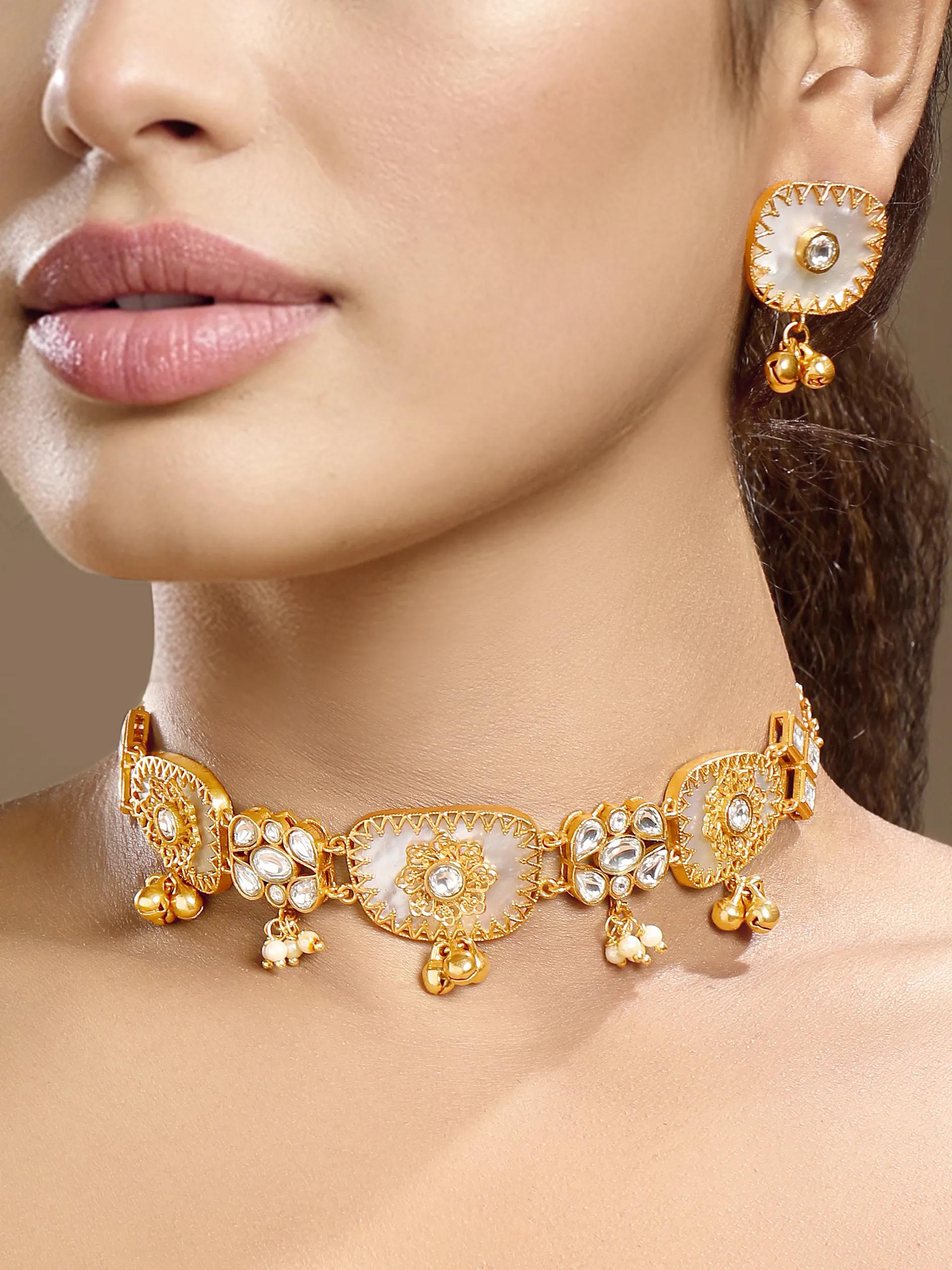Introducing a graceful gold and cream choker necklace set, crafted in brass with micron gold plating and a radiant gold polish finish. Embellished with moissanite Kundan Polki, luminous mother of pearl, and elegant pearls, it exudes refined festive charm, perfect for Haldi and special occasions. The set includes one necklace with an adjustable lobster lock chain and a pair of push-back earrings. Natural stone variations enhance its unique appeal.