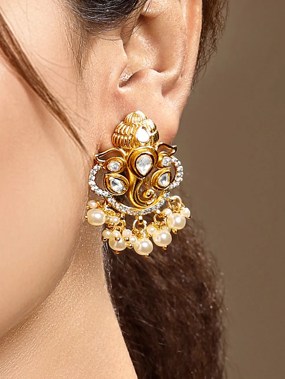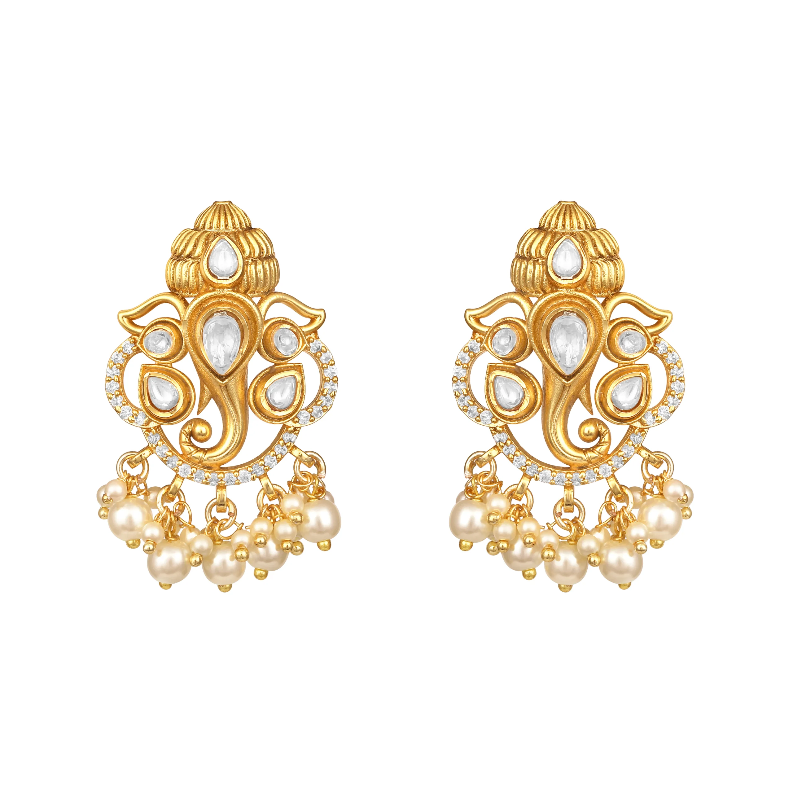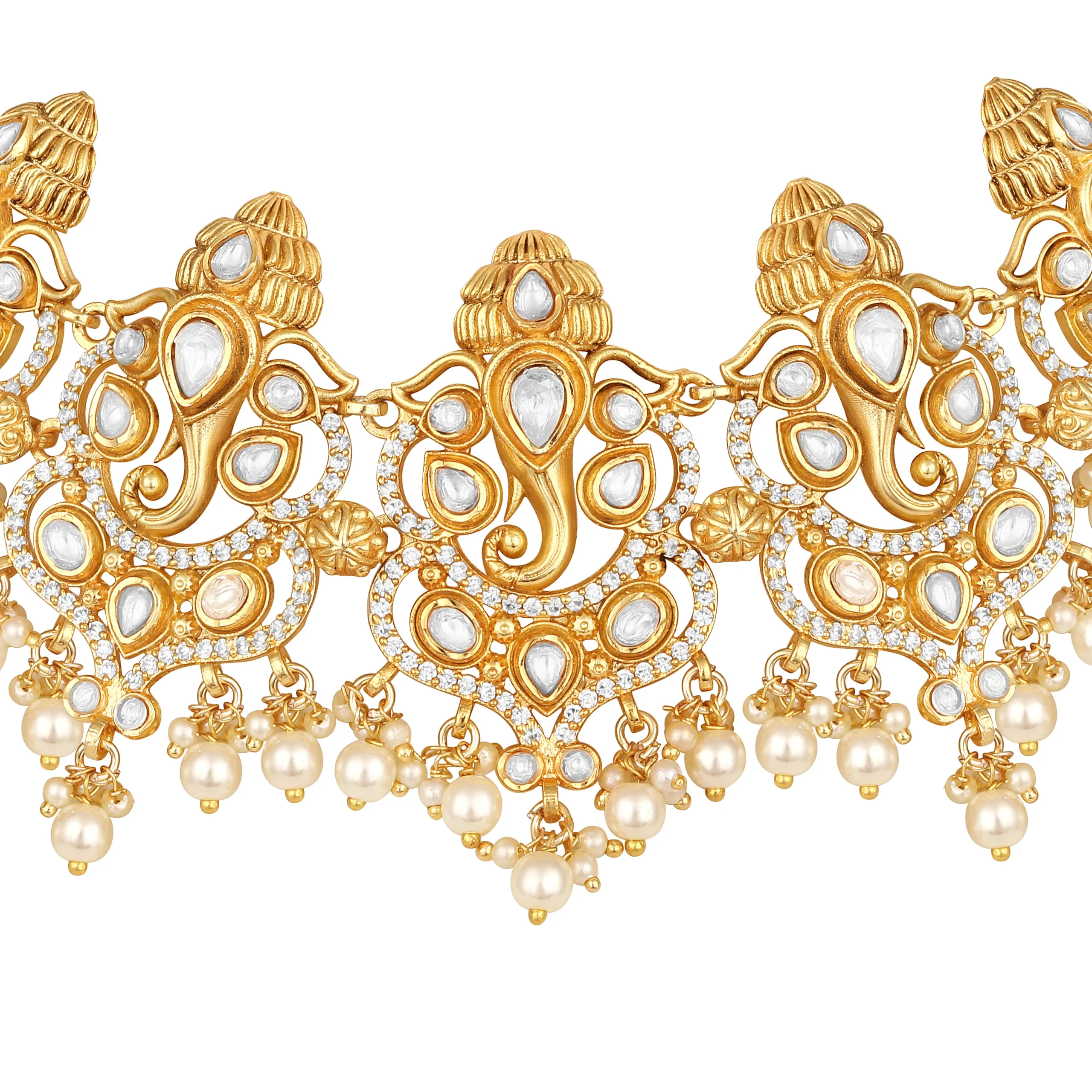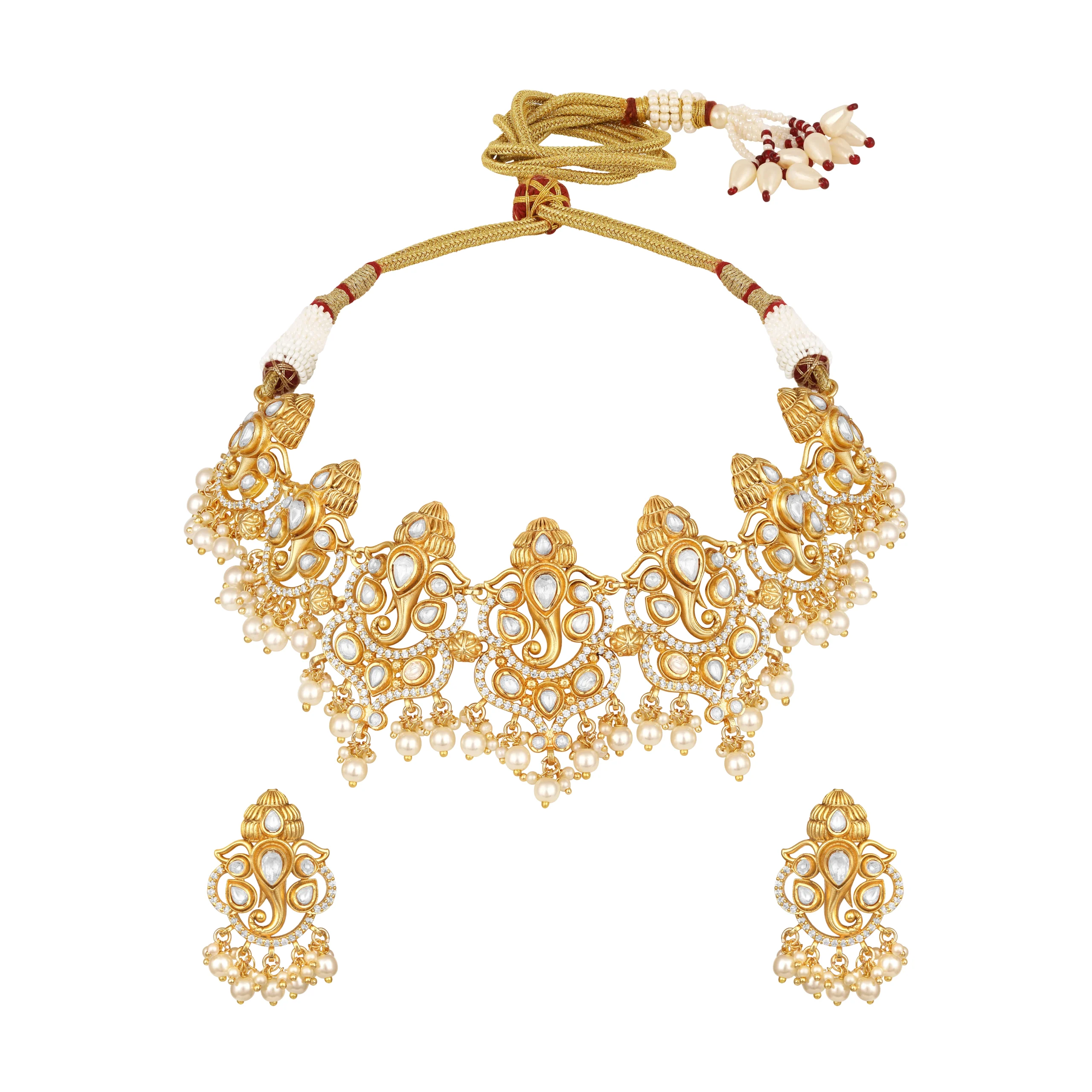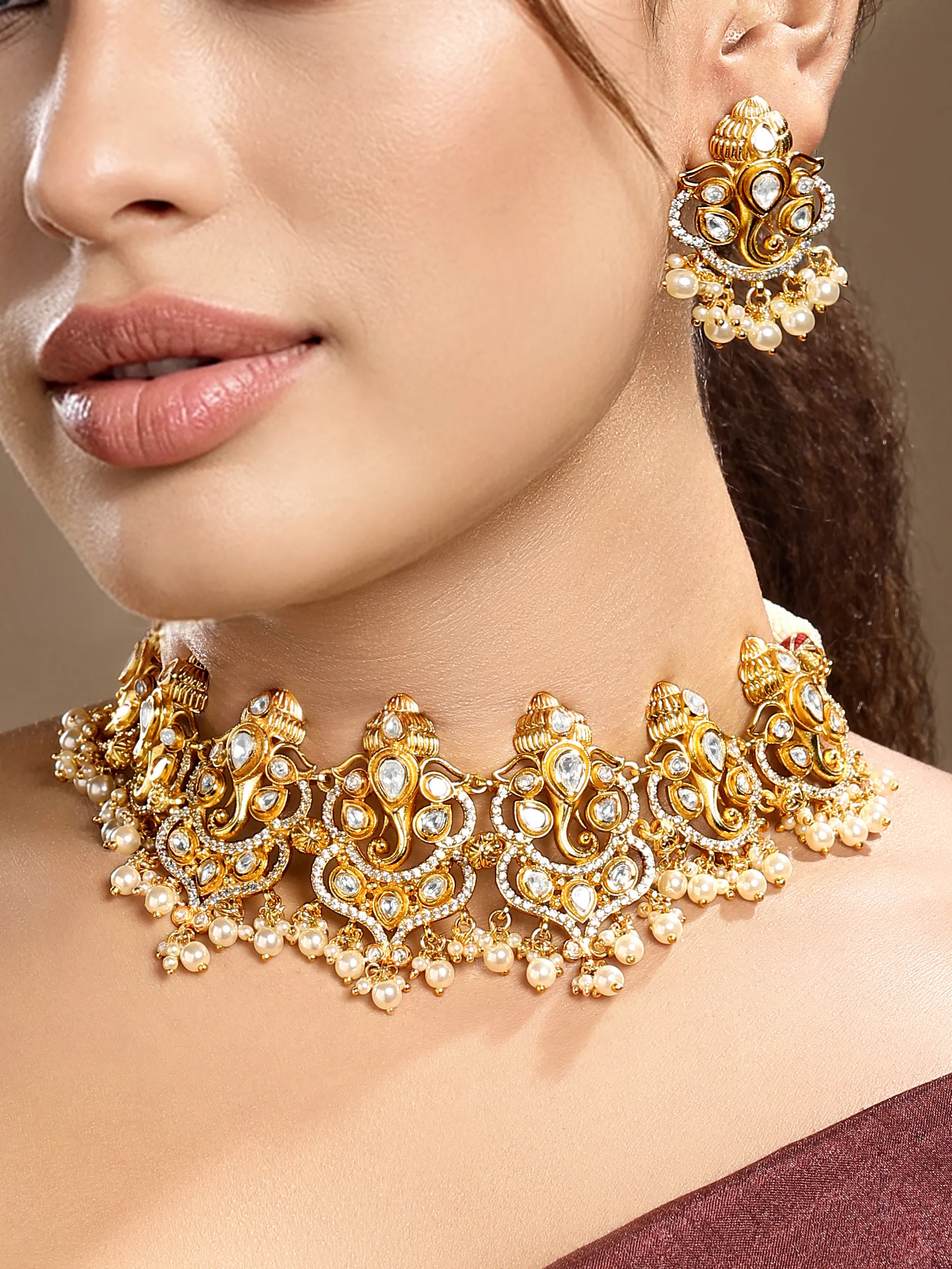Pair this sophisticated necklace set with a silk saree, embroidered lehenga, or classic anarkali to enhance its elegant gold and cream tones. For a refined contemporary look, style it with an Indo-western ensemble or a structured evening gown to let the shell pearls and polki detailing shine.