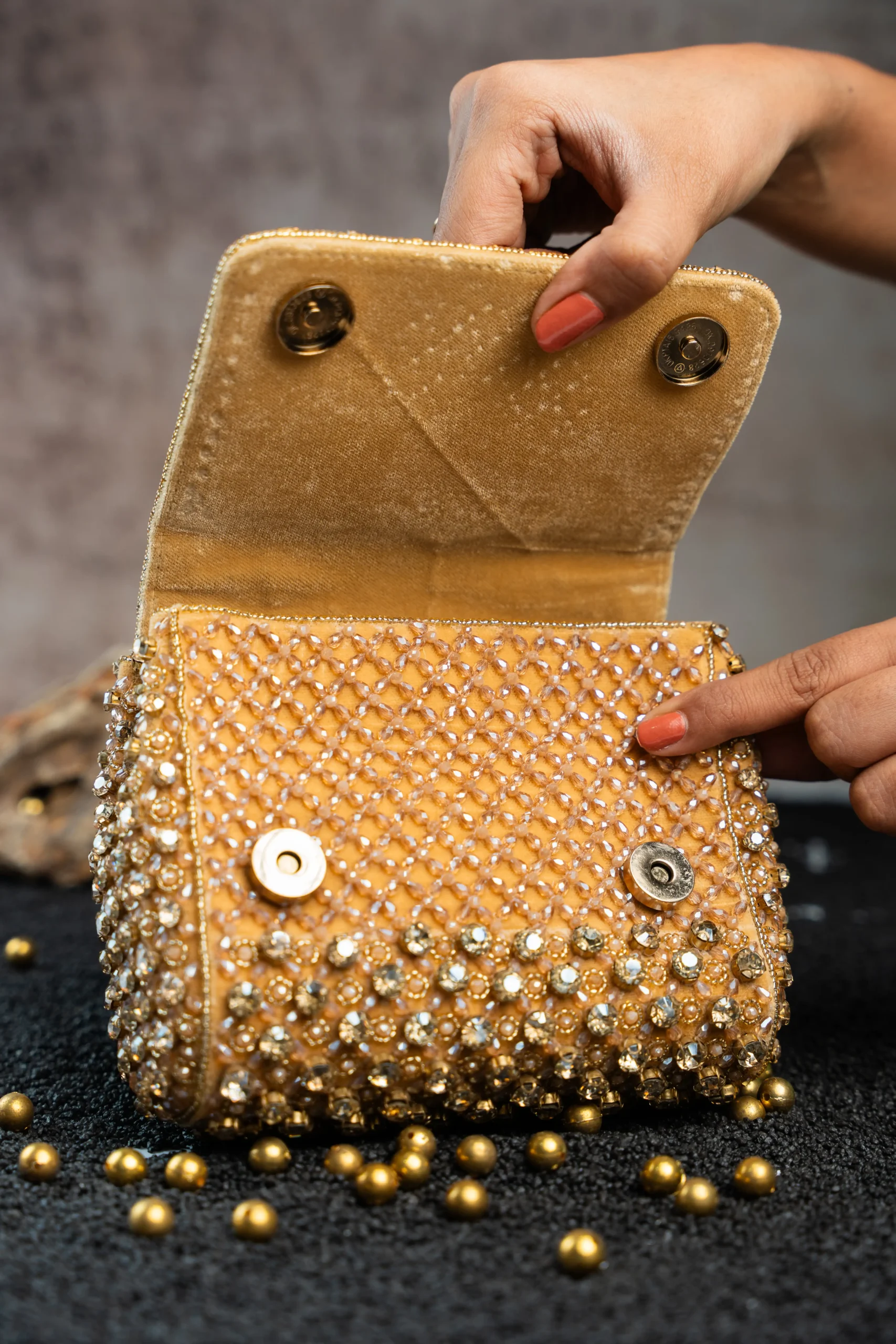 Gold Crystal Beaded Mini Bag with Dazzling Beaded Handle and Luxe Finish