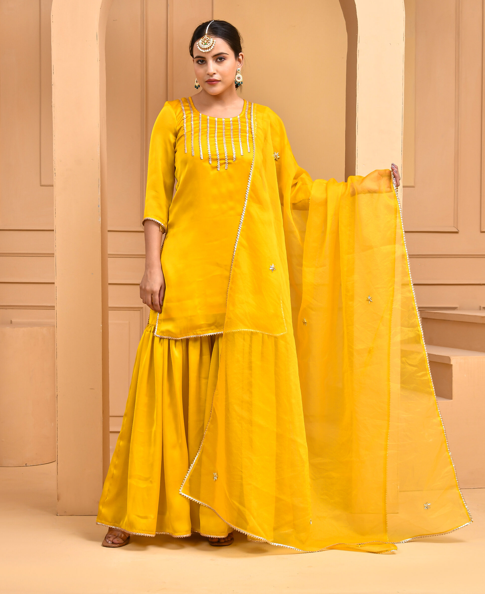 Radiating refined elegance, this gold dust sharara set is expertly crafted from luxurious satin silk that drapes beautifully with a soft, luminous finish. The ensemble features fluid sharara pants paired with an intricately patterned kurta, creating a graceful balance of structure and movement. Finished with delicate detailing and a coordinating dupatta, this sophisticated set is designed to elevate festive occasions, celebrations, and elegant evening gatherings.