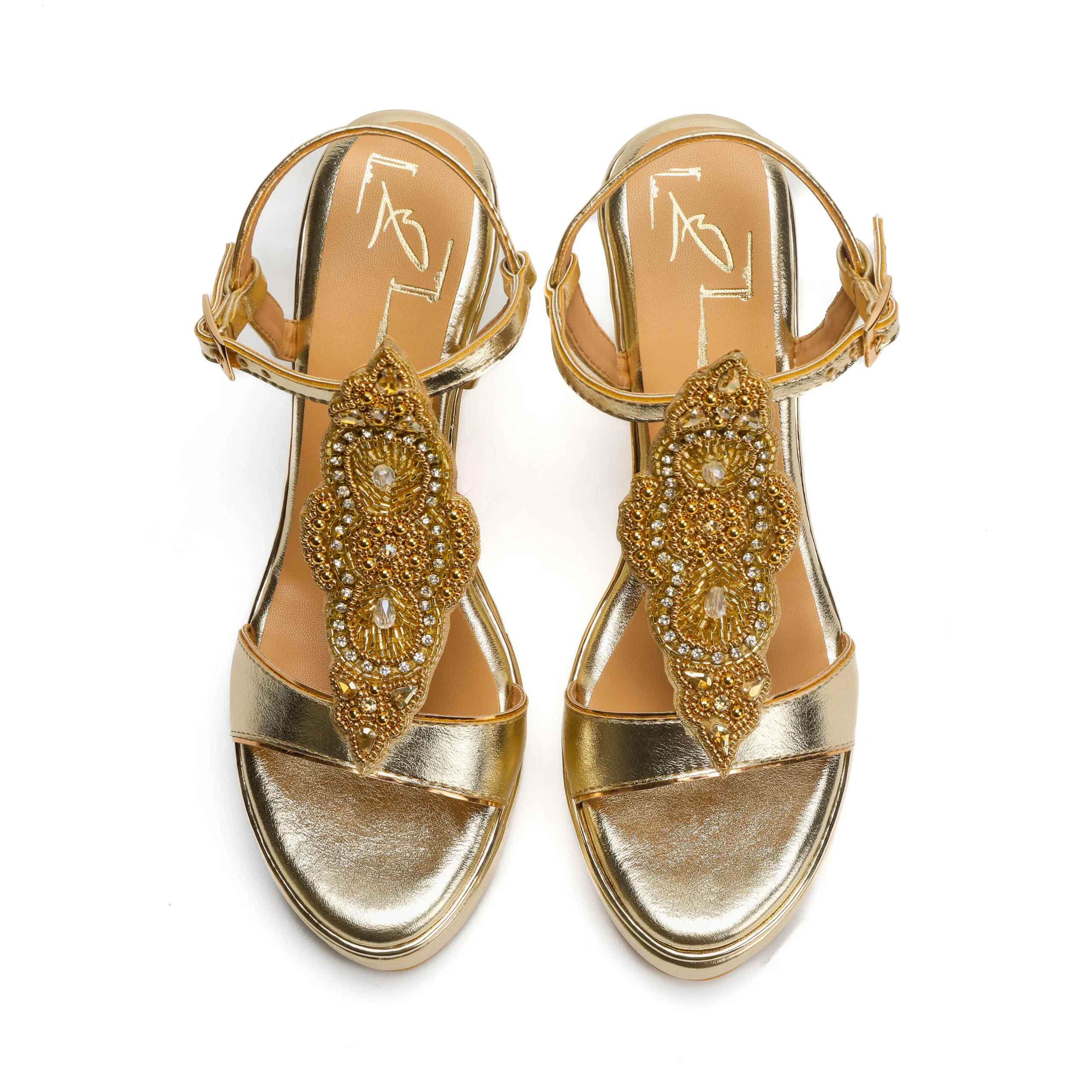 Featuring a pair of gold wedges in faux leather base embroidery. It has a gel cushioning, faux leather under lining and 3.5-inch heels. Elevate your stride with timeless elegance and exceptional craftsmanship, perfect for any festive occasion or wedding ceremonies.