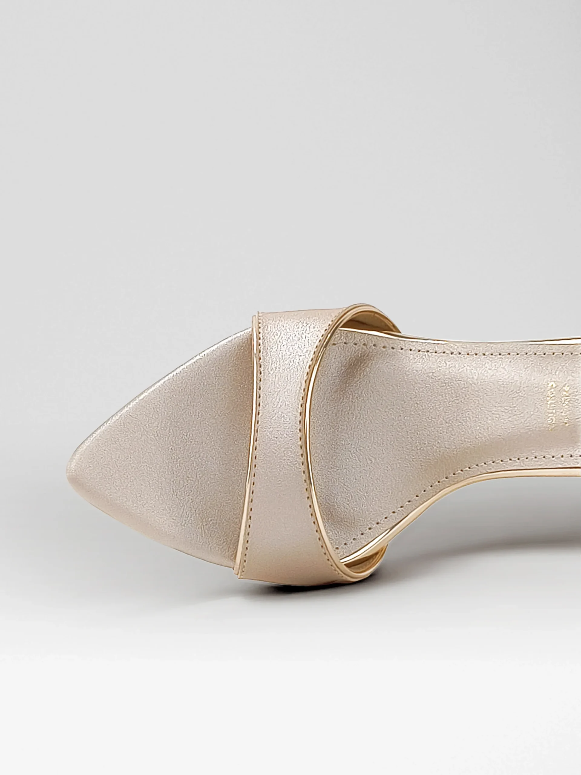 Craft : Pearl-nude wide strap | Mirror gold piping and slingback | Sculptural heelsMaterial : Faux leatherWork of : 32 Hours