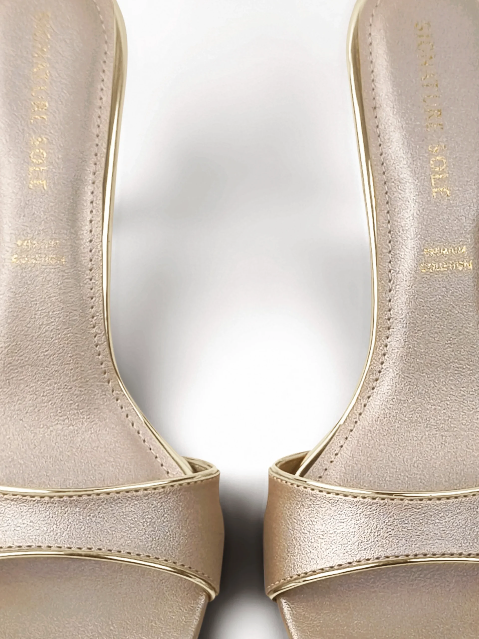Featuring pearl-nude wide strap with mirror gold piping and slingback along with sculptural heels in faux leather, this Gold Heels Mule offers luxurious contrast.