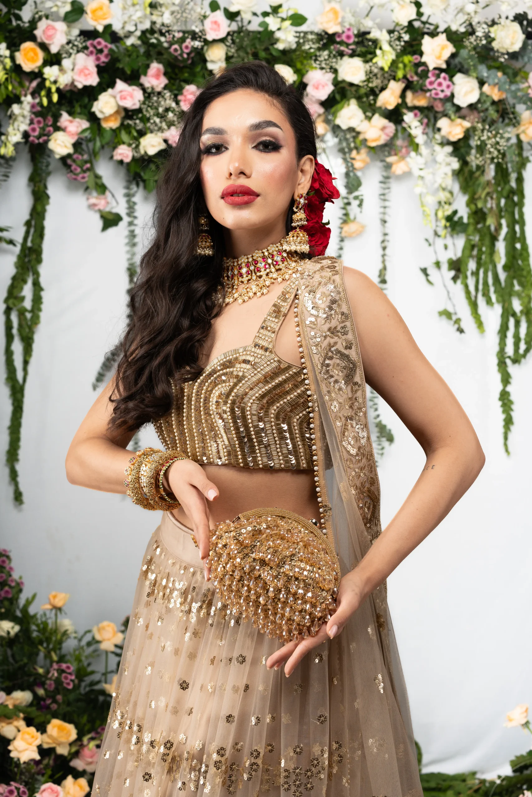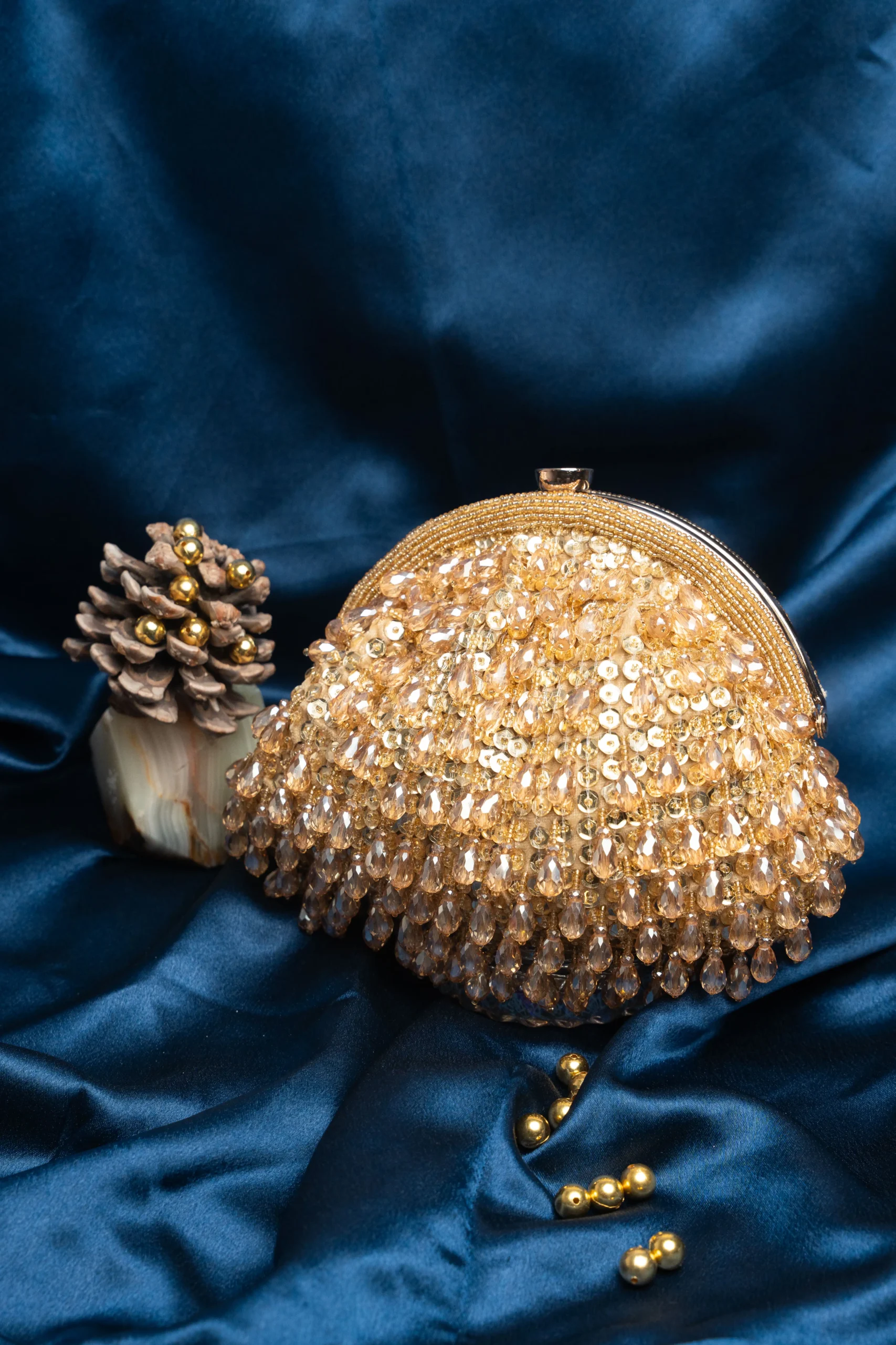 Introducing a voguish clutch adorned with elegant gold jewel embellishments that add radiant charm and movement. Finished with a subtle sequinned frame for a touch of shimmer, this stylish accessory blends timeless glamour with modern sophistication, making it perfect for weddings, festive celebrations, and evening occasions.