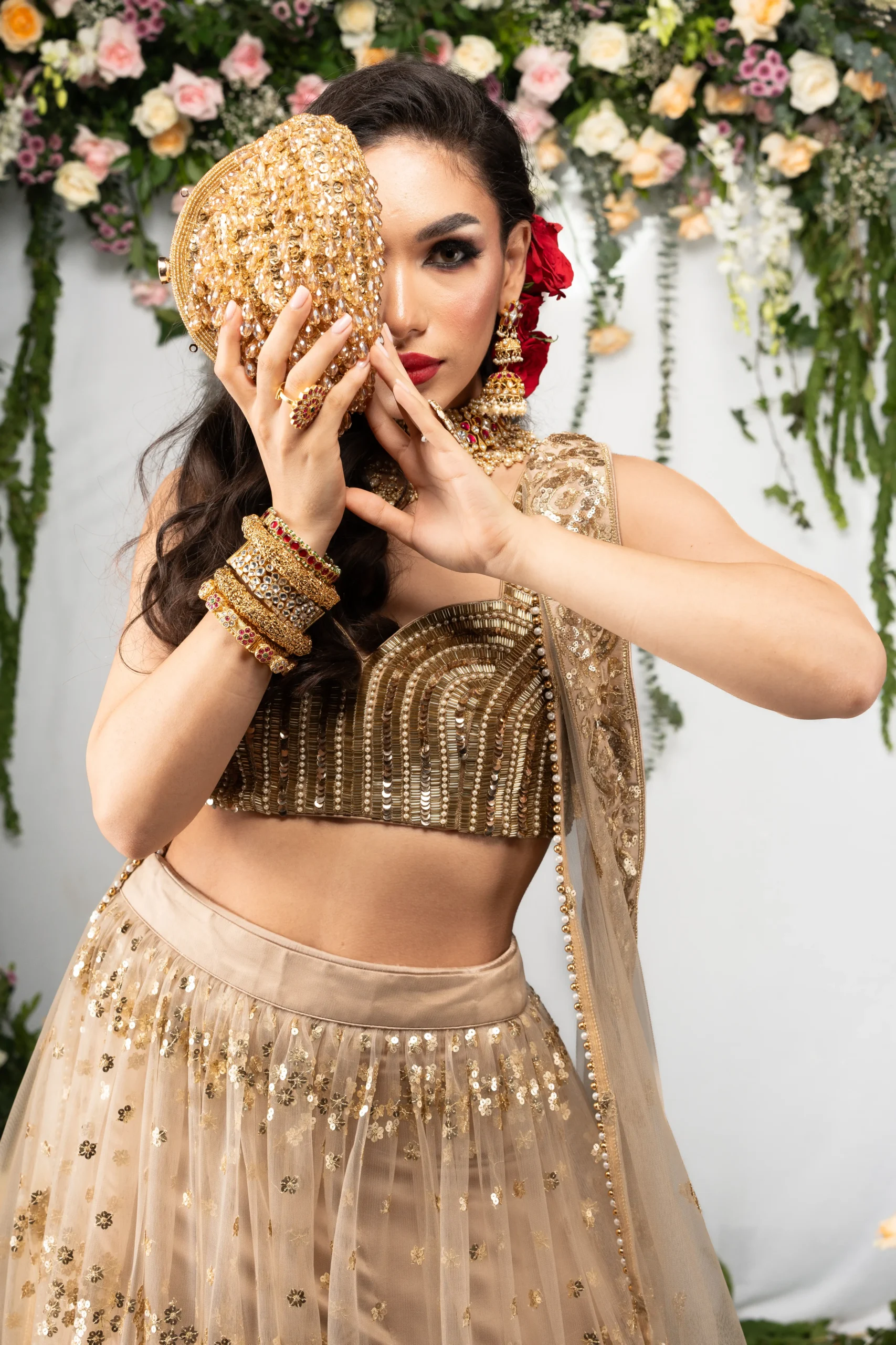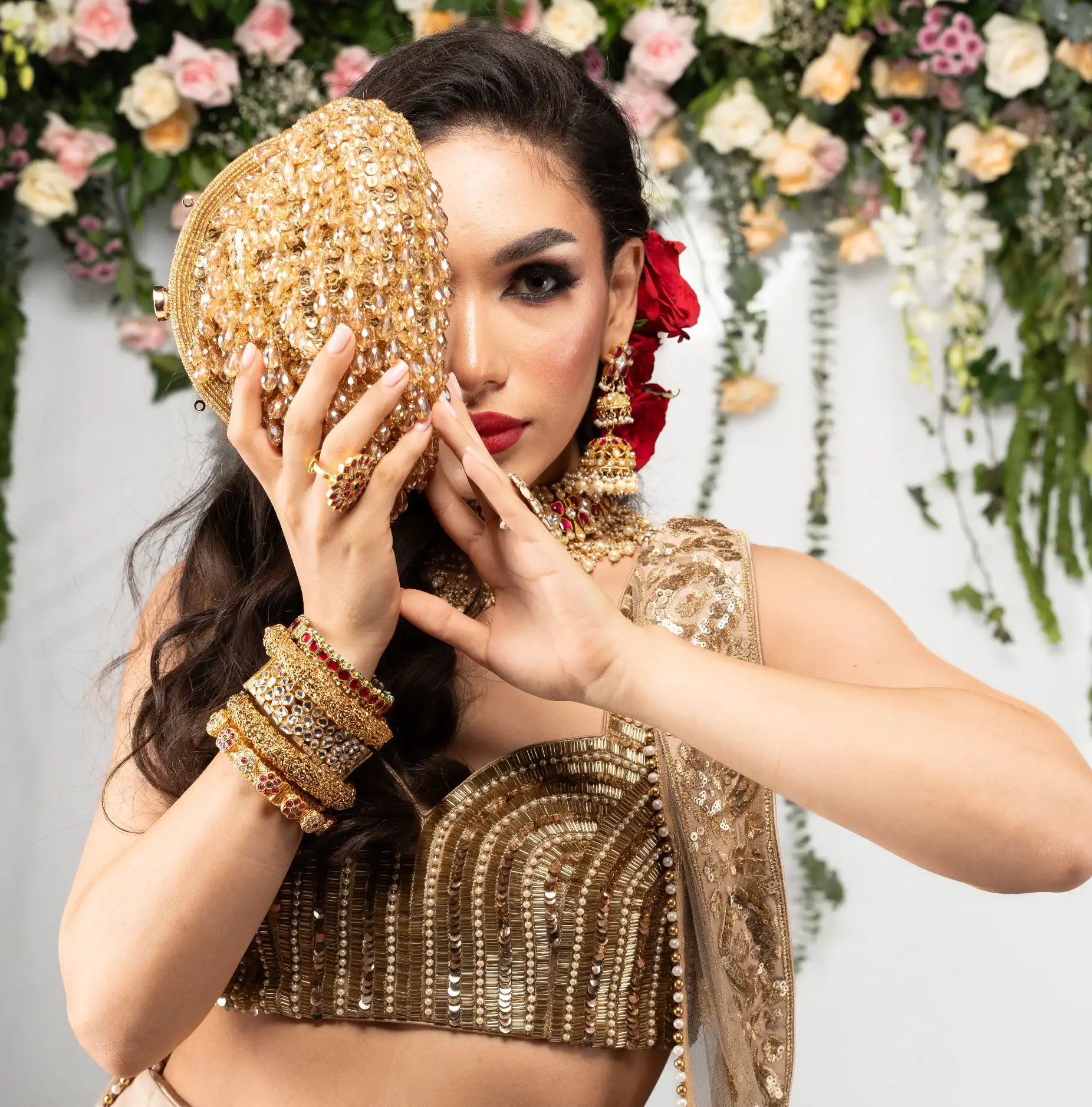 Style this gold jewel embellished clutch with embroidered sarees, festive lehengas, or elegant anarkali sets for weddings and celebrations. Pair it with gold jewelry, metallic heels, and soft glam makeup to highlight the jewel detailing and sequinned frame for a refined, glamorous statement.