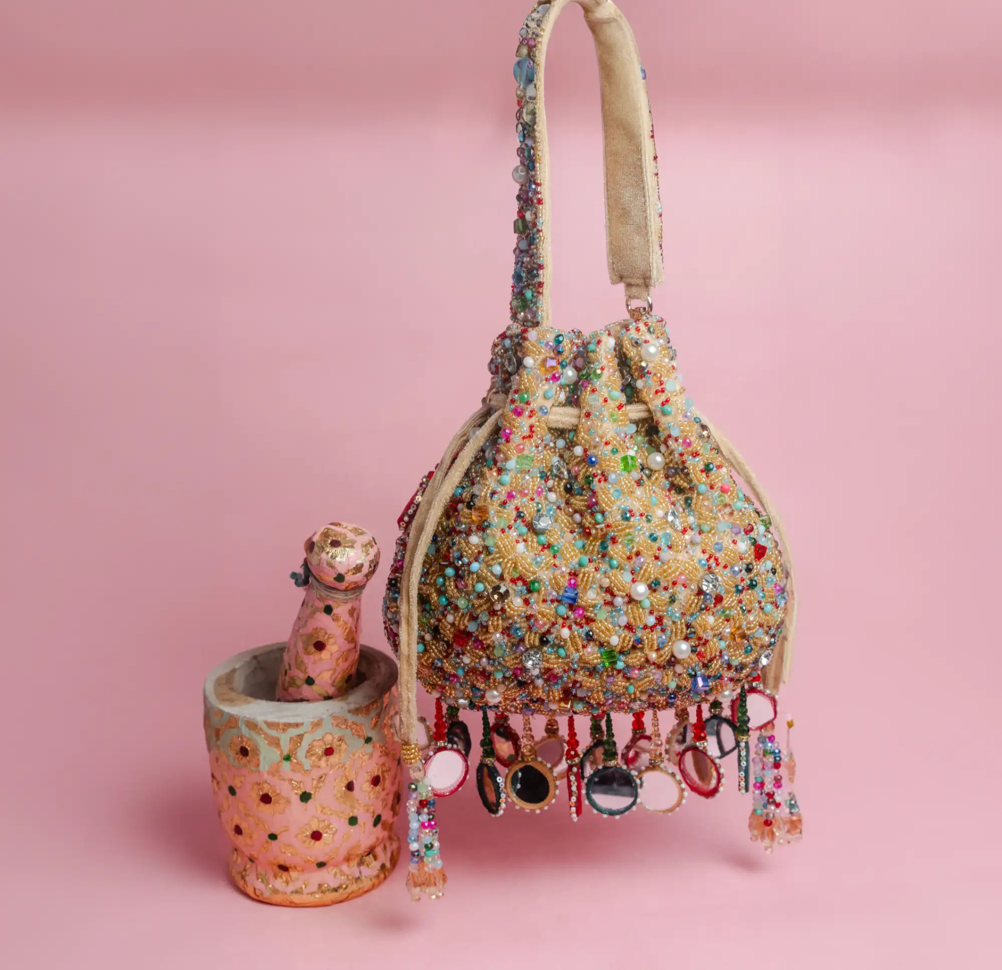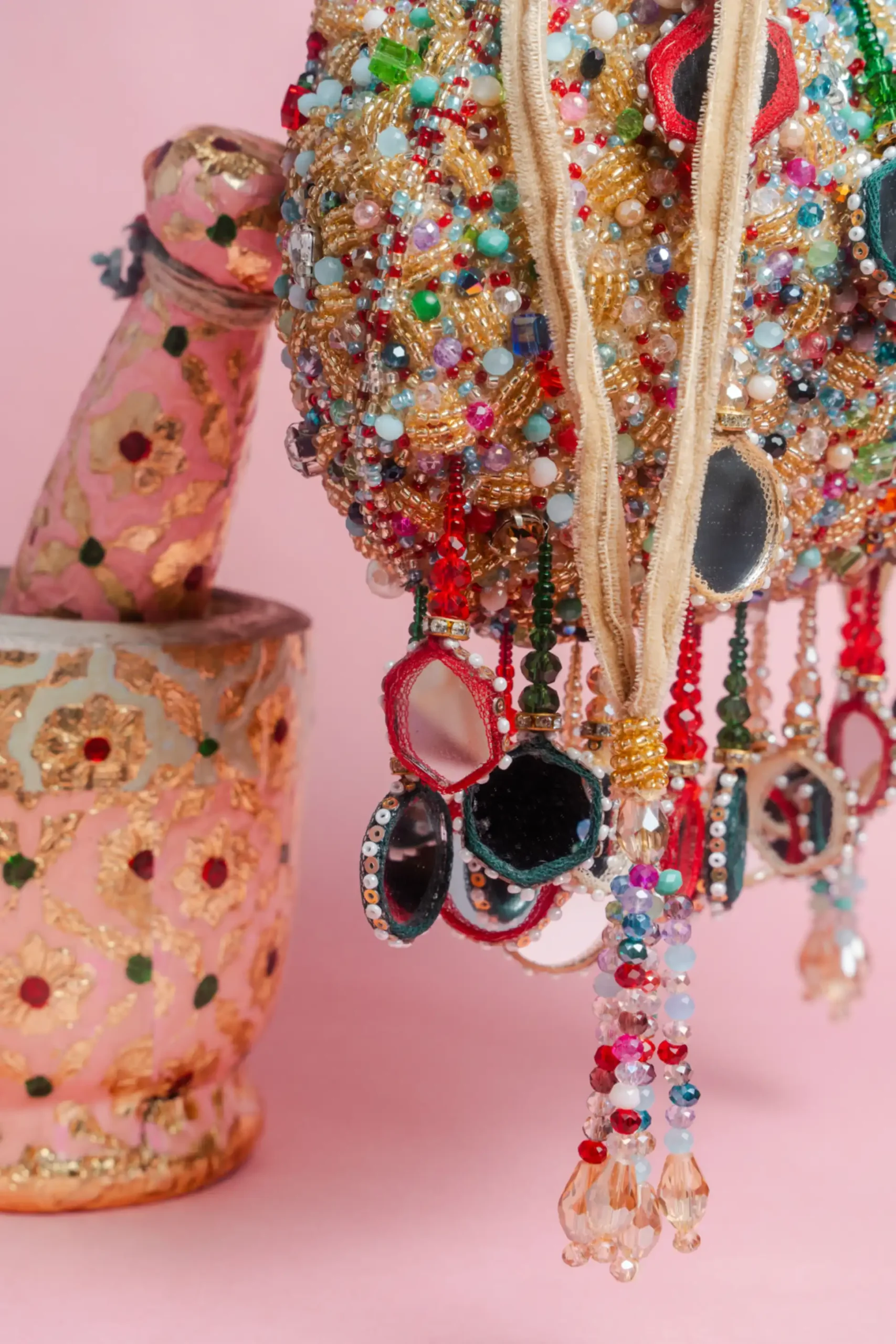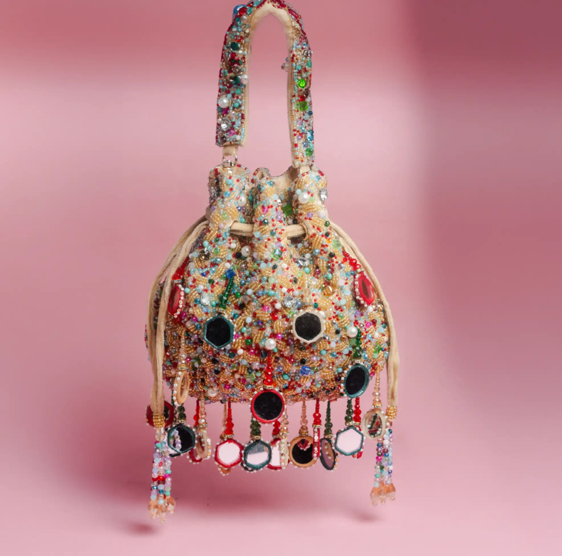 Gold Mirror and Multicolor Beaded Potli with Tassels and Festive Charm
