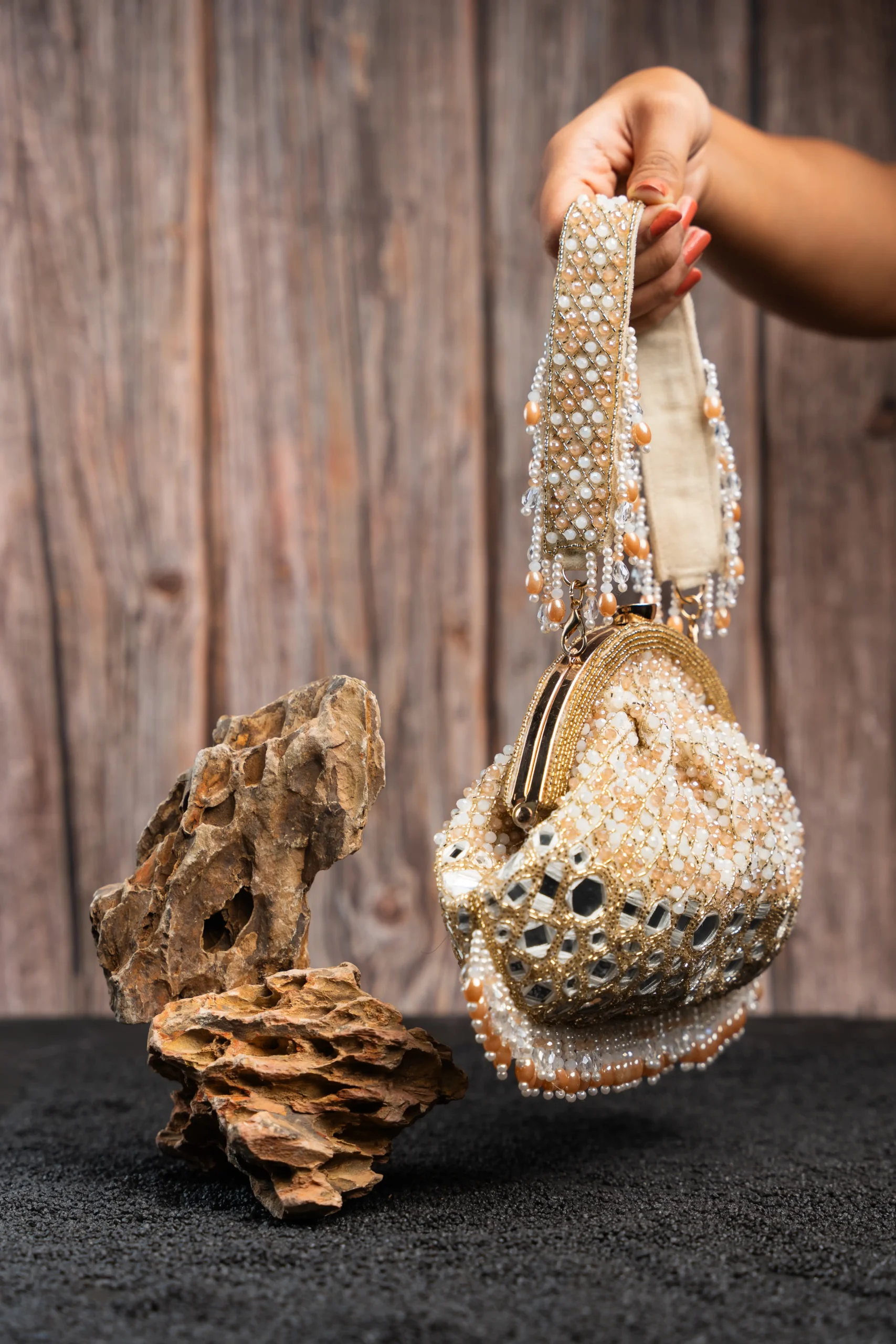 Gold Mirror, Pearl & Beaded Clutch with Elegant Embellished Finish