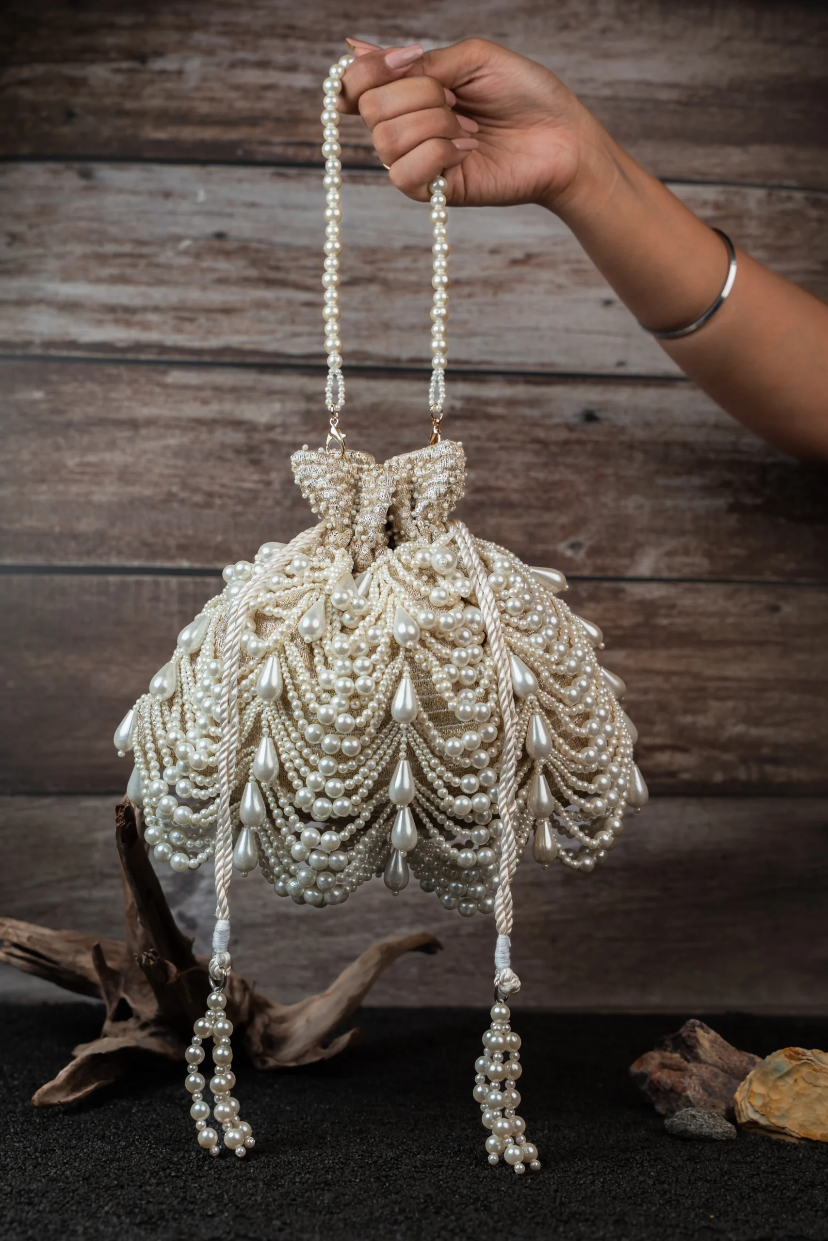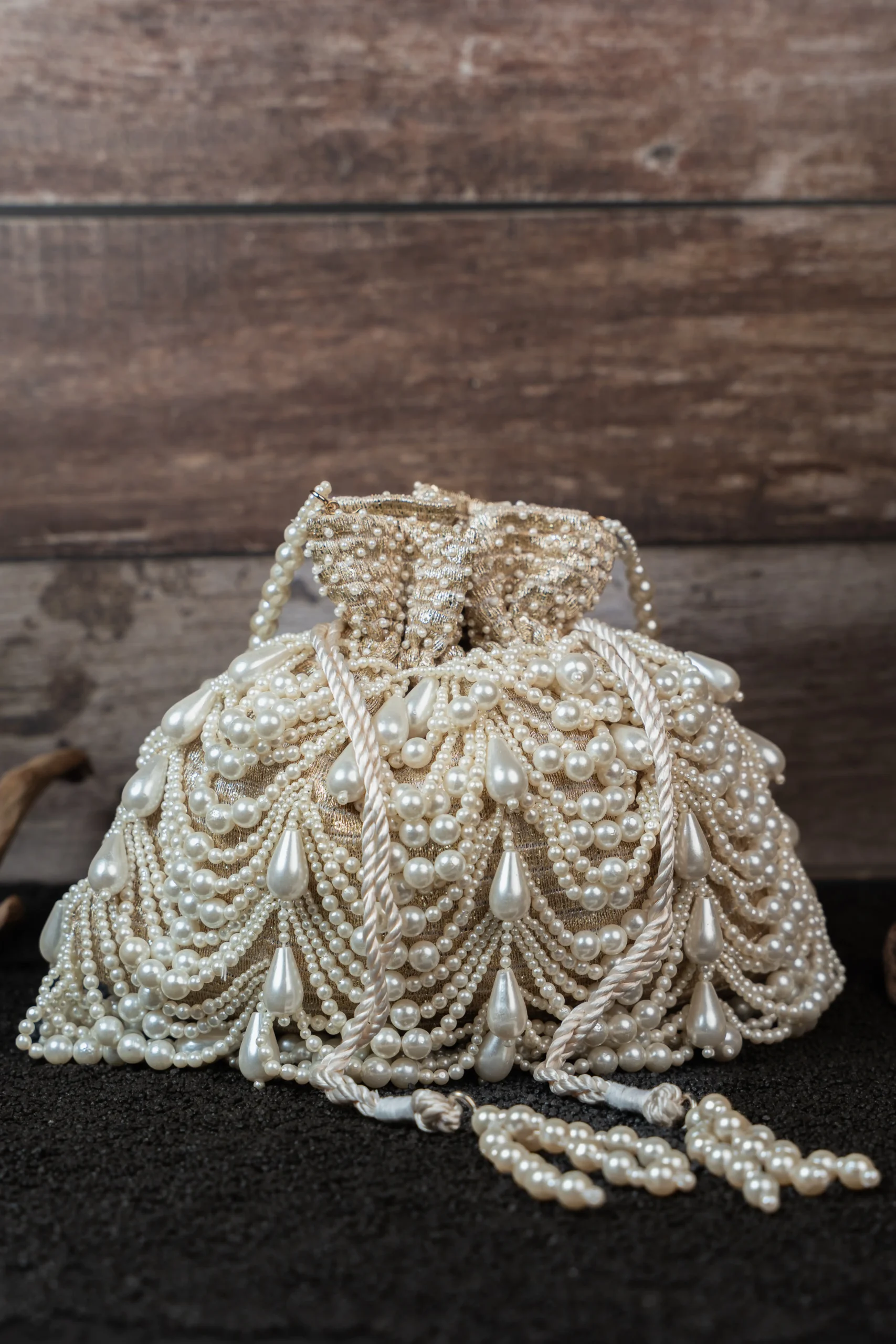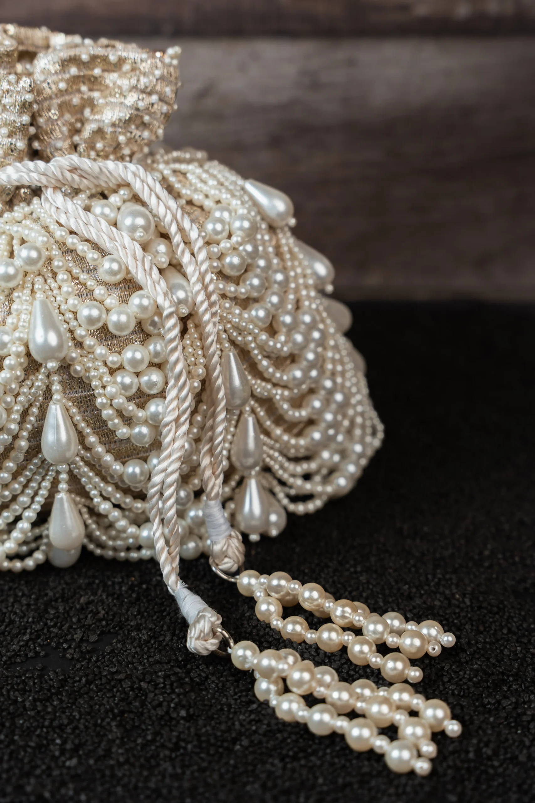 Gold Oyster Pearl Potli Bag with Layered Pearls and Tassel Drawstring Detail