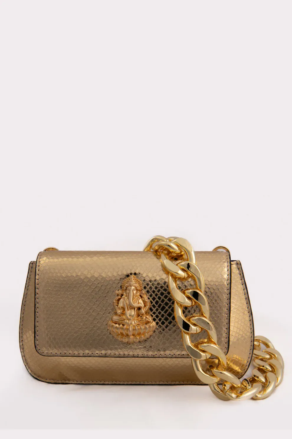 Experience opulent design with this bag. This bag is your passport to effortless style, designed for the discerning individual. Experience radiant elegance with this gold-plated rectangle-shaped clutch with a textured pattern & Ganpati carved brooch in the center. Comes with a detachable sling. A masterpiece of modern design, this accessory is sure to turn heads. It features metal embellished, complemented by standard fittings. The bag is secured with a magnet button.