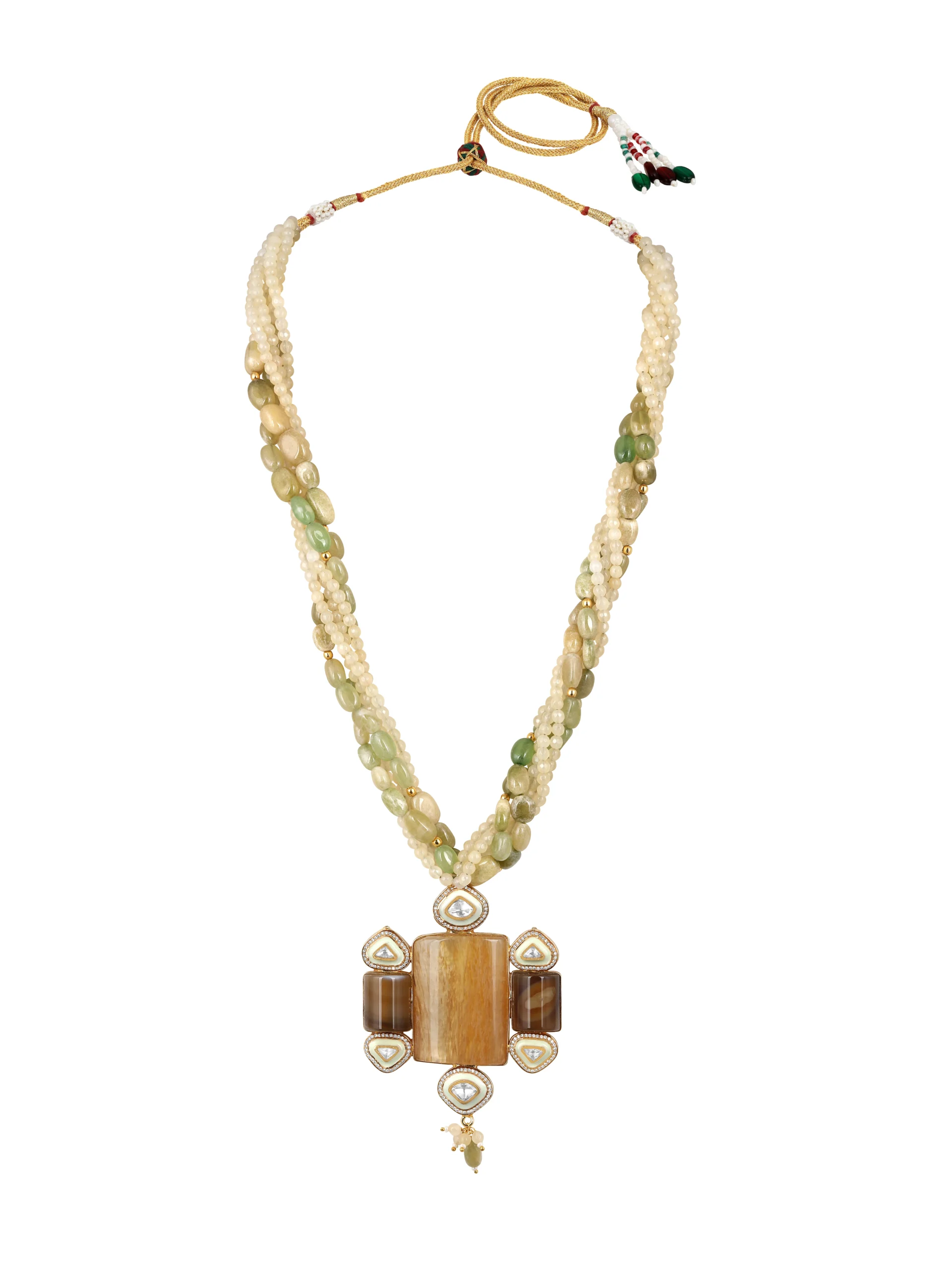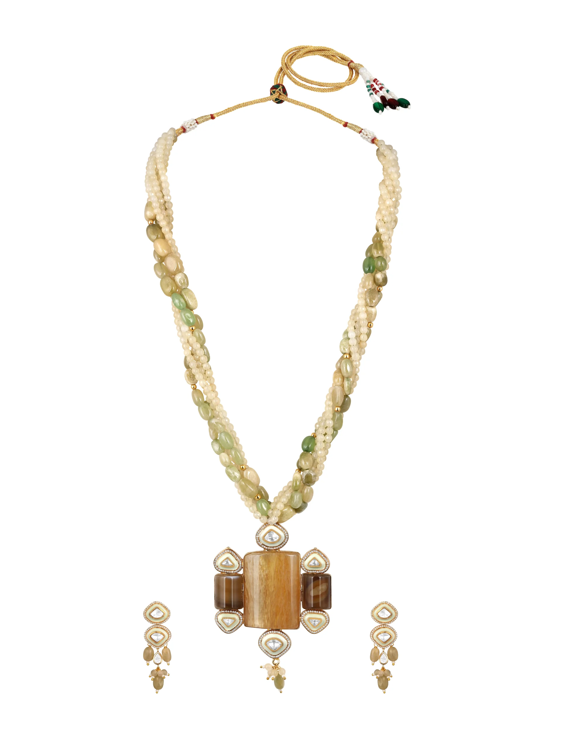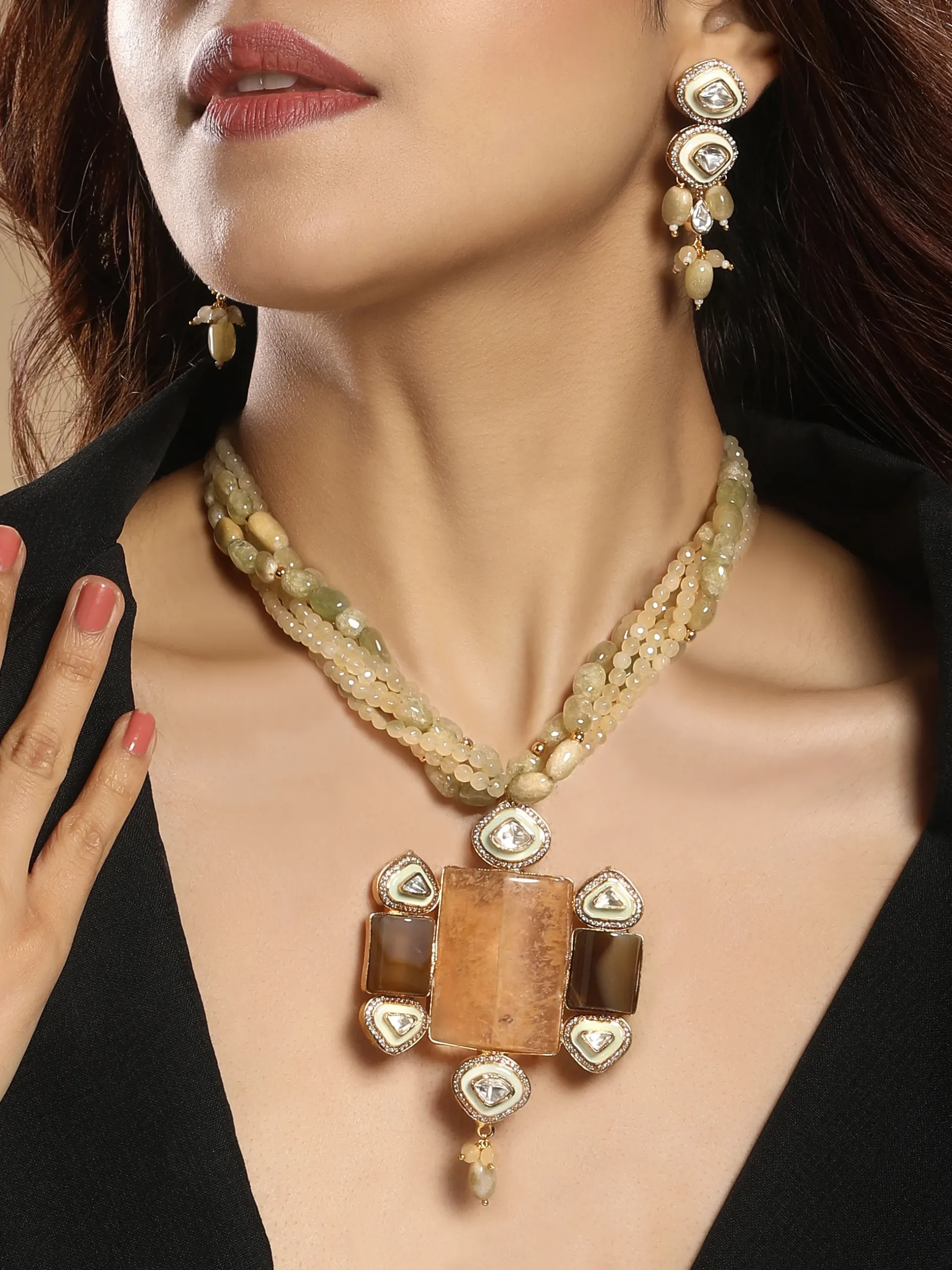 Style this statement necklace set with a silk saree, embellished lehenga, or anarkali for weddings and festive celebrations to highlight its rich gold polish and intricate enamel work. For a contemporary fusion look, pair it with a structured Indo-western outfit or a solid gown to let the moissanite polki and agate tumbles stand out.