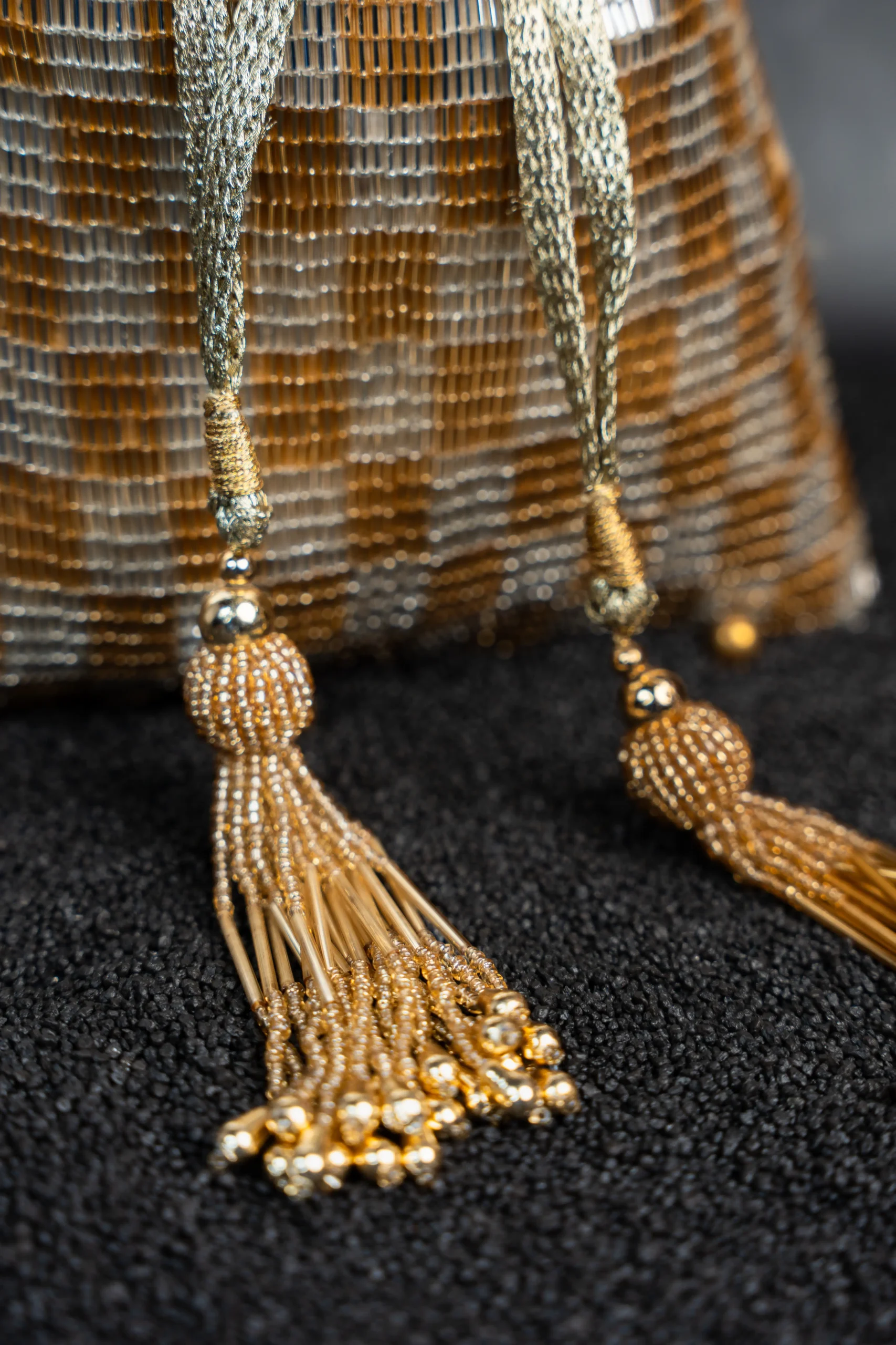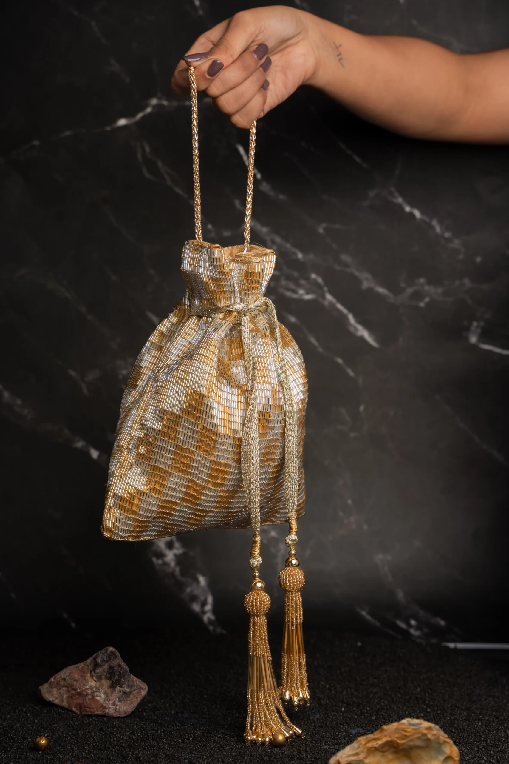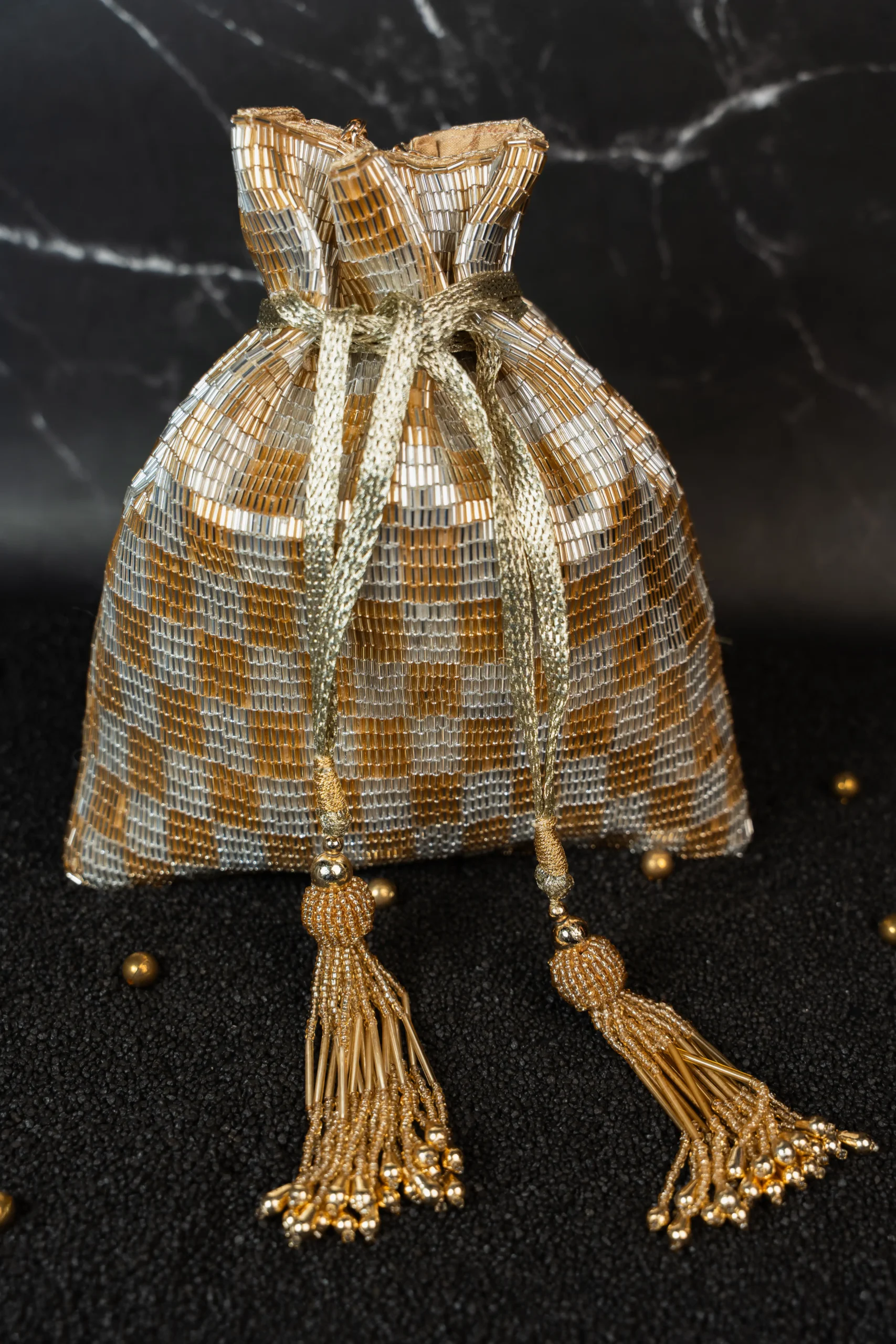 Introducing a beautifully crafted gold and silver dual-tone tube beaded potli bag that blends refined elegance with intricate craftsmanship. Designed on a striking dual-tone base, it features delicate tube beadwork arranged in a structured geometric pattern that creates depth and dimension. The harmonious mix of gold and silver hues reflects light beautifully, adding warmth and subtle shine. Perfect for weddings, festive celebrations, and evening occasions, this versatile potli complements both traditional and contemporary ensembles.