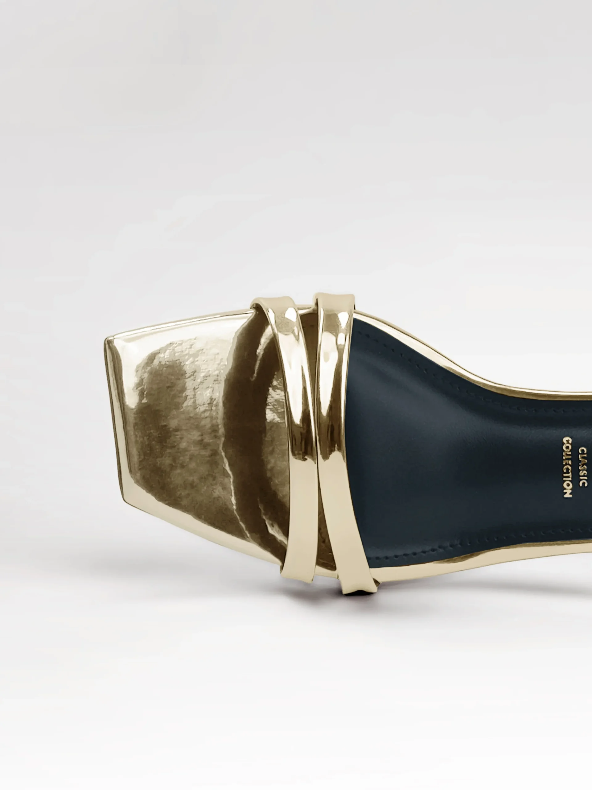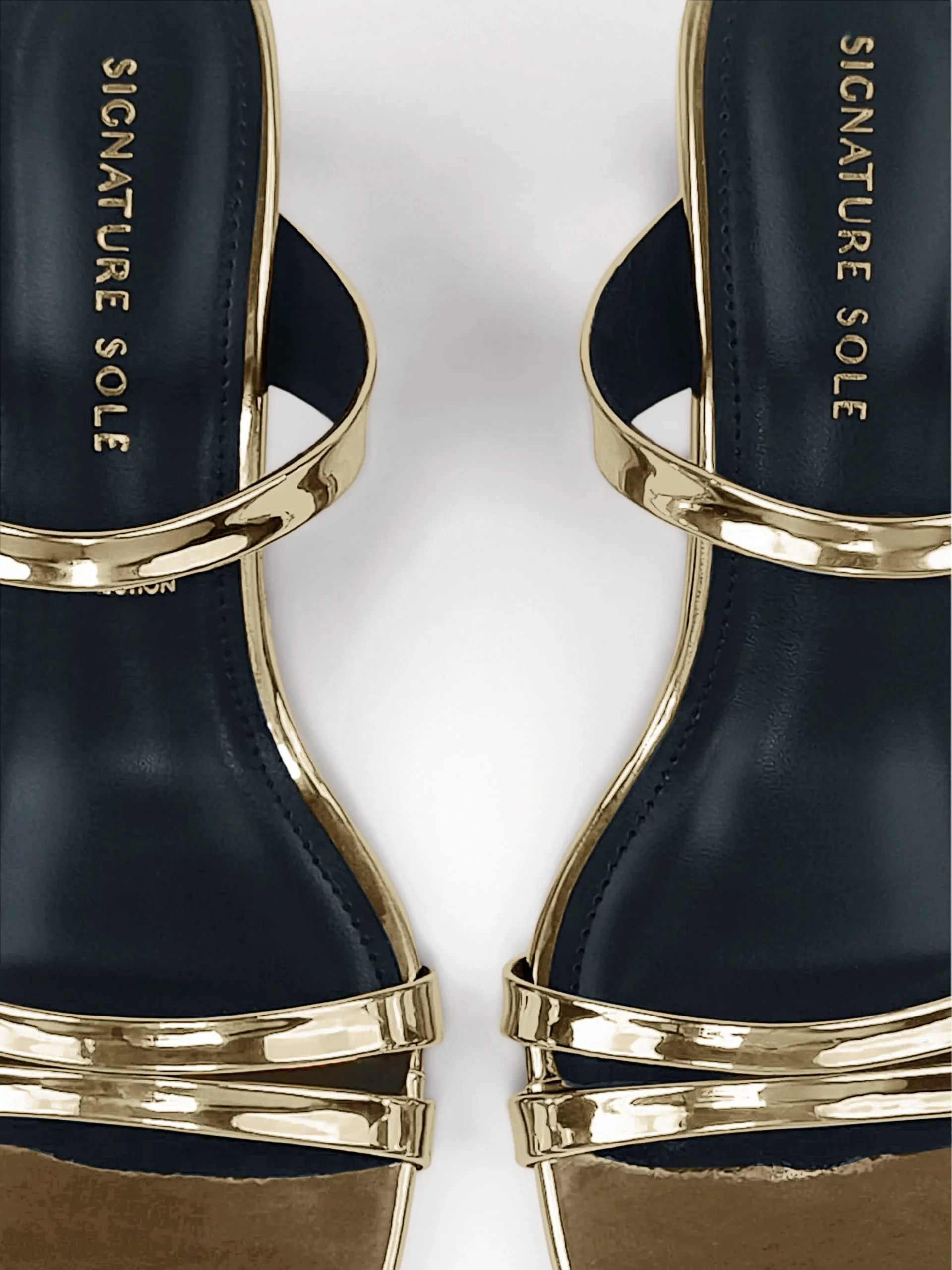 Featuring two polished gold straps on black body with architectural construction in metallic faux leather, this Gold Strap Block Heel Mule radiates luxury.