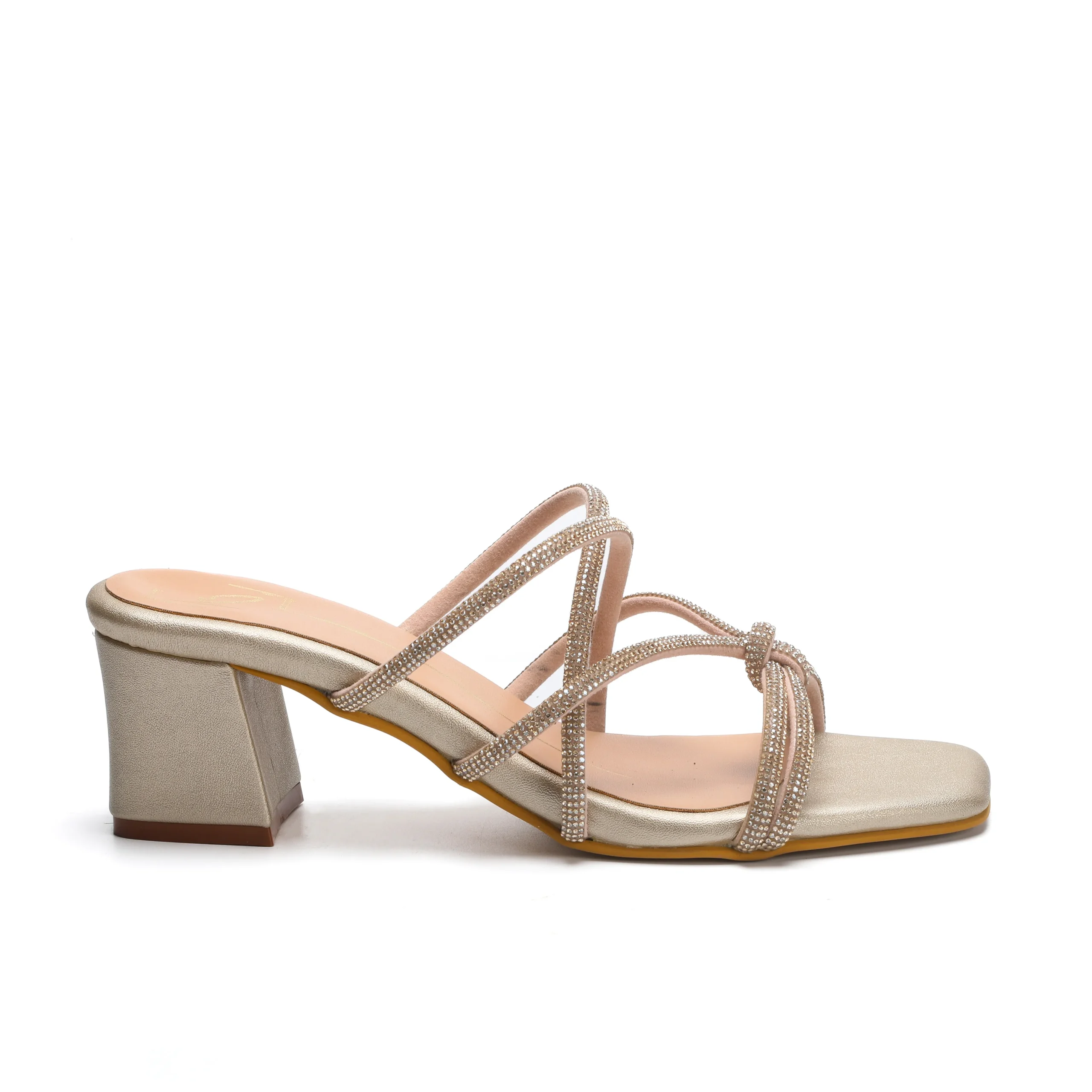 Featuring a pair of gold strappy block heels in faux leather base with swarovski detailing. It has a faux leather lining, 2.5-inch heels and gel cushioning for comfort. Pair it with any outfit to elevate your look for any special occasion.